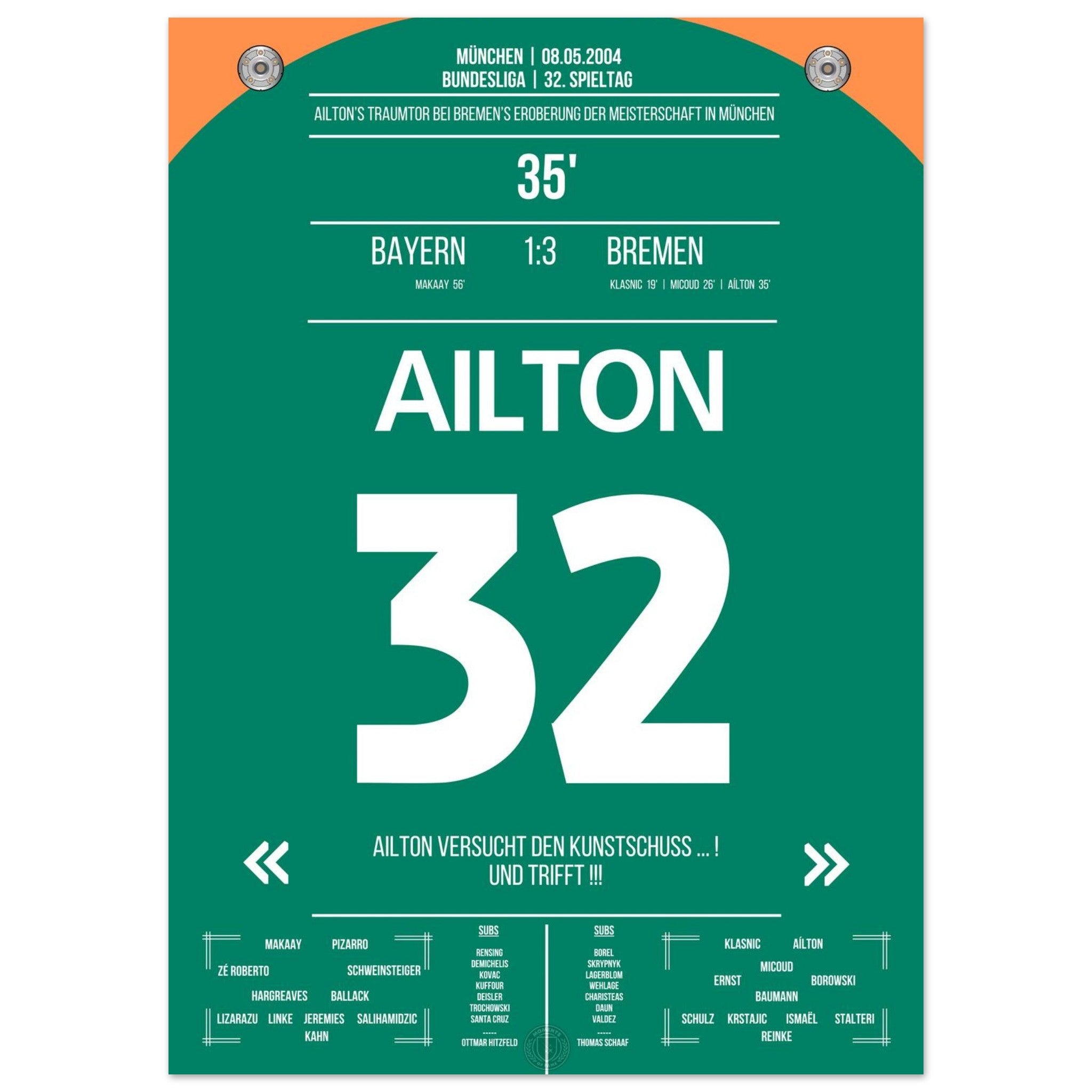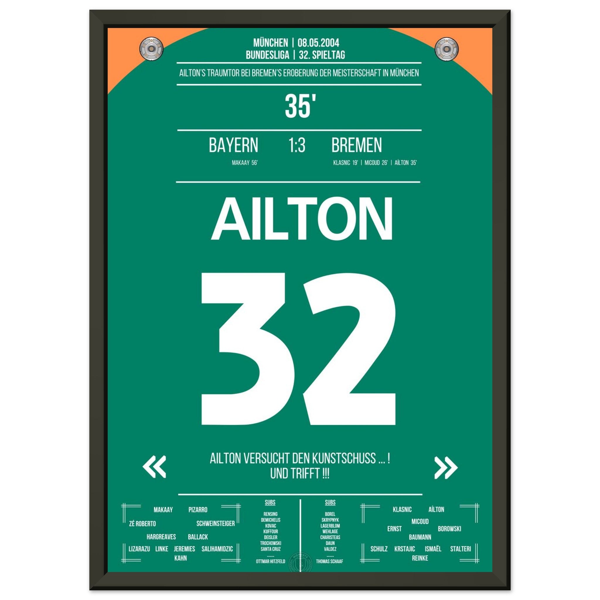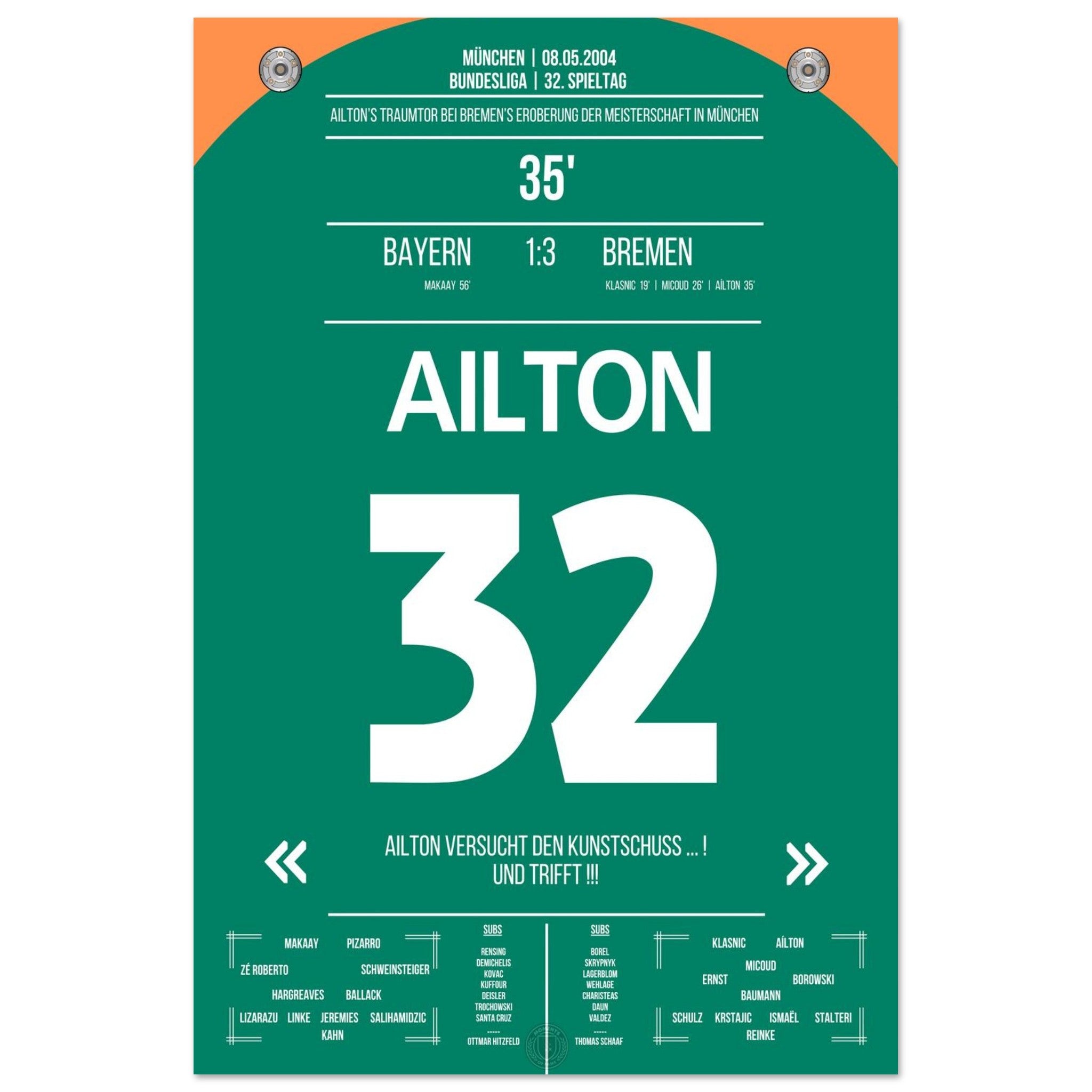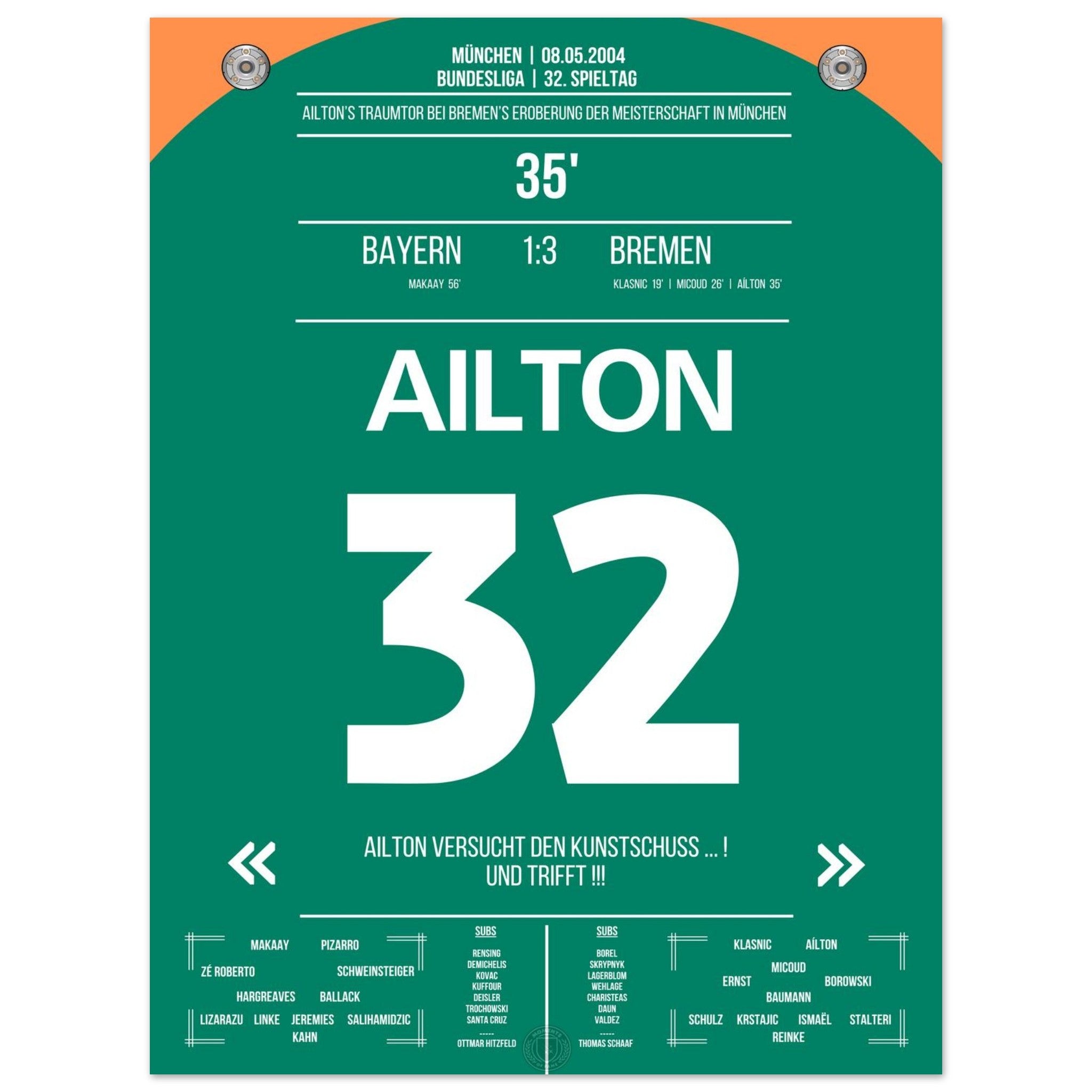 Olympiastadion. Aílton. Außenrist. 3:0. Meistermacher-Moment – jetzt als Poster für deine Wand.