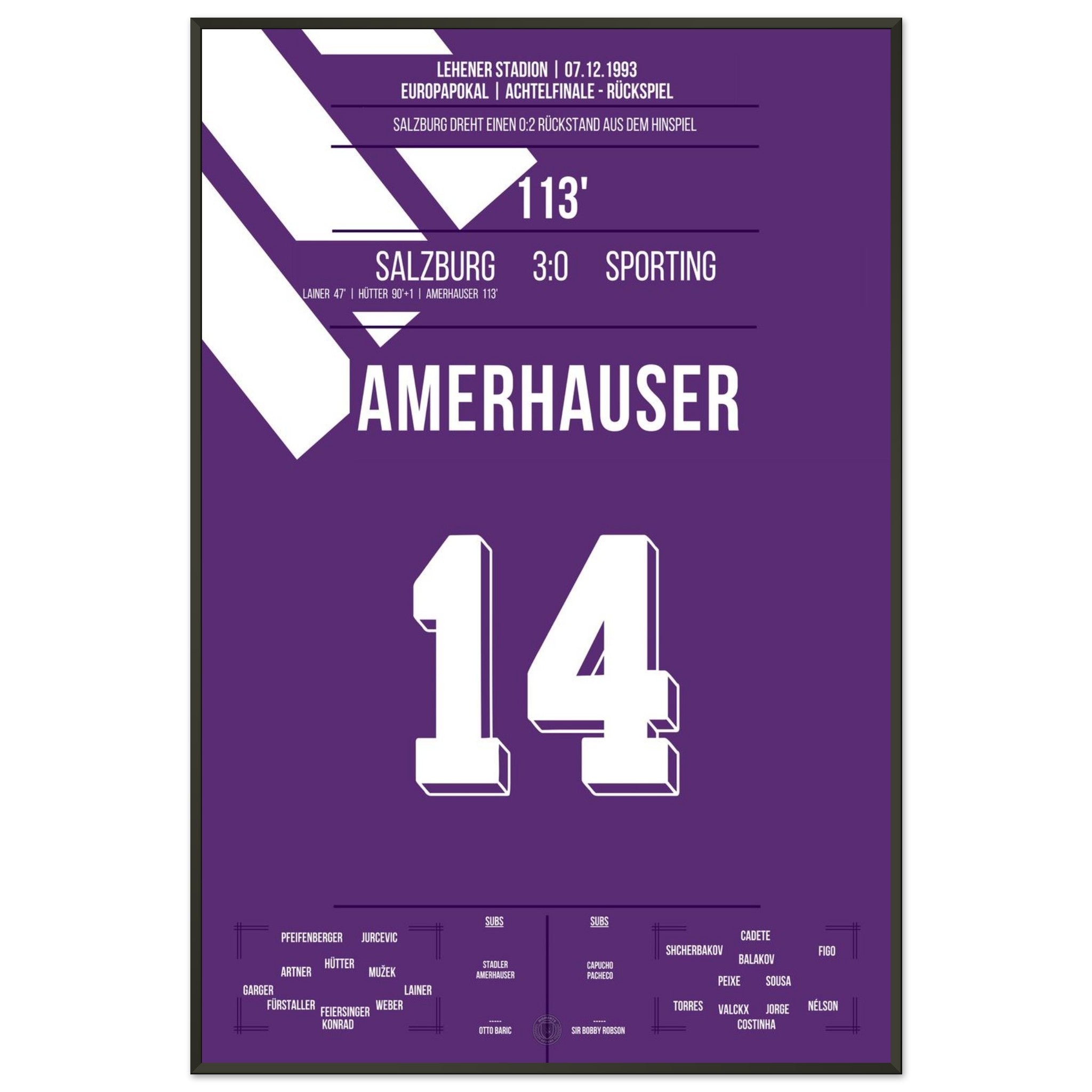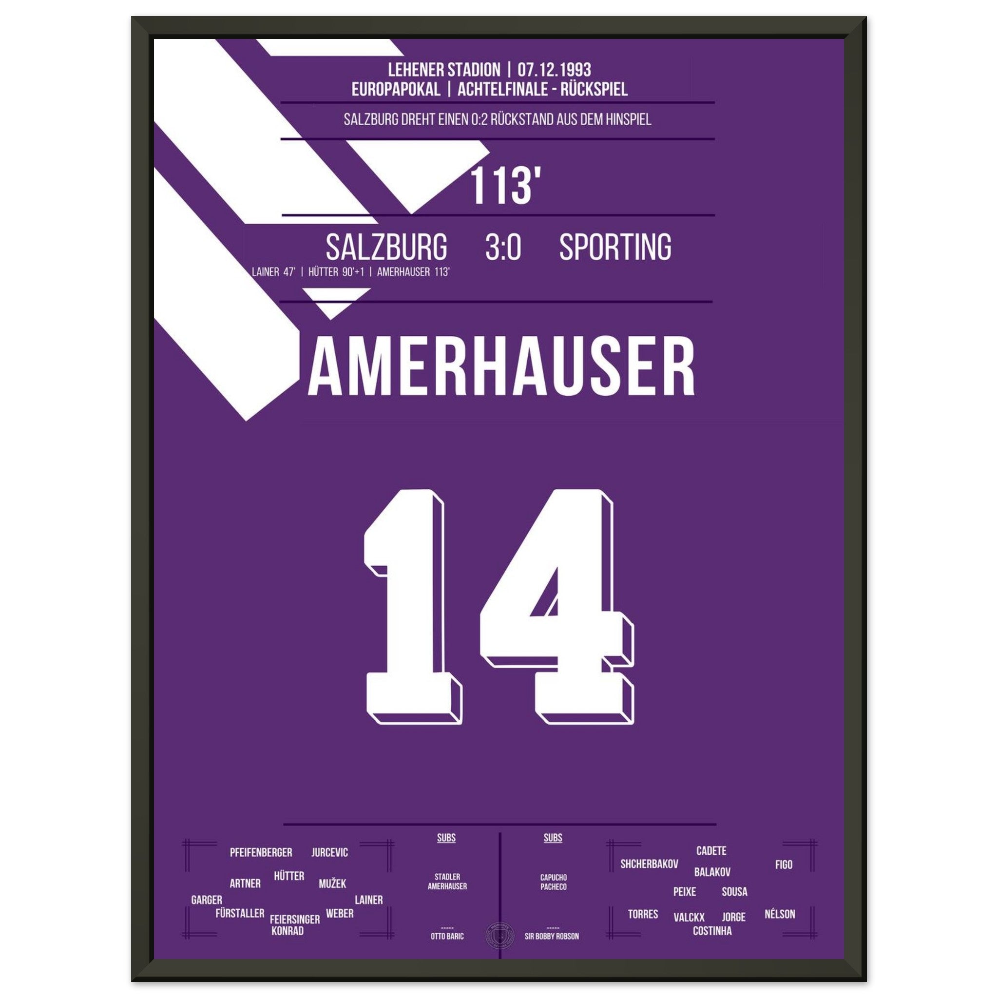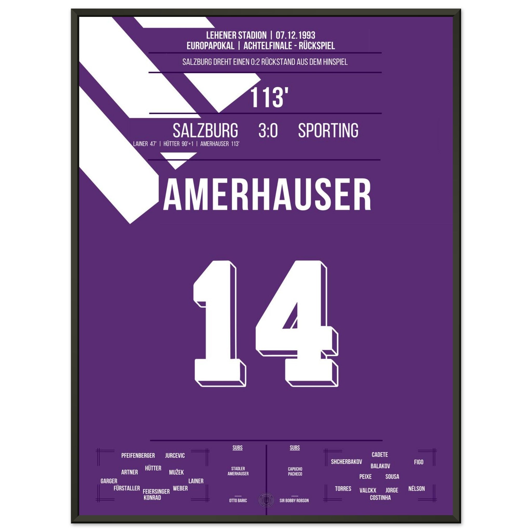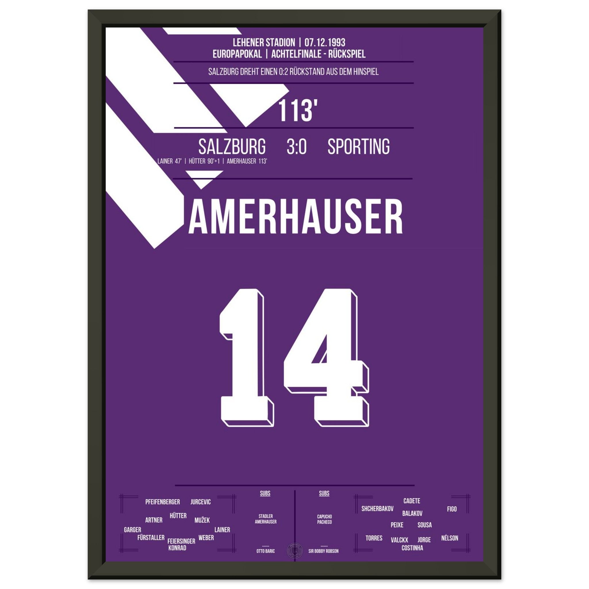 Sie können sicher sein, dass jedes Poster und jeder Rahmen in einer robusten Verpackung versandt wird, damit es in tadellosem Zustand ankommt. Es ist die perfekte Ergänzung für die Sammlung eines jeden Fußballfans oder das perfekte Geschenk für den eingefleischten Fußball-Fan ihres Freundes- oder Familienkreises.