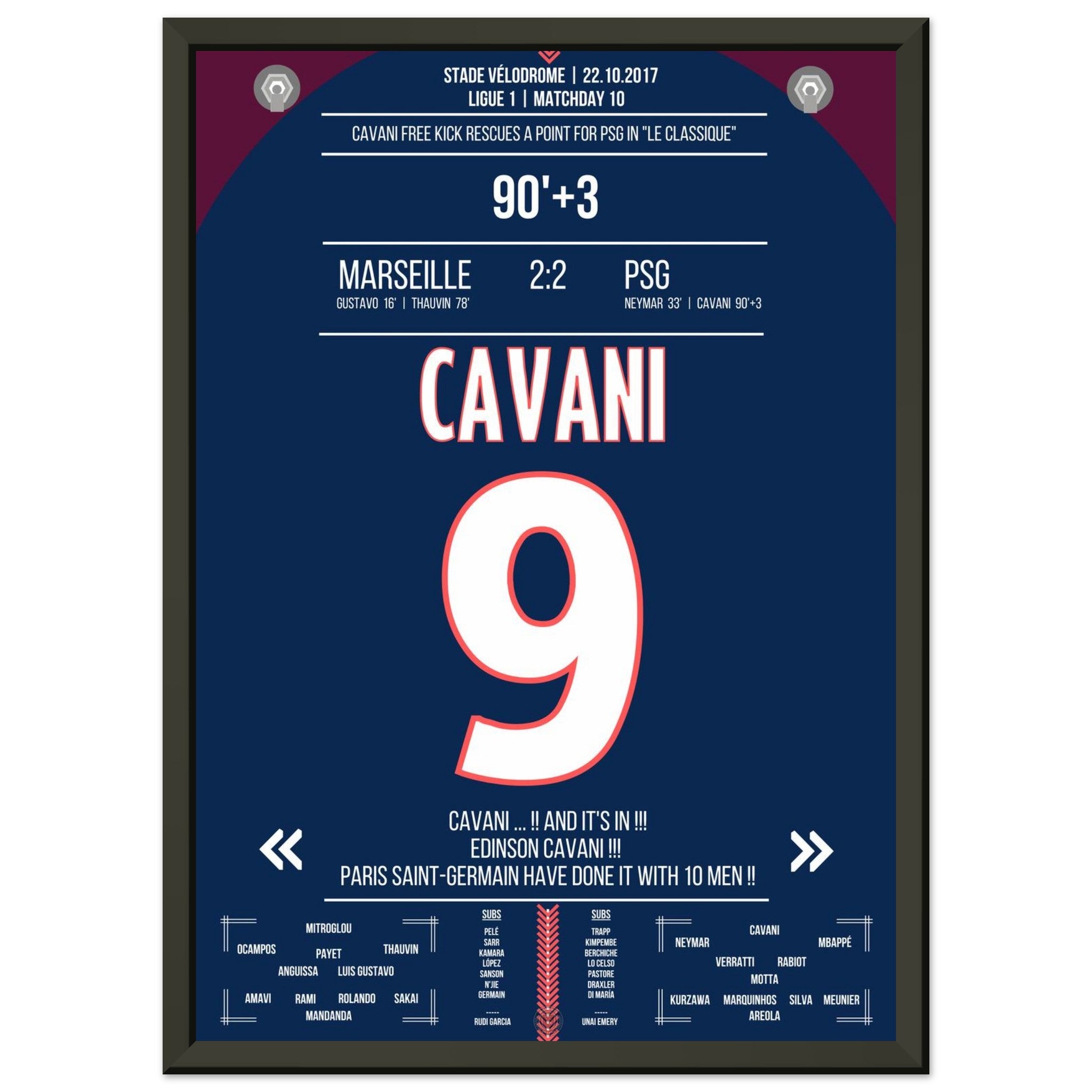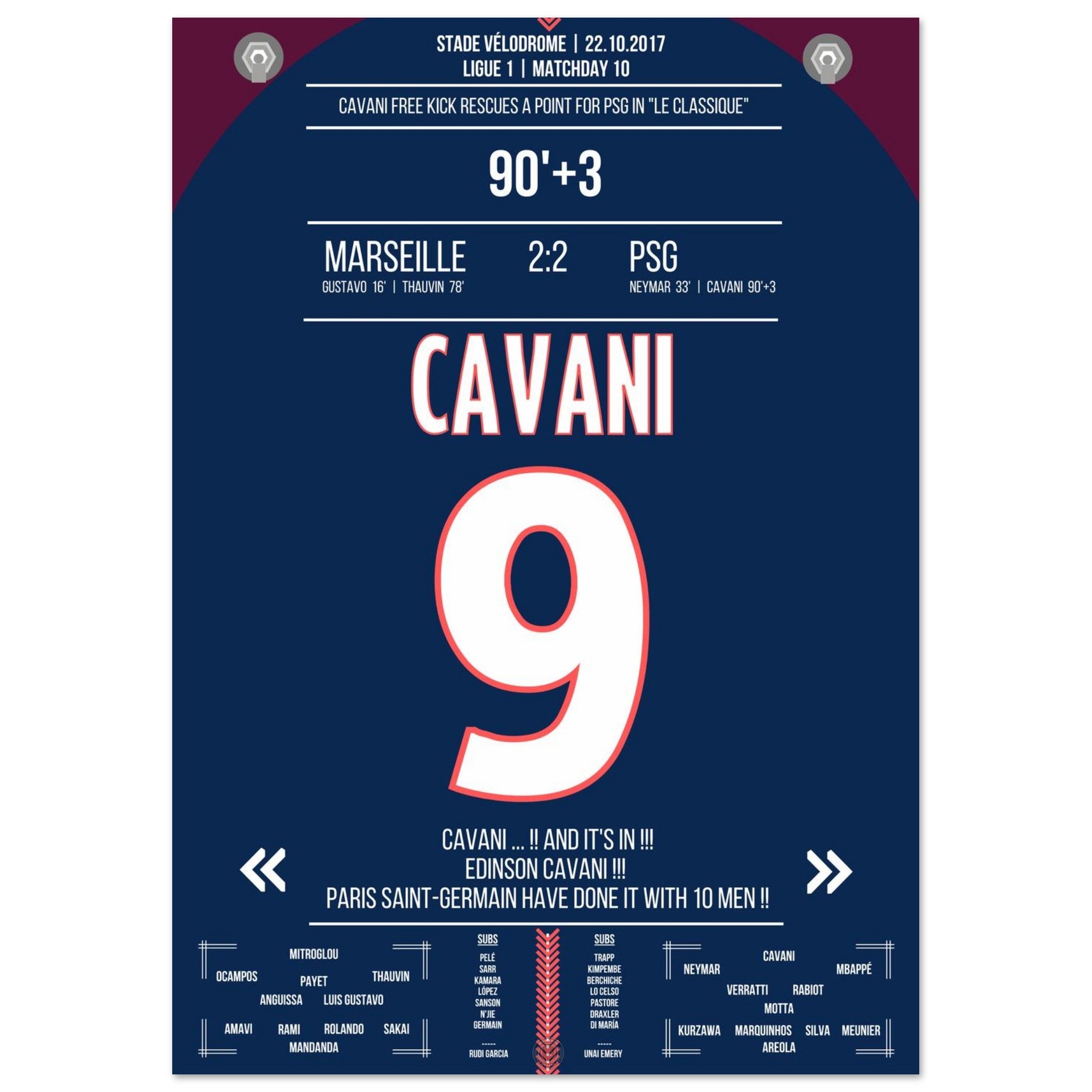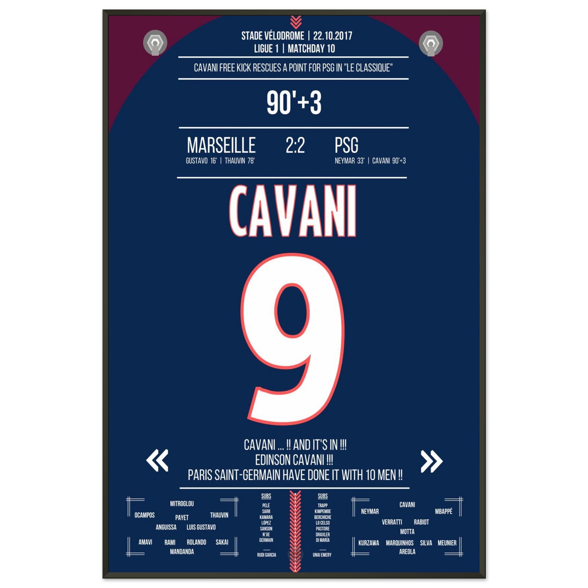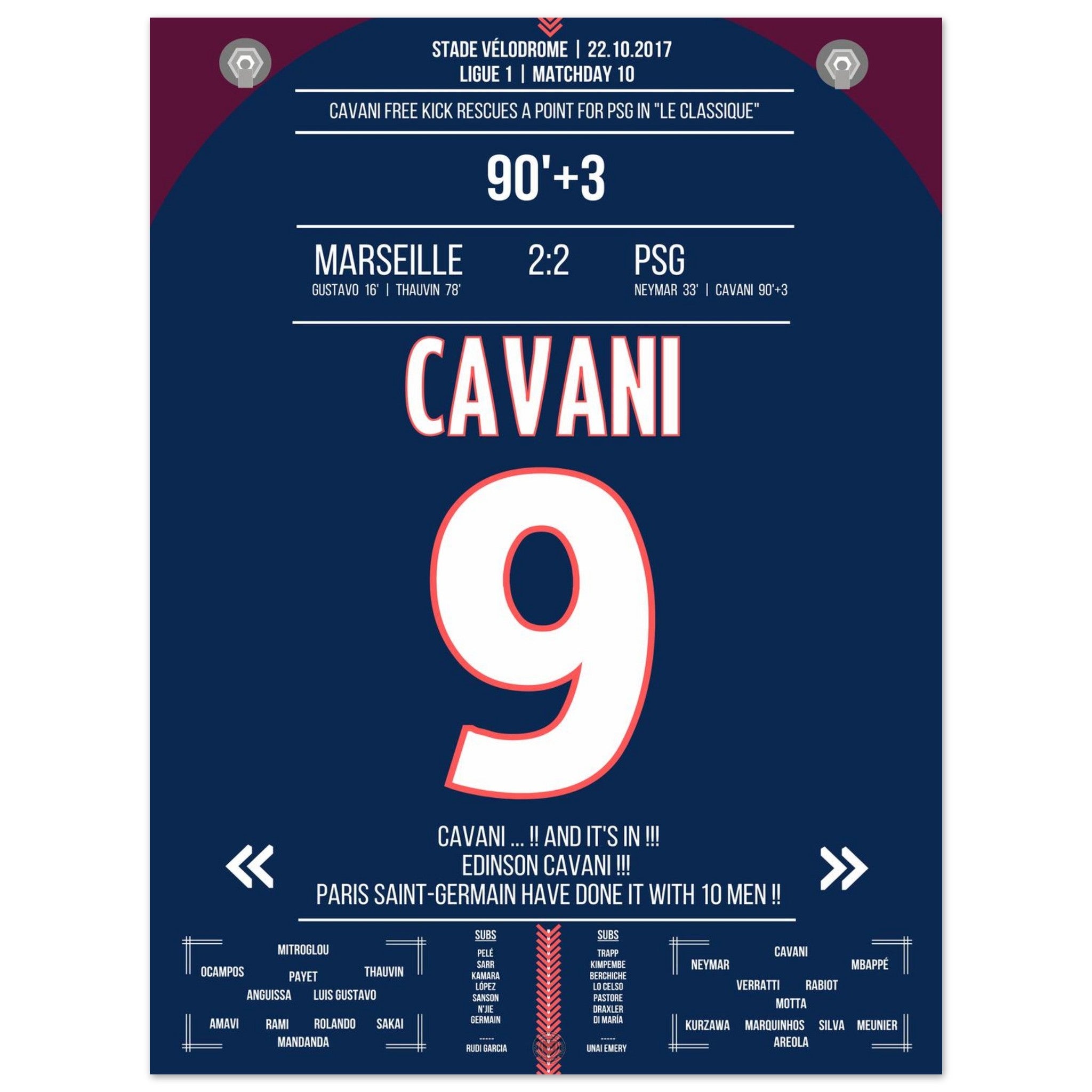 In der 93. Minute zirkelt Edinson Cavani einen Freistoß an der Mauer vorbei direkt unter die Latte – Ausgleich! Der Parc des Princes explodiert, die Marseiller Fans verstummen. Paris entreißt Marseille in letzter Sekunde den Sieg. Ein Klassiker, wie man ihn liebt: hitzig, laut – und Cavani eiskalt.