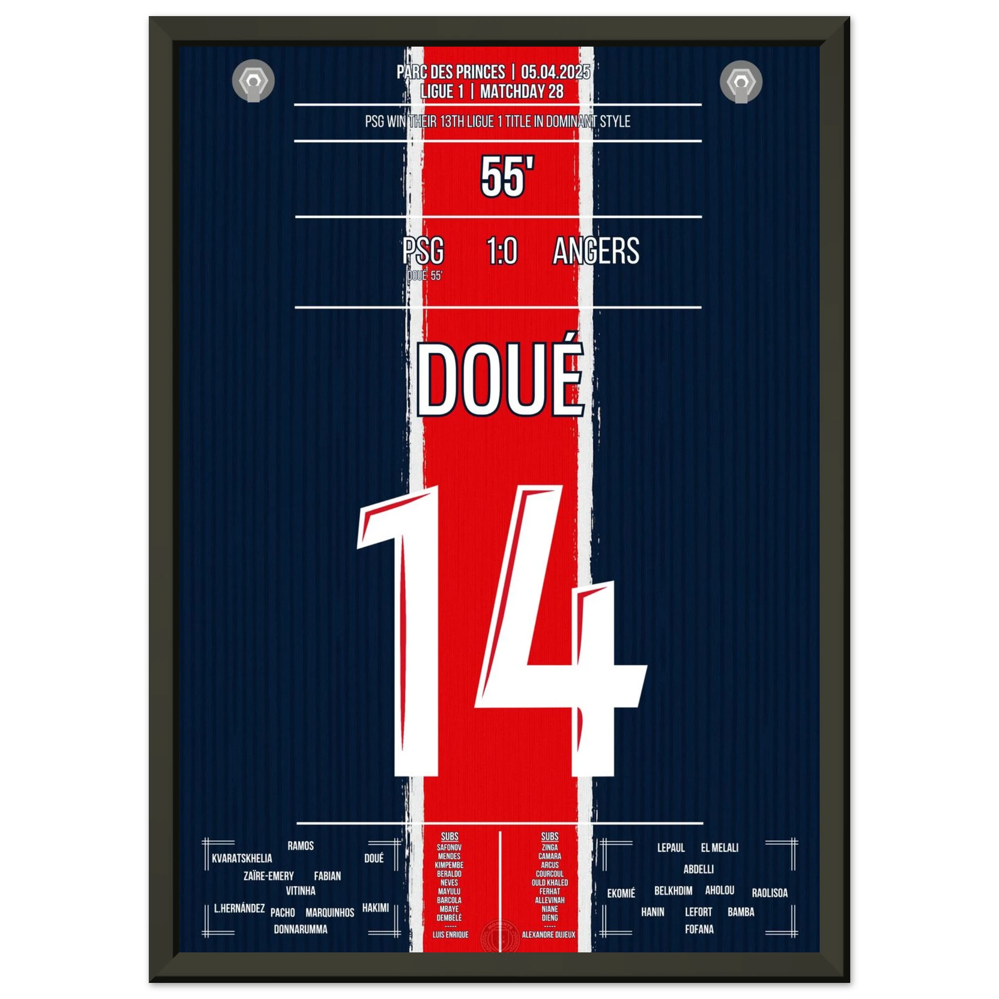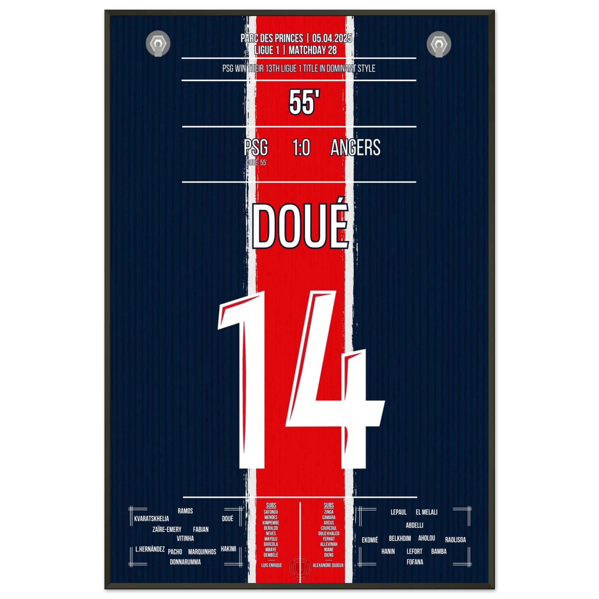Gegen ein tief stehendes Angers tut sich Paris lange schwer. Doch in der 56. Minute erlöst Désiré Doué die Fans im Prinzenpark mit einem wuchtigen Schuss aus der Distanz. Der 1:0-Sieg bleibt glanzlos – aber am Ende reichen sie zum vorzeitigen Gewinn der 13. Meisterschaft.