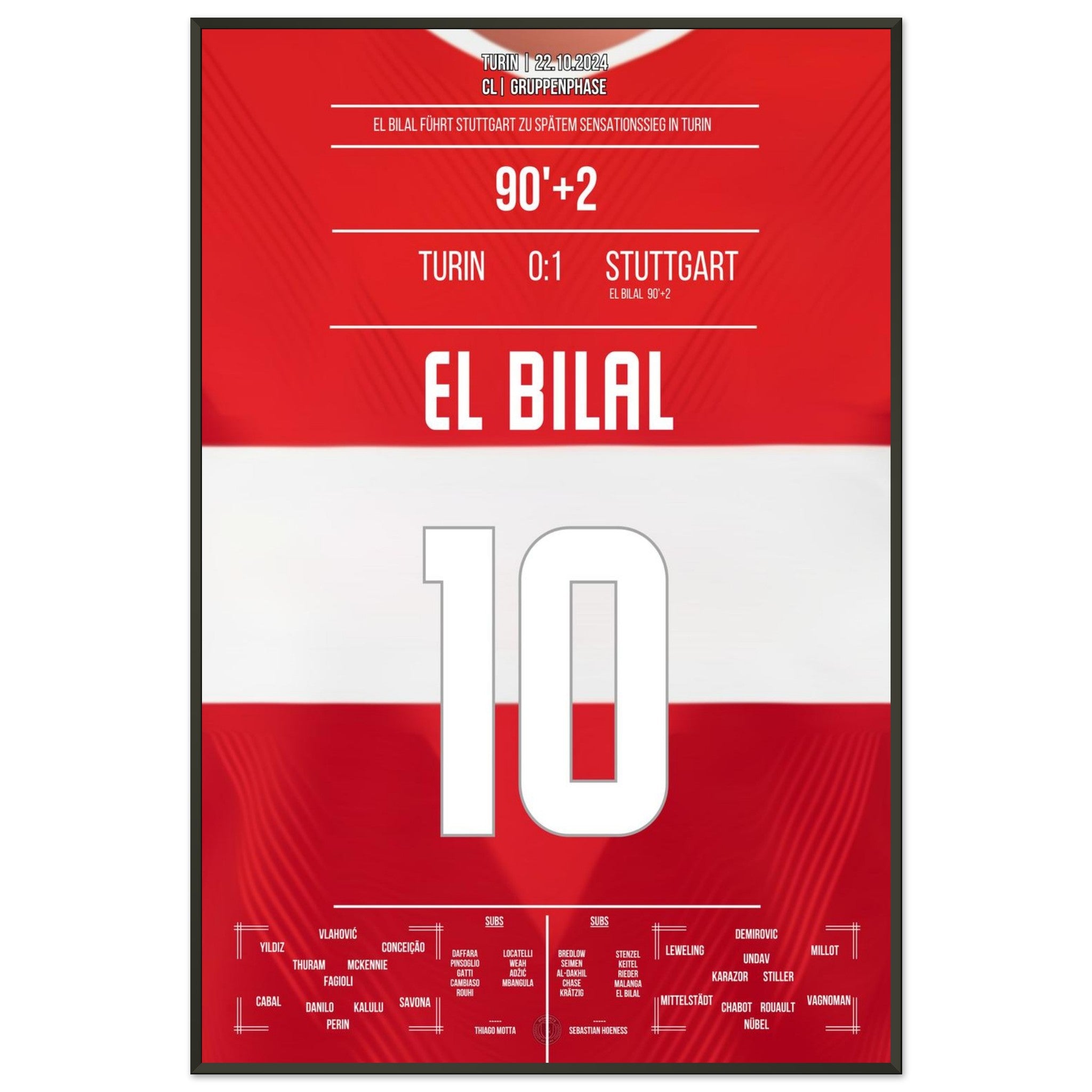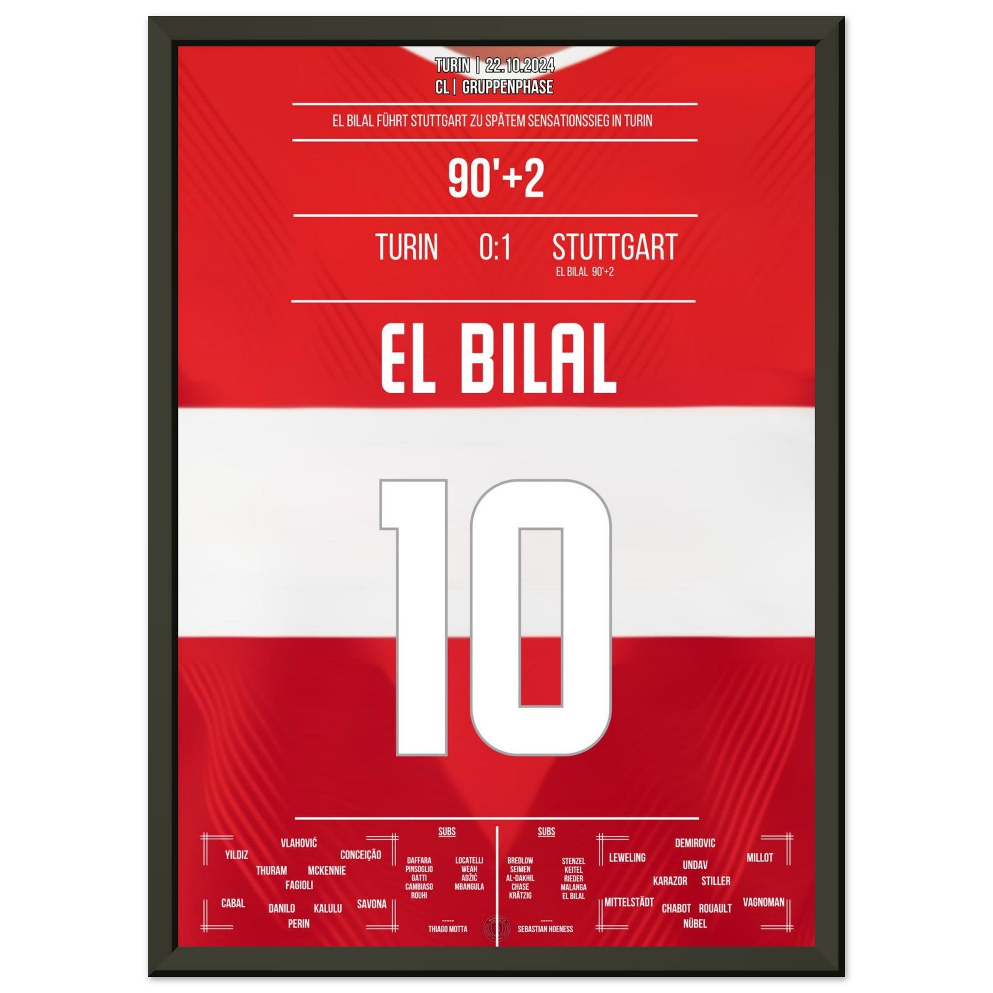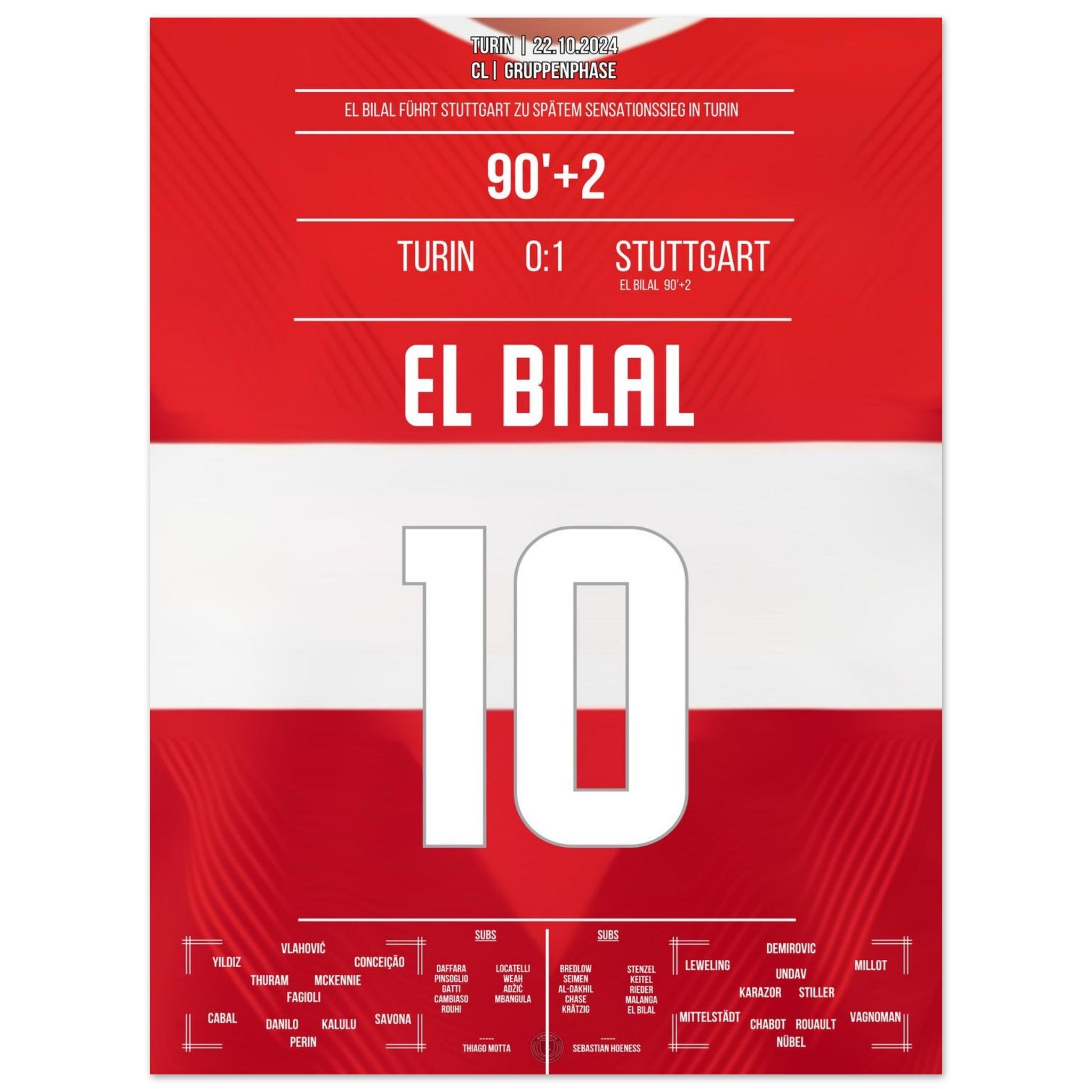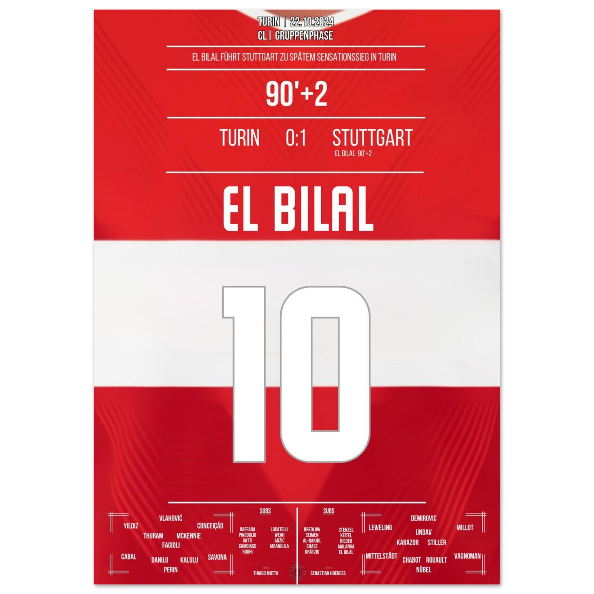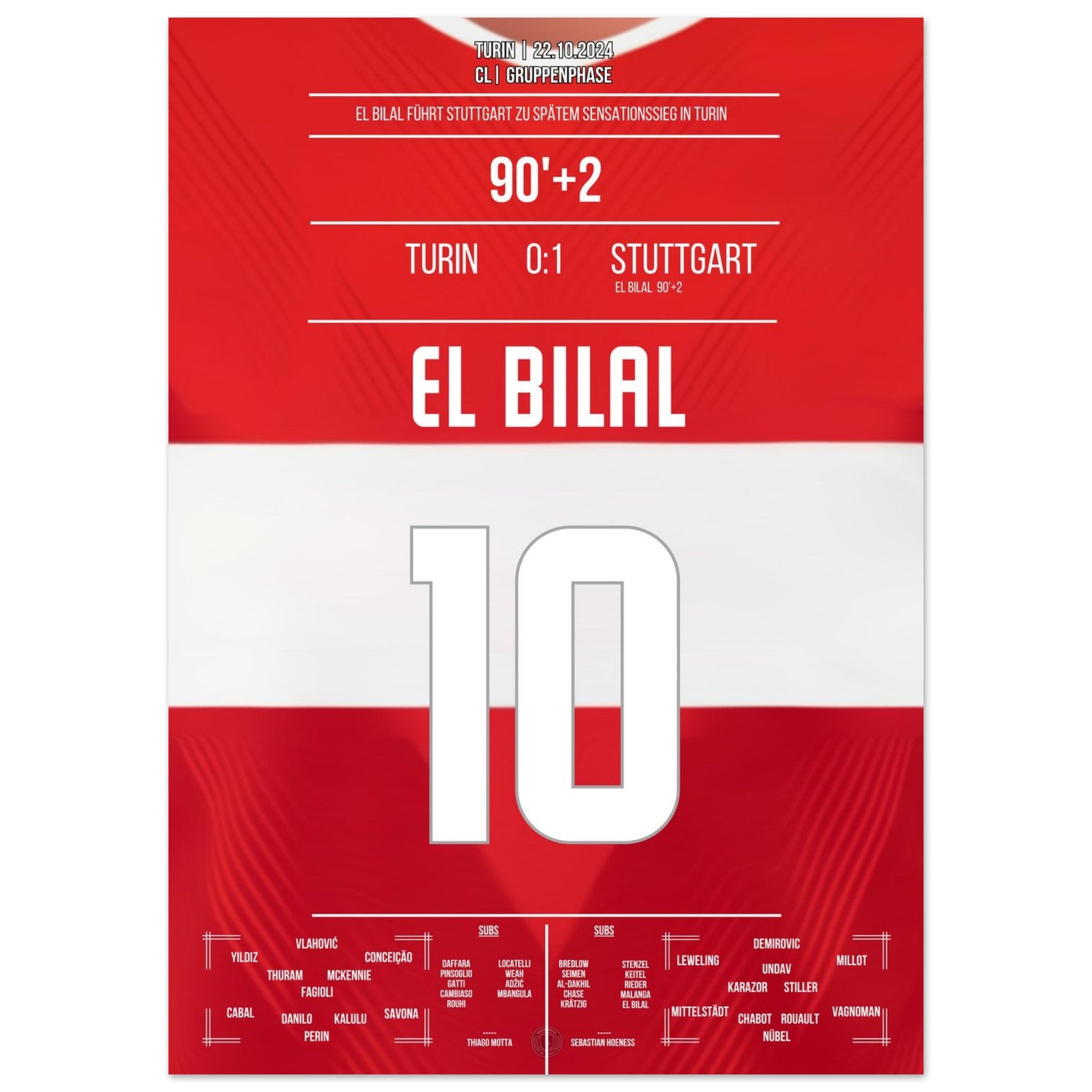 22. Oktober 2024 – Turin vs. Stuttgart 0:1: In der 92. Minute sorgt El Bilal Touré mit seinem Last-Minute-Treffer in Turin für einen historischen Auswärtssieg der Stuttgarter in der CL. Ein europäischer Gänsehautmoment für die Ewigkeit – unser Poster fängt ihn in Rot-Weiß ein.