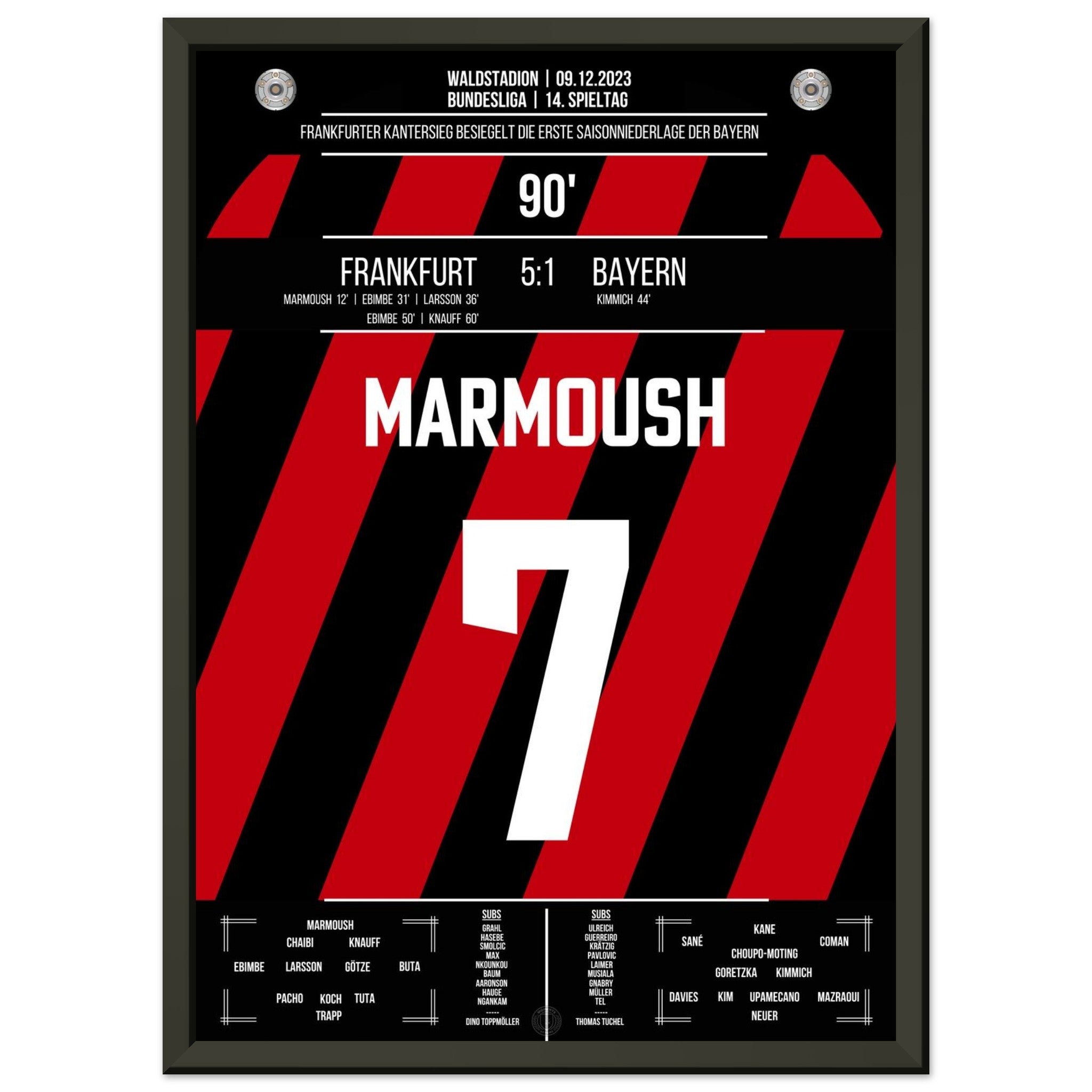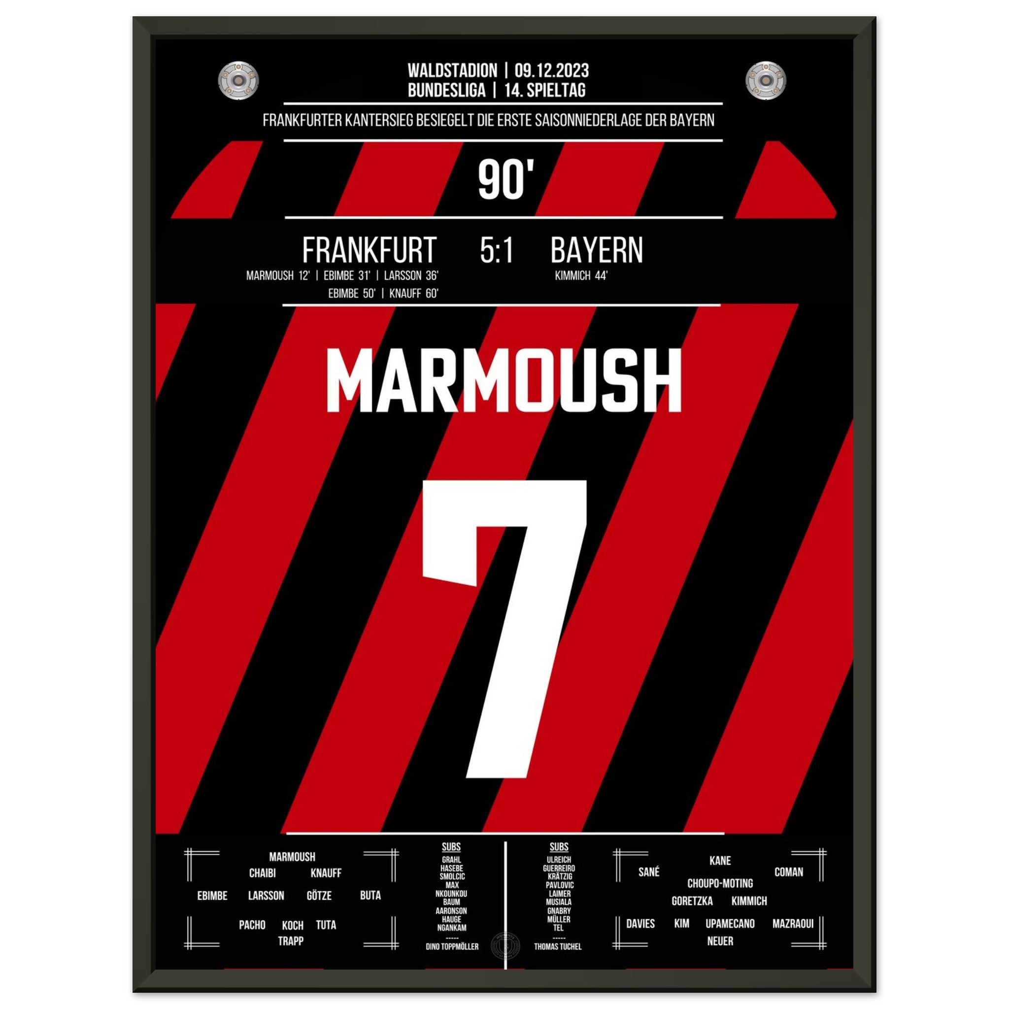 9. Dezember 2023 – Frankfurt vs. Bayern 5:1: In der 90. Minute setzt Omar Marmoush den Schlusspunkt eines denkwürdigen Spiels – Frankfurt fegt die Bayern mit 5:1 vom Platz. Tempo, Wucht, Vollendung – ein perfekter Nachmittag am Main. Unser Poster hält diesen historischen Moment in Weiß-Schwarz fest.