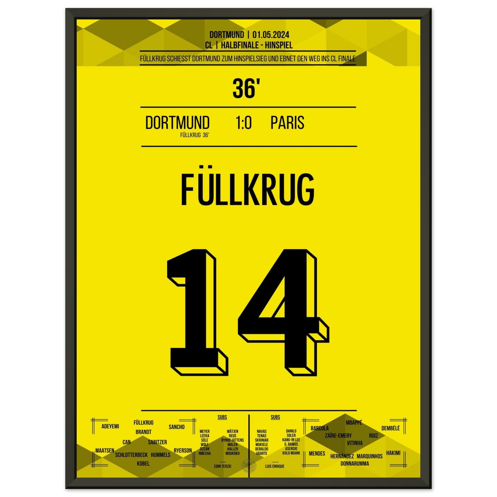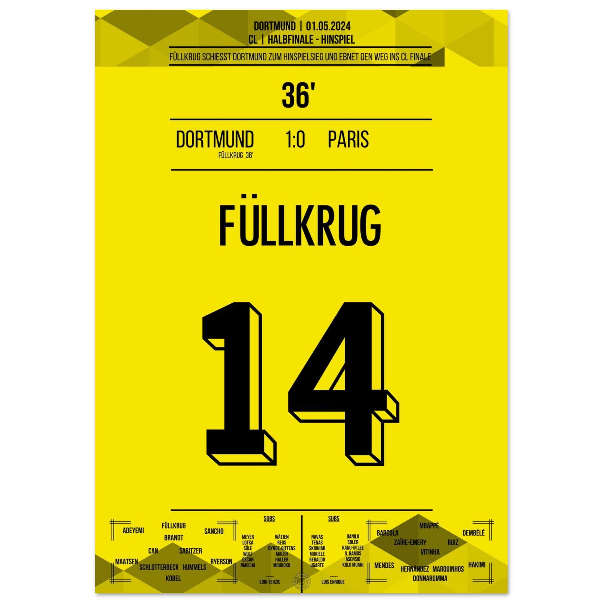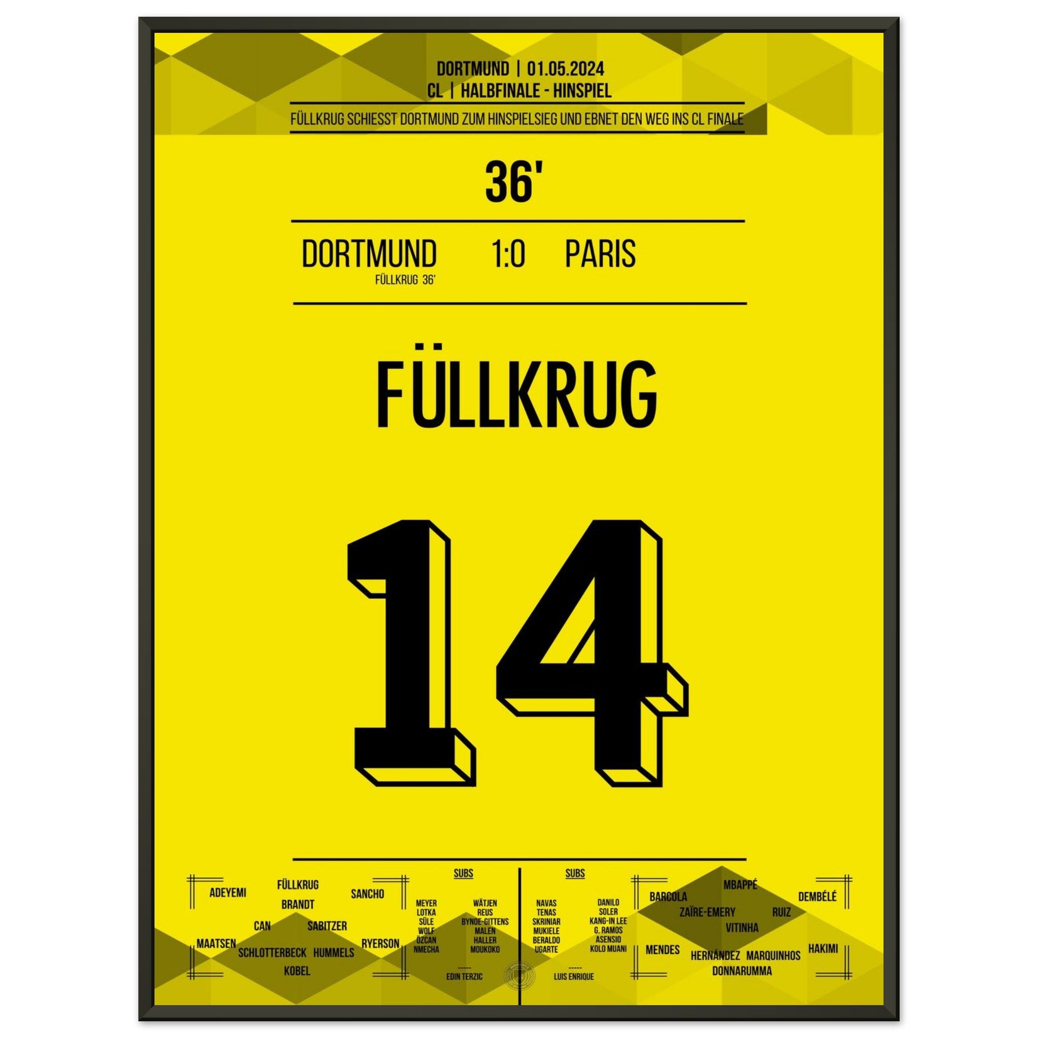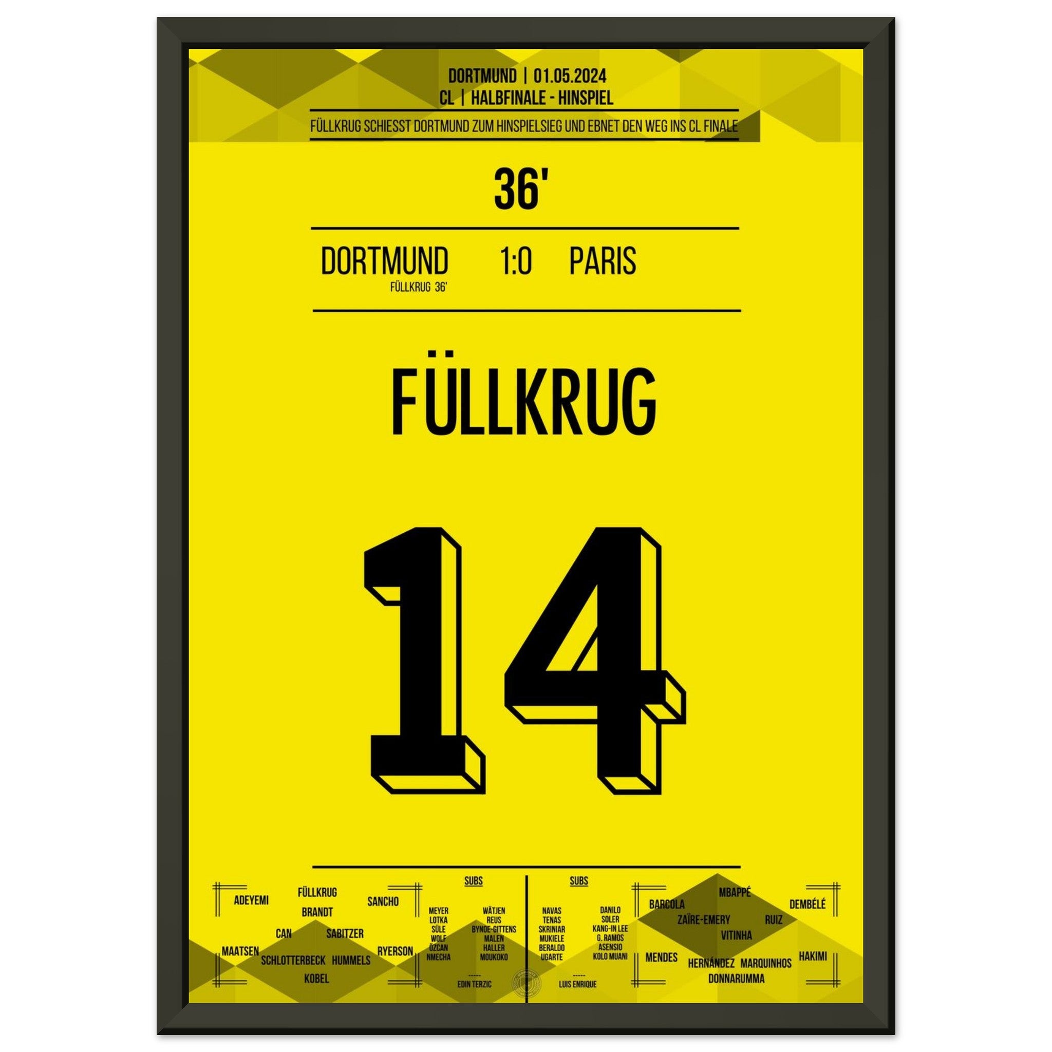 1. Mai 2024 – Dortmund vs. Paris 1:0: In der 36. Minute trifft Niclas Füllkrug eiskalt zur Führung und lässt das Stadion beben – Dortmund bezwingt PSG im Halbfinal-Hinspiel der CL. Ein Abend, an dem ganz Europa schwarz-gelb jubelt. Unser Poster hält diesen Moment europäischer Gänsehaut für die Ewigkeit fest.