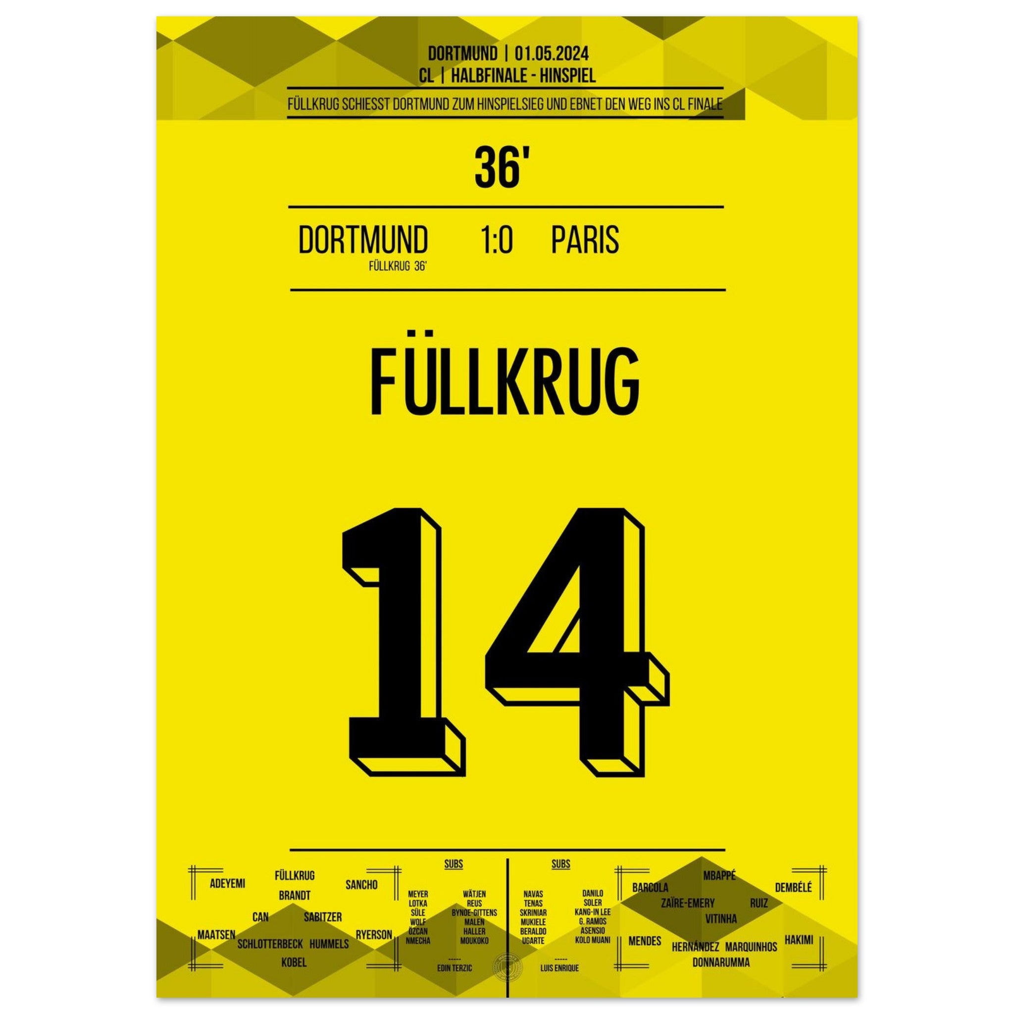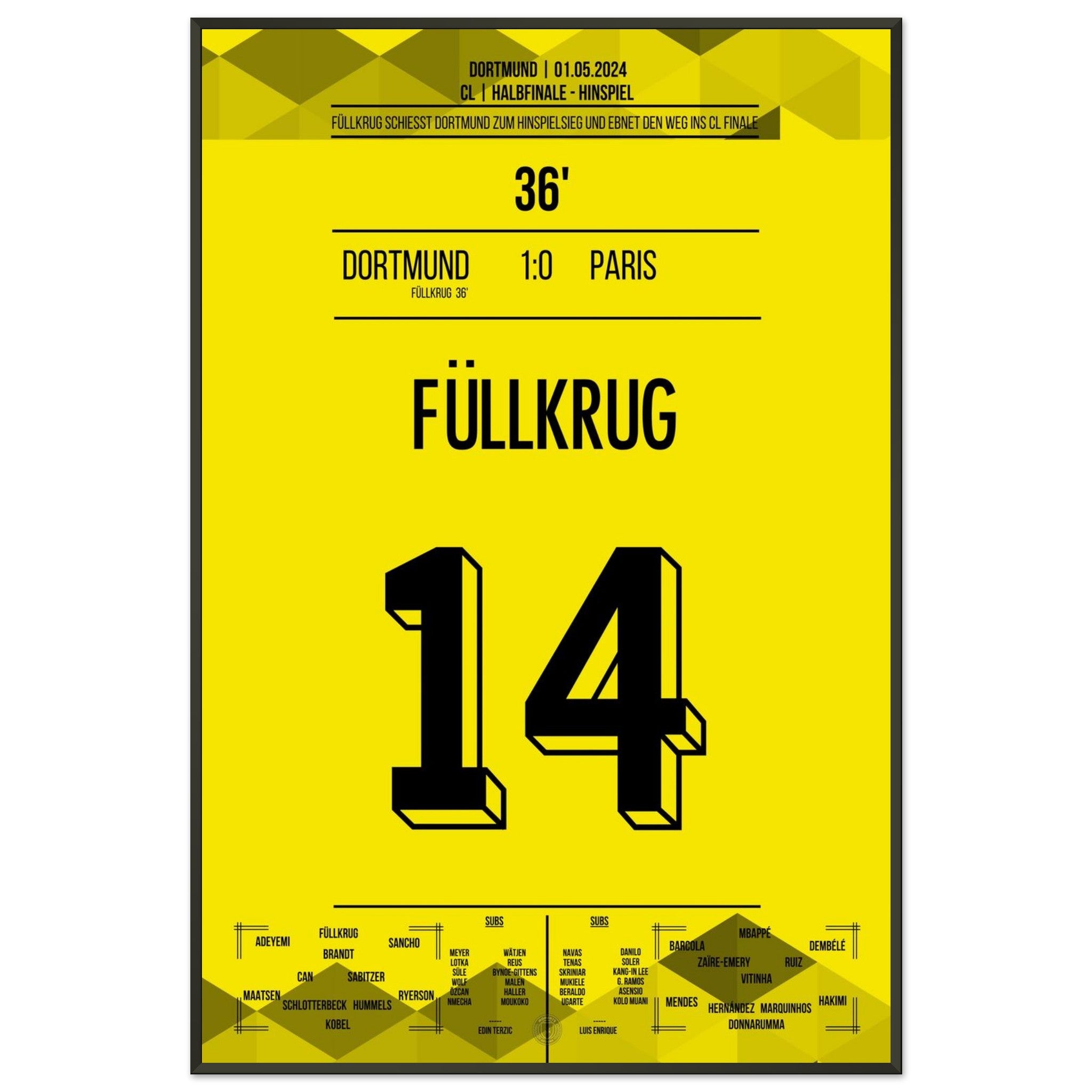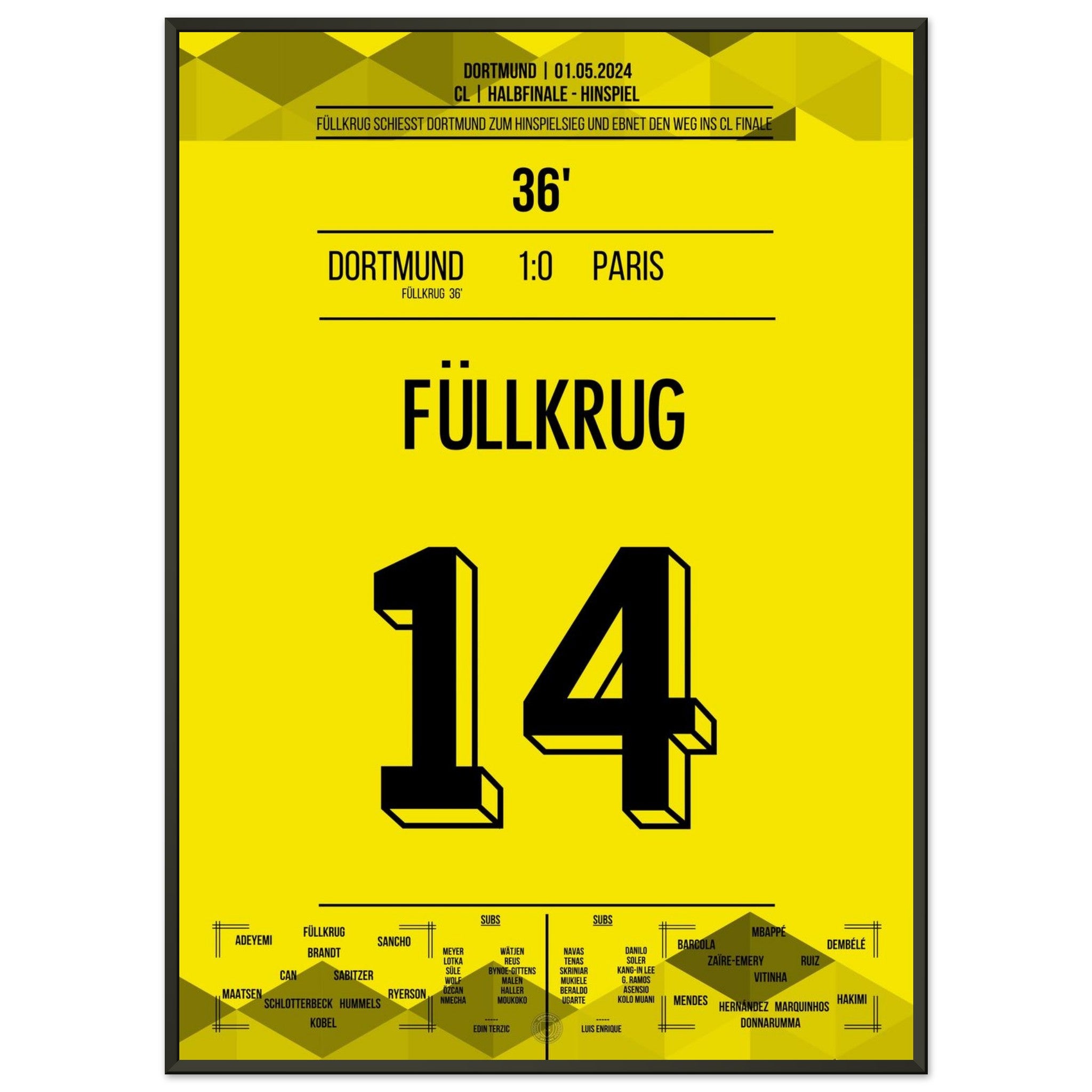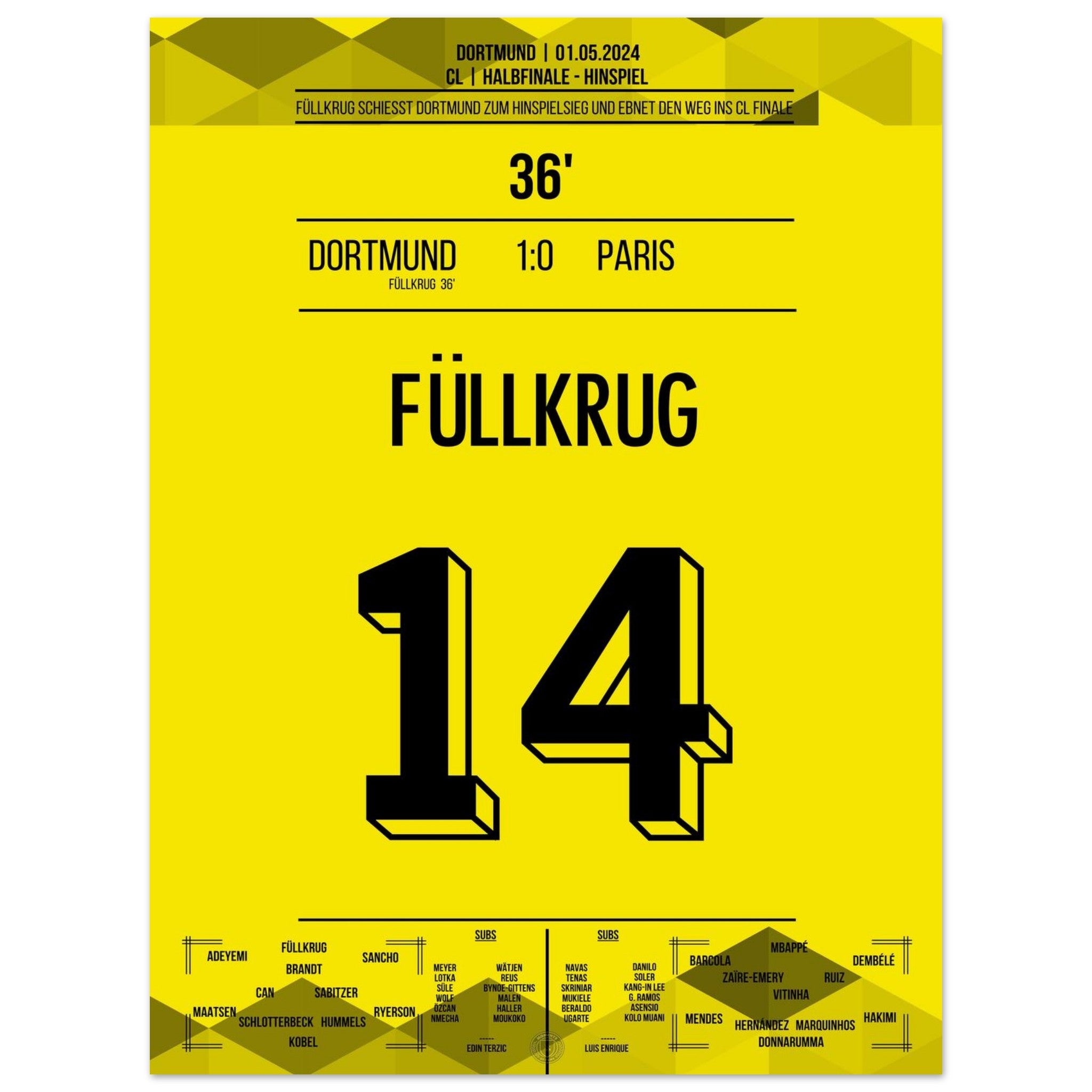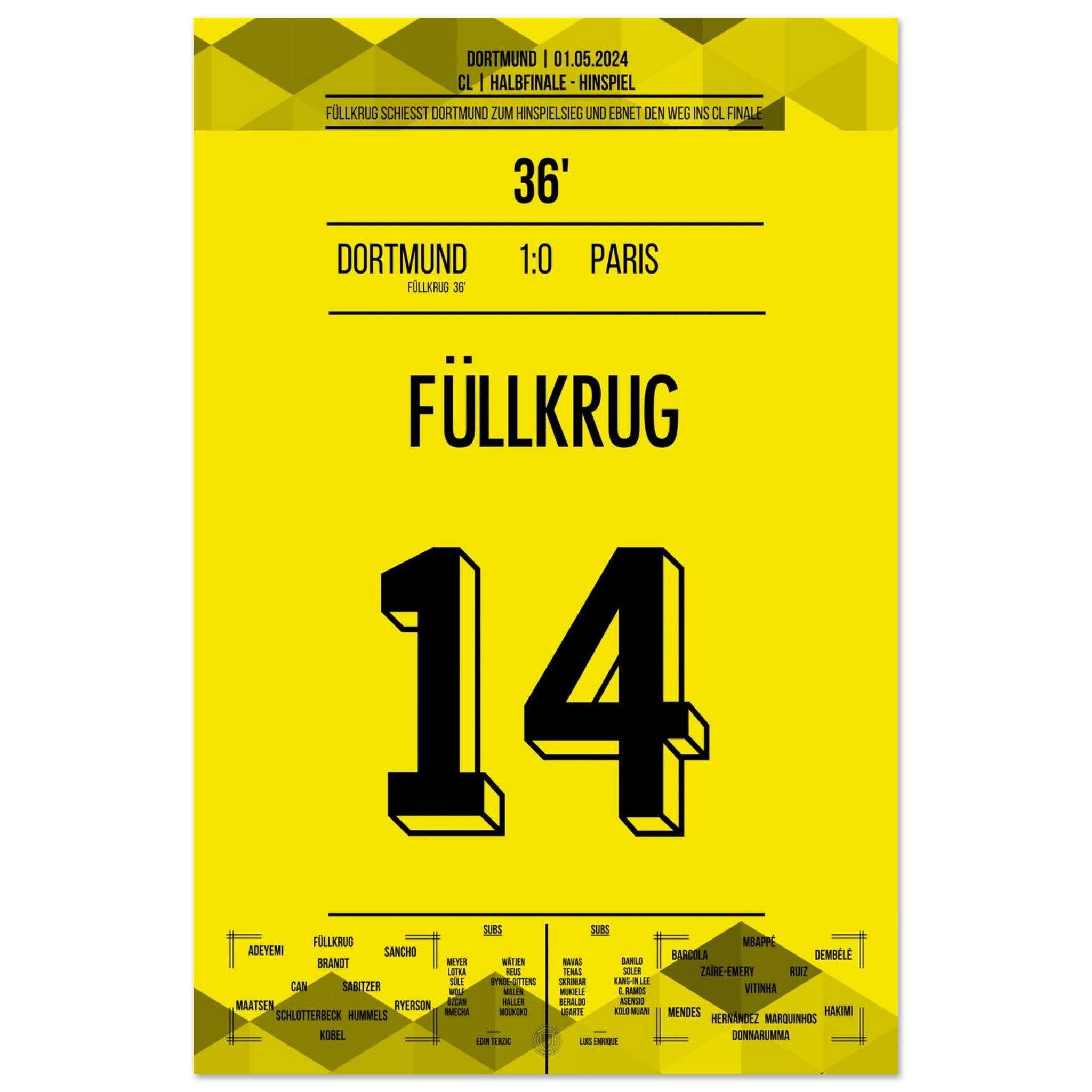 1. Mai 2024 – Dortmund vs. Paris 1:0: In der 36. Minute trifft Niclas Füllkrug eiskalt zur Führung und lässt das Stadion beben – Dortmund bezwingt PSG im Halbfinal-Hinspiel der CL. Ein Abend, an dem ganz Europa schwarz-gelb jubelt. Unser Poster hält diesen Moment europäischer Gänsehaut für die Ewigkeit fest.