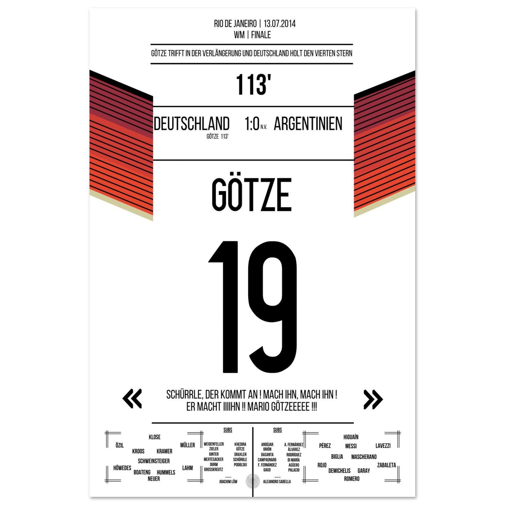 13. Juli 2014 – Deutschland vs. Argentinien 1:0 n. V.: In der 113. Minute schreibt Mario Götze Fußballgeschichte: Annahme mit der Brust, Abschluss mit dem linken Fuß – das goldene Tor bringt Deutschland den vierten Stern. Unser Poster fängt den magischen Moment im Maracanã für die Ewigkeit ein.