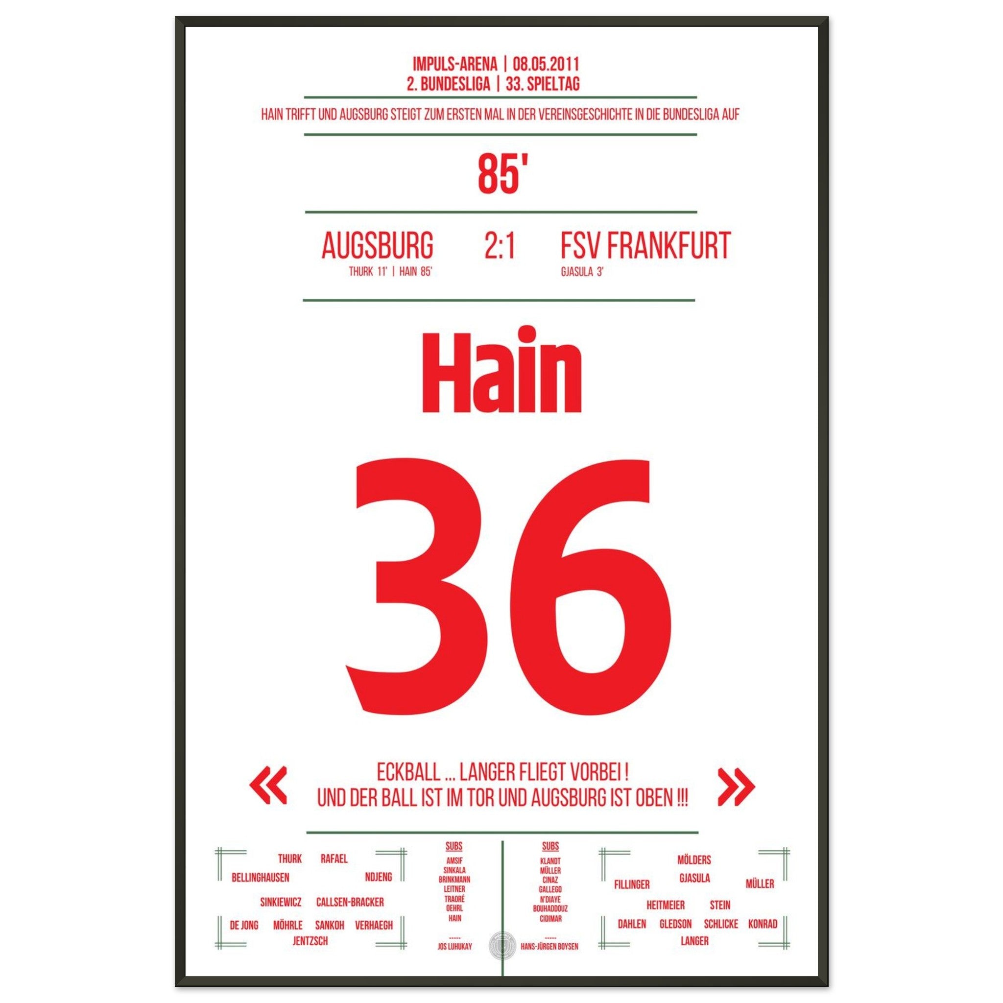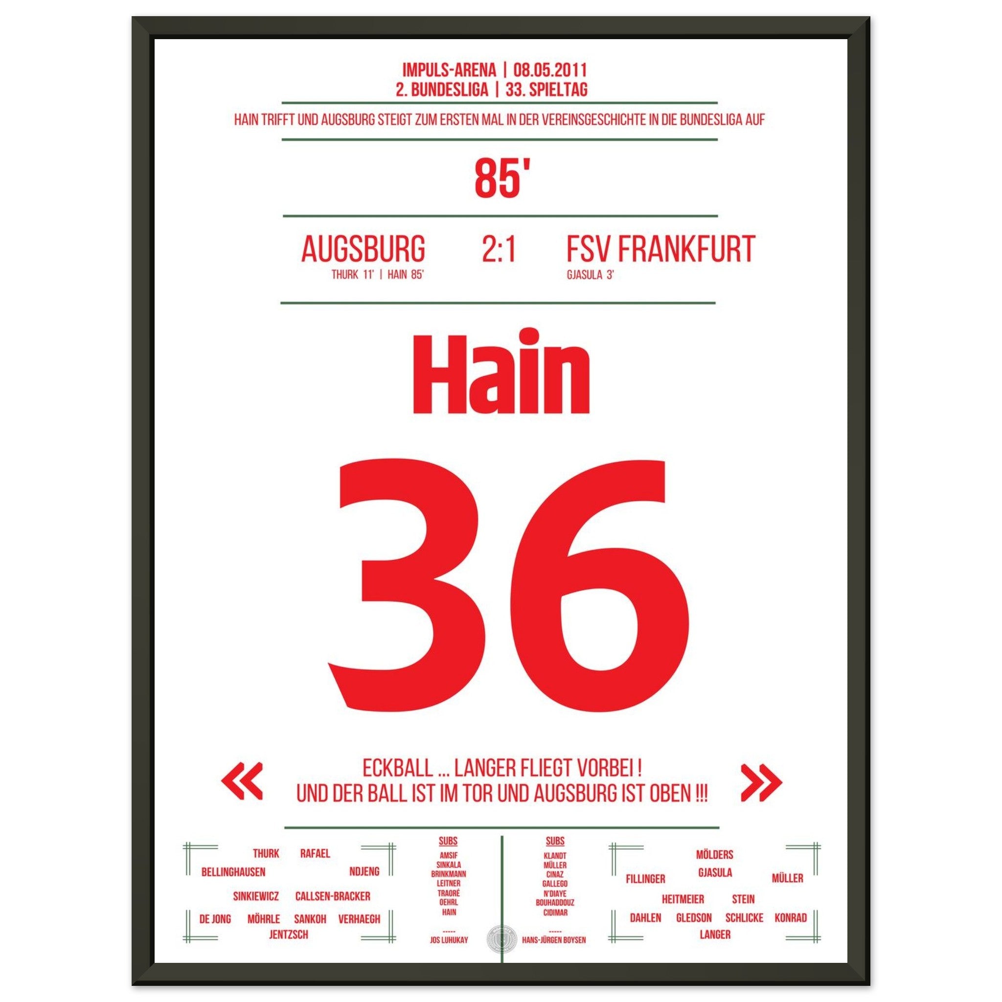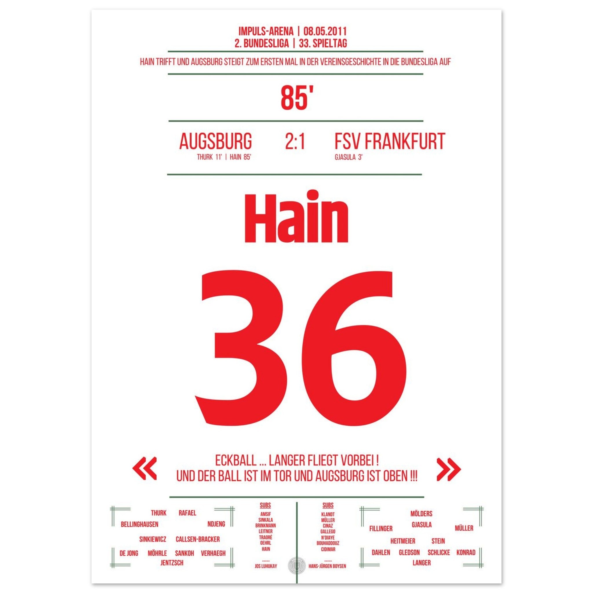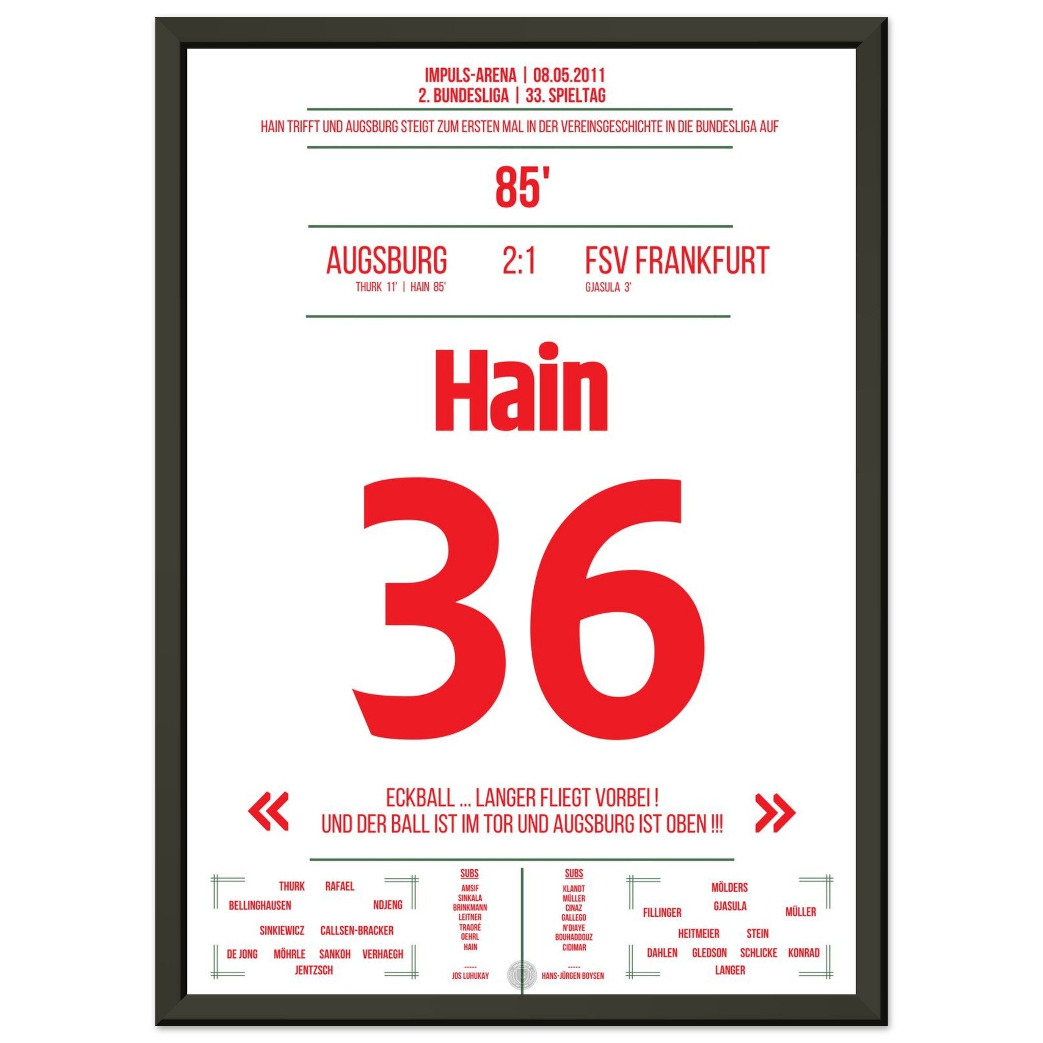 In der 85. Minute trifft Hain und schreibt damit Geschichte. Augsburg feiert den ersten Aufstieg in die Bundesliga – die Arena steht Kopf!