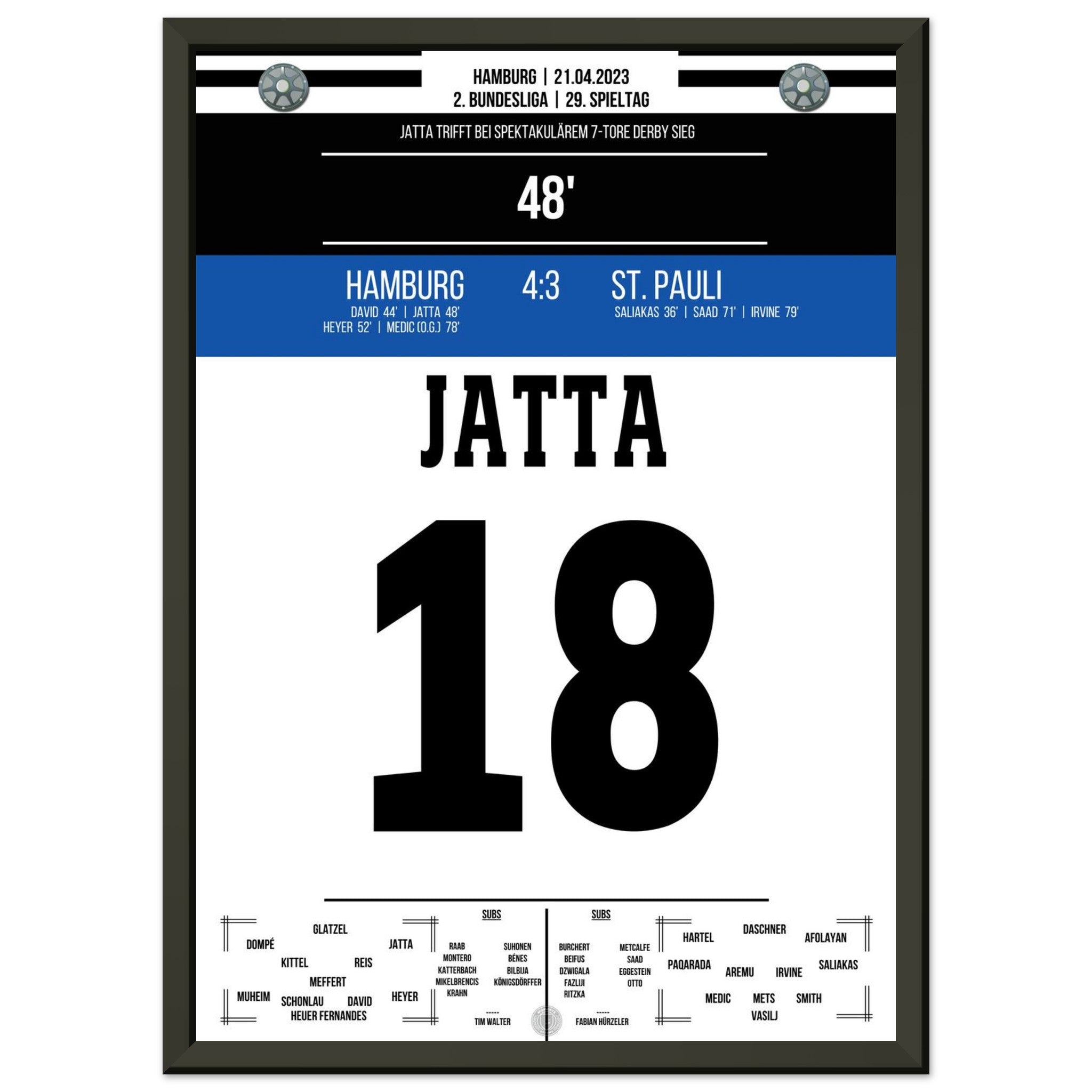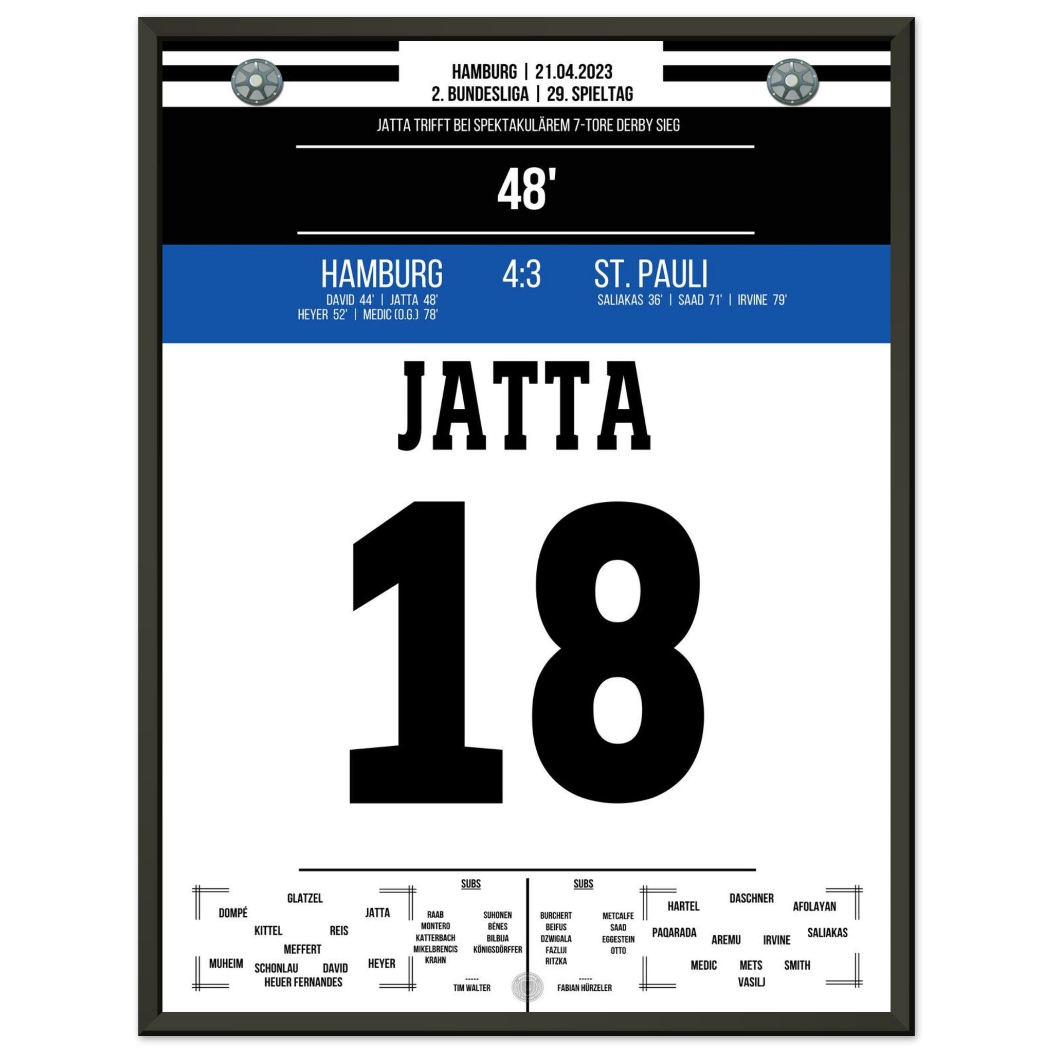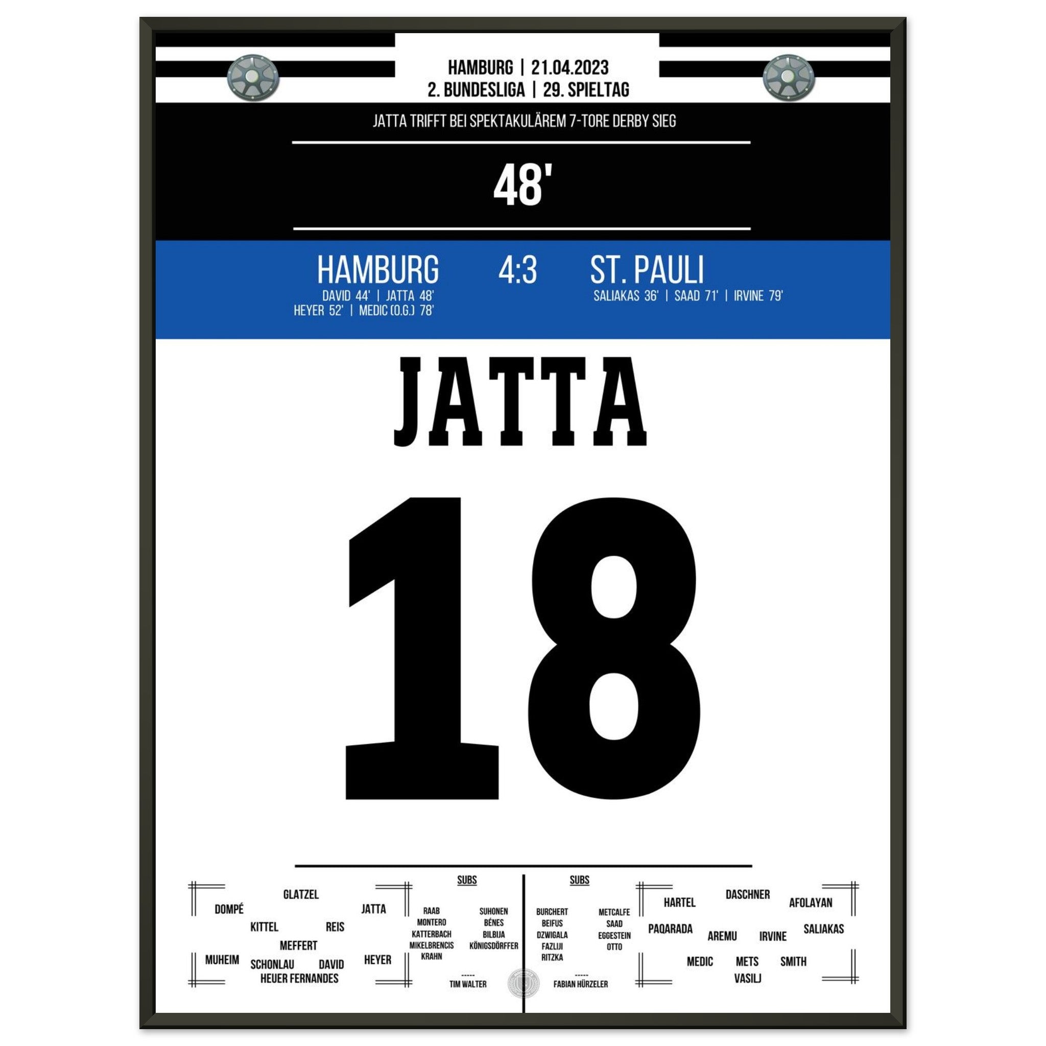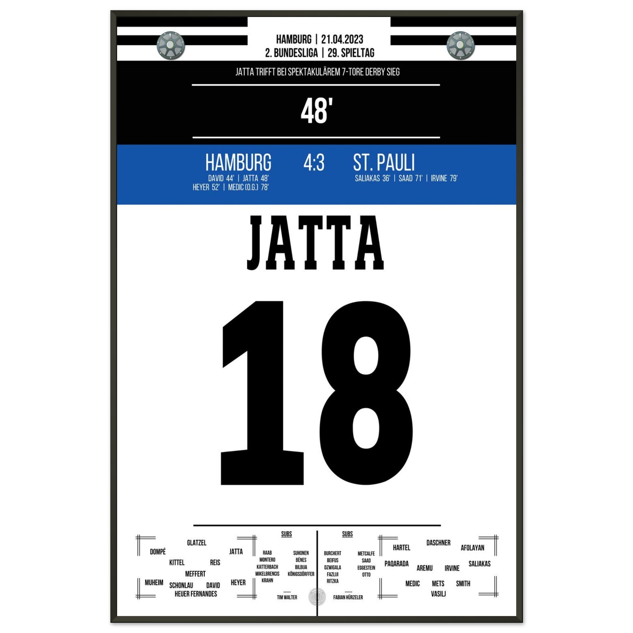 21. April 2023 – Hamburg vs. St. Pauli 4:3: Ein Derby für die Geschichtsbücher! In einem wilden Schlagabtausch setzt Hamburg mit 4:3 gegen den Stadtrivalen St. Pauli durch und lässt den Volkspark beben. Unser Poster fängt die pure Ekstase dieses legendären Stadtduells ein.