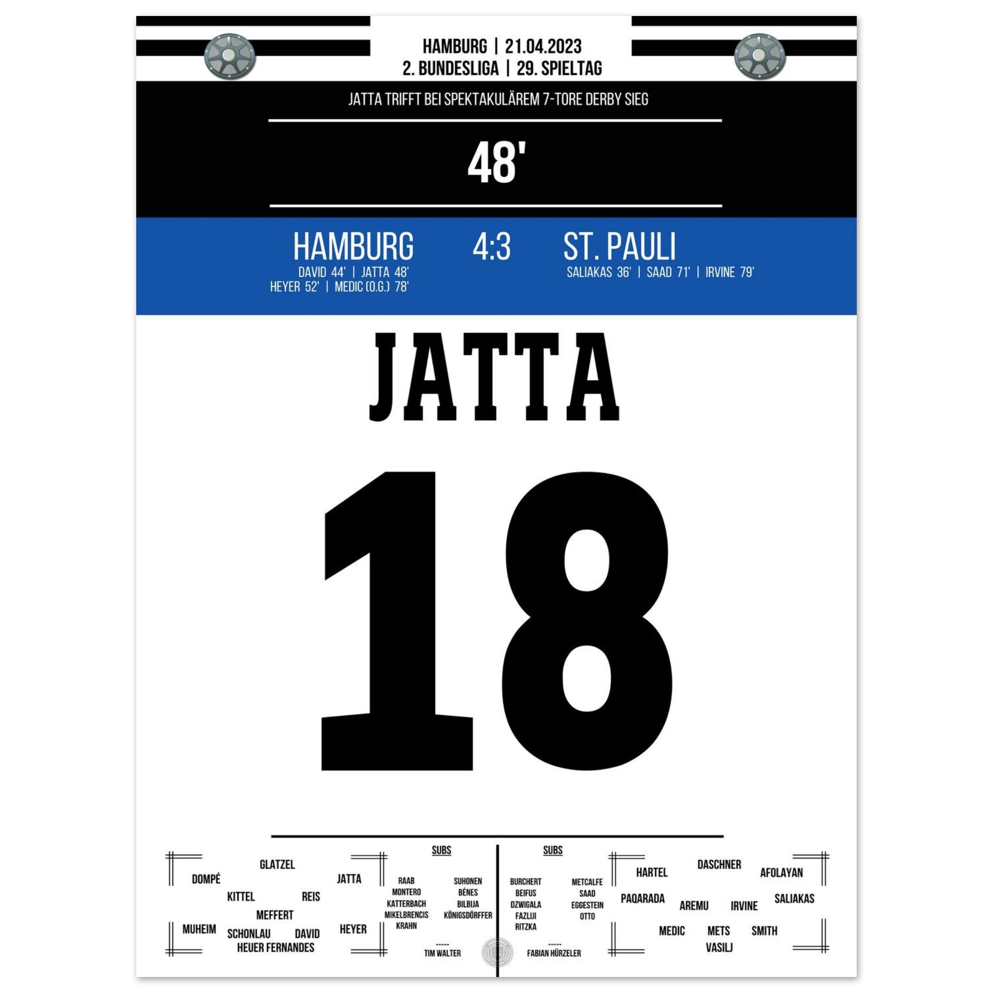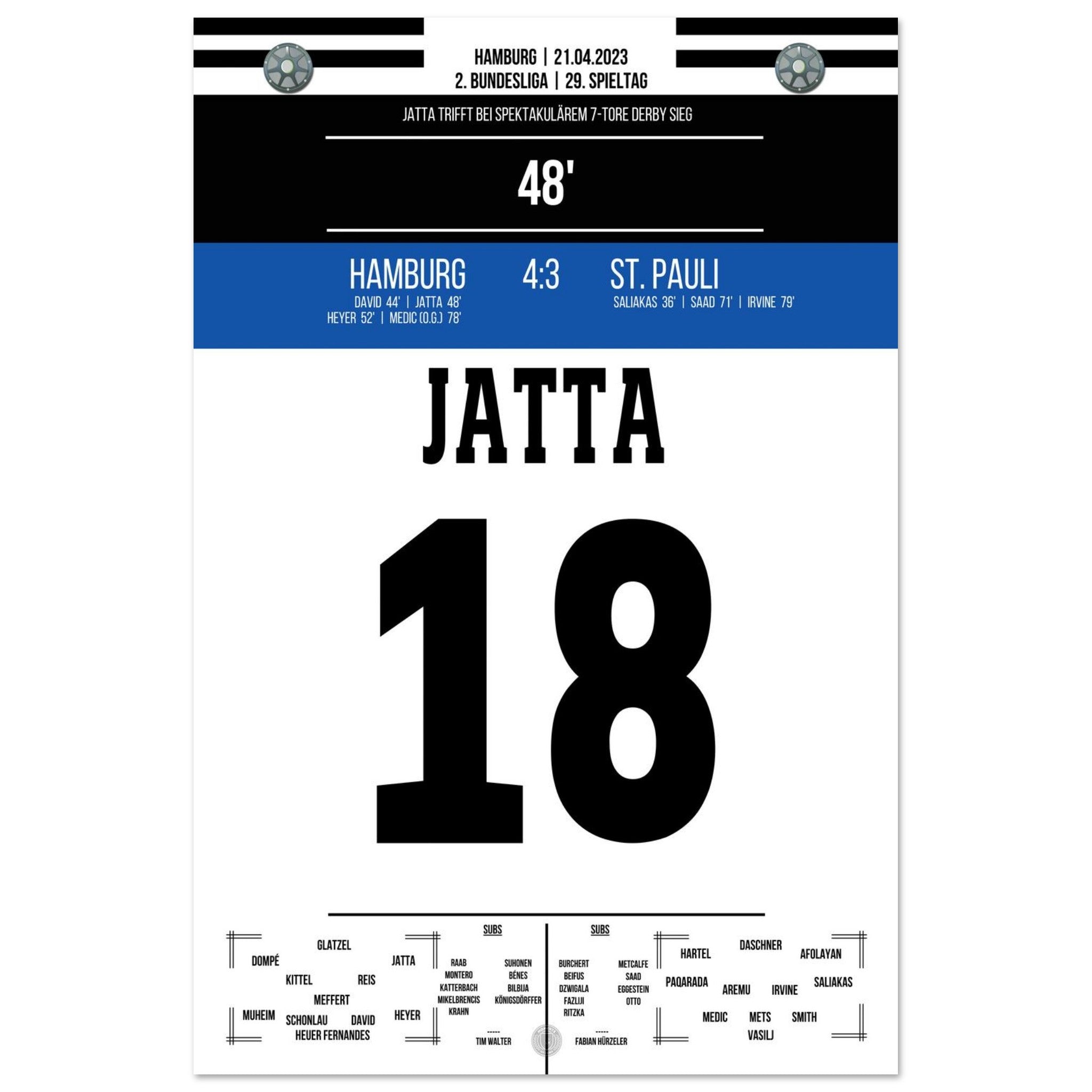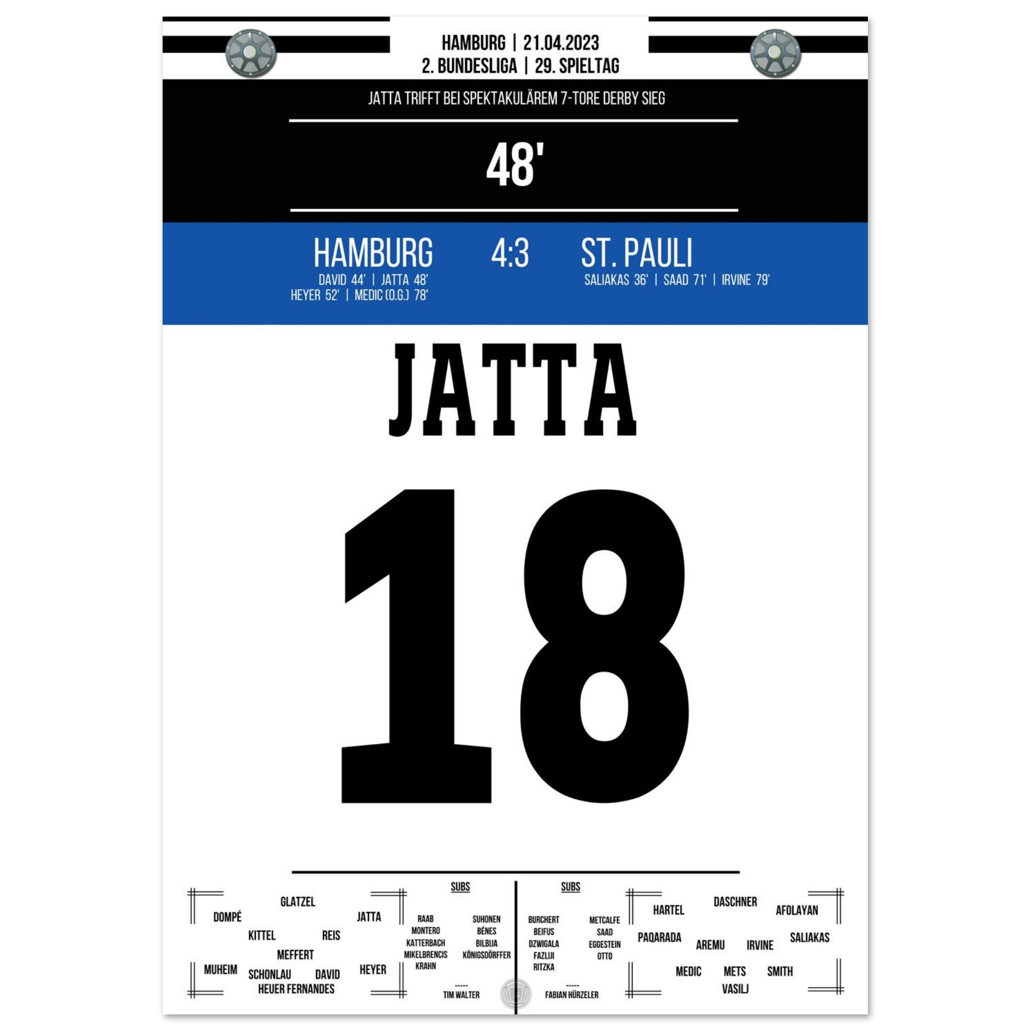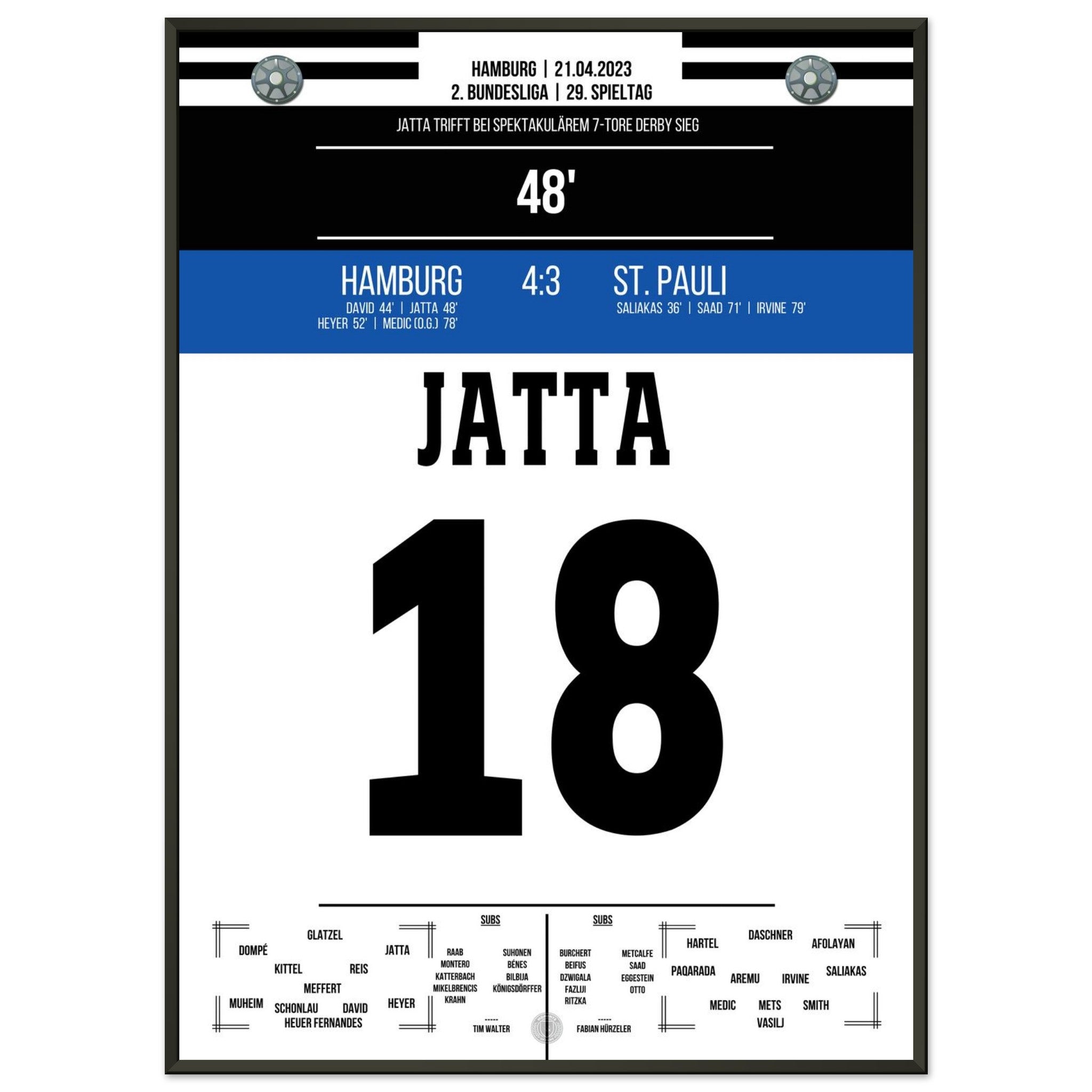 21. April 2023 – Hamburg vs. St. Pauli 4:3: Ein Derby für die Geschichtsbücher! In einem wilden Schlagabtausch setzt Hamburg mit 4:3 gegen den Stadtrivalen St. Pauli durch und lässt den Volkspark beben. Unser Poster fängt die pure Ekstase dieses legendären Stadtduells ein.