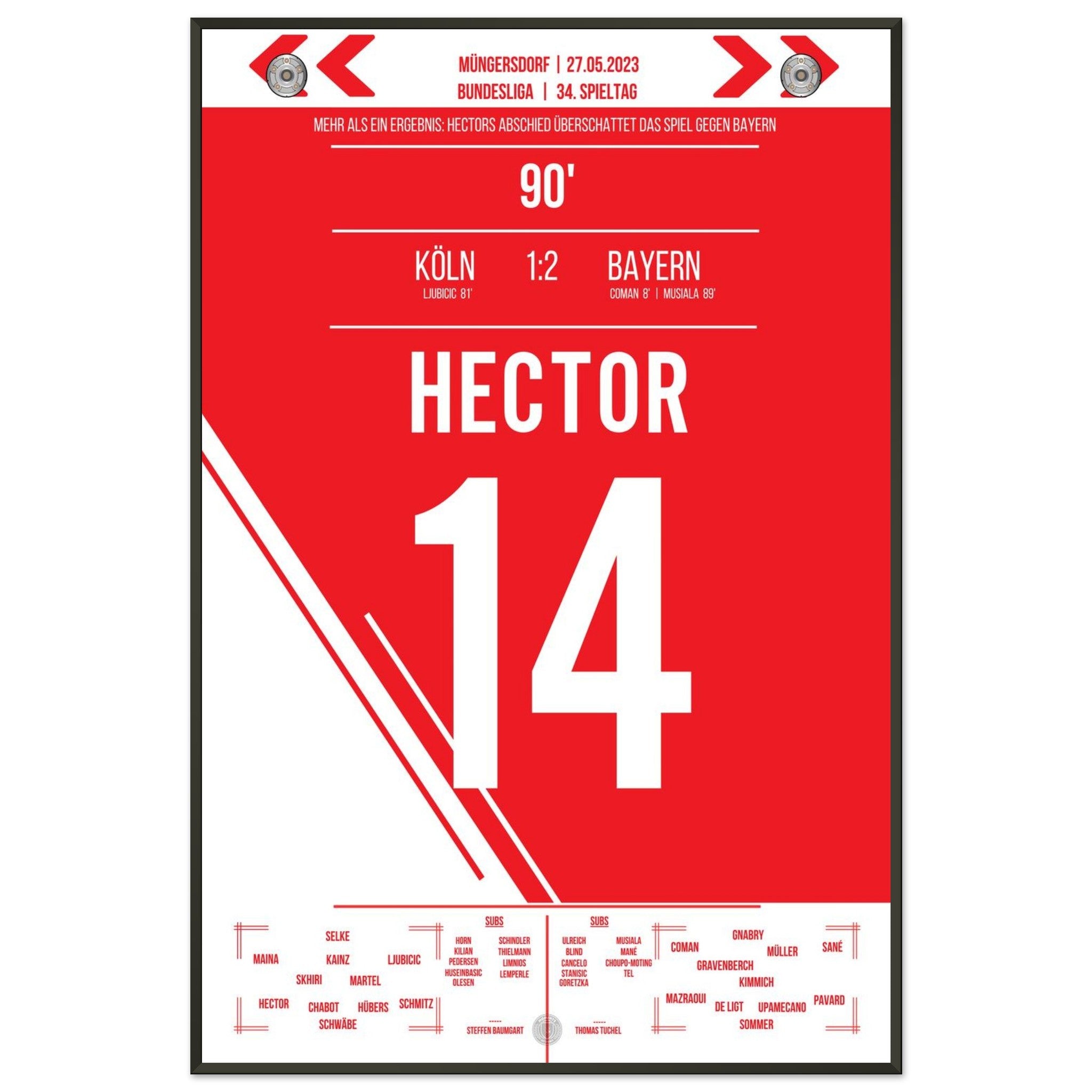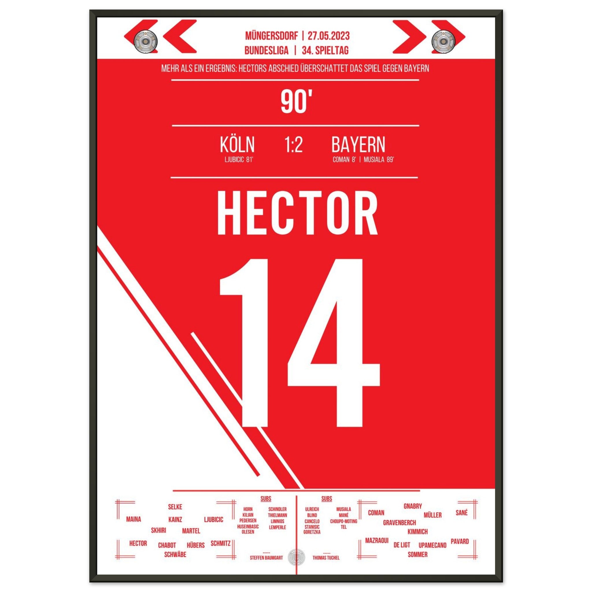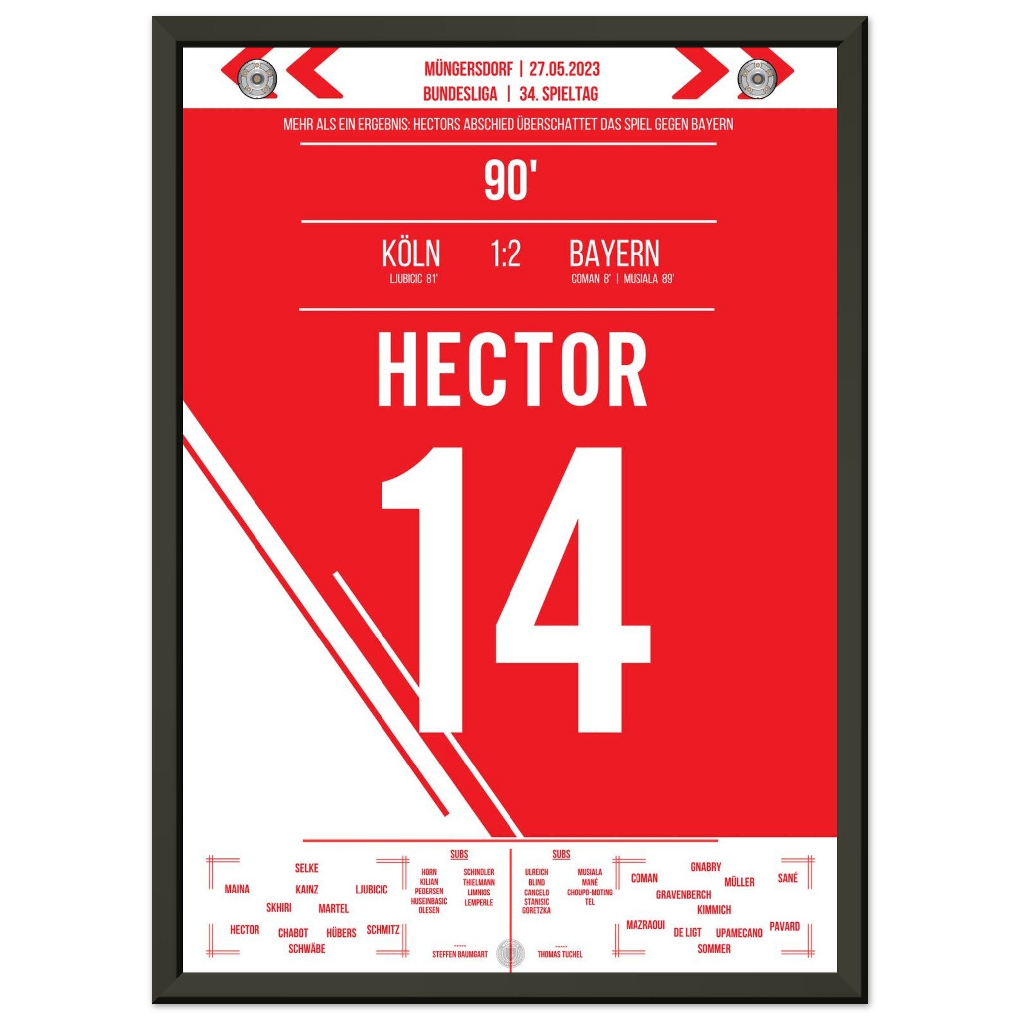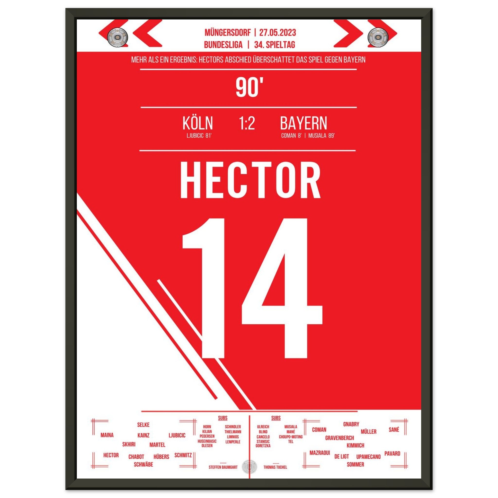 27. Mai 2023 – Köln vs. Bayern 1:2: Ein letztes Mal führt Jonas Hector den FC als Kapitän aufs Feld – gegen die Bayern verabschiedet sich die Vereinsikone nach über einem Jahrzehnt mit großem Applaus und Tränen in den Augen. Ein Moment voller Stolz, Dankbarkeit und Emotion. Unser Poster hält diesen würdevollen Abschied für immer fest.