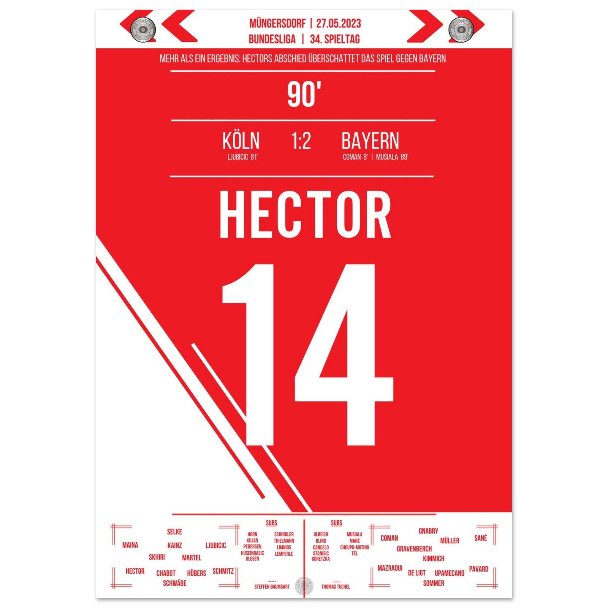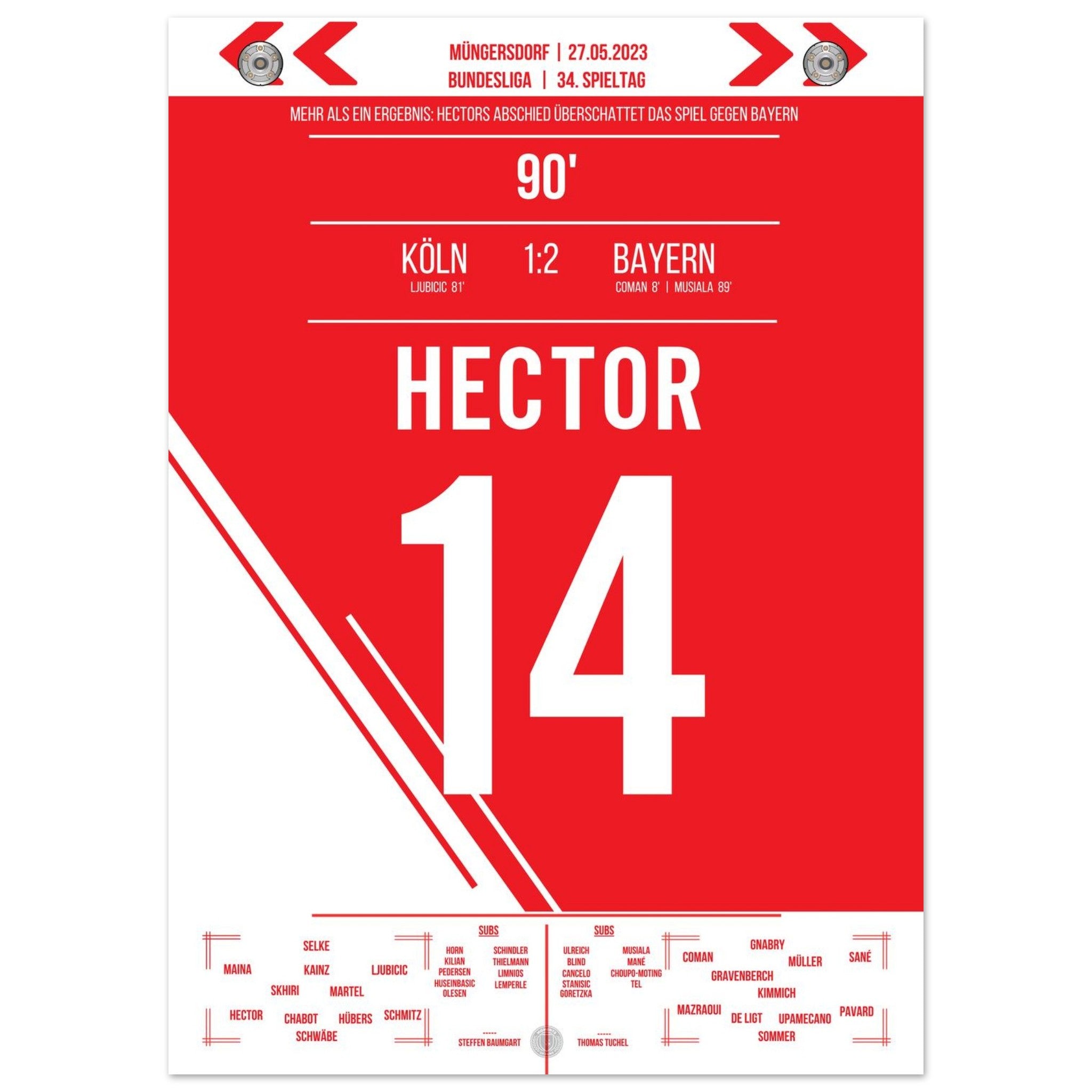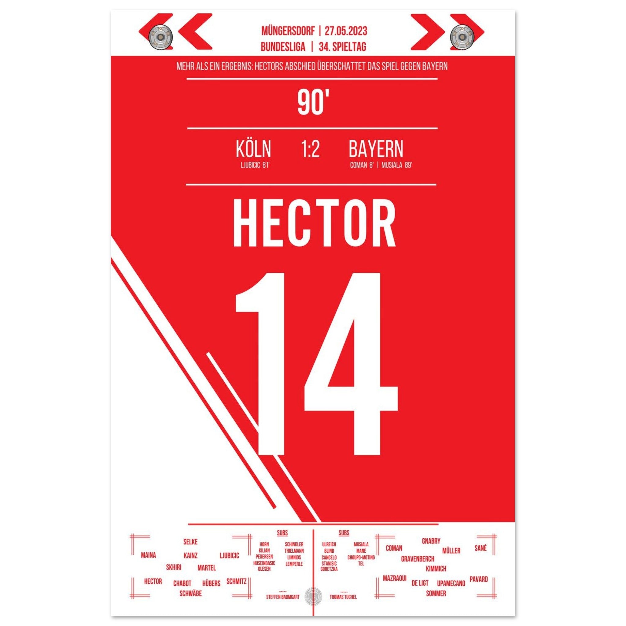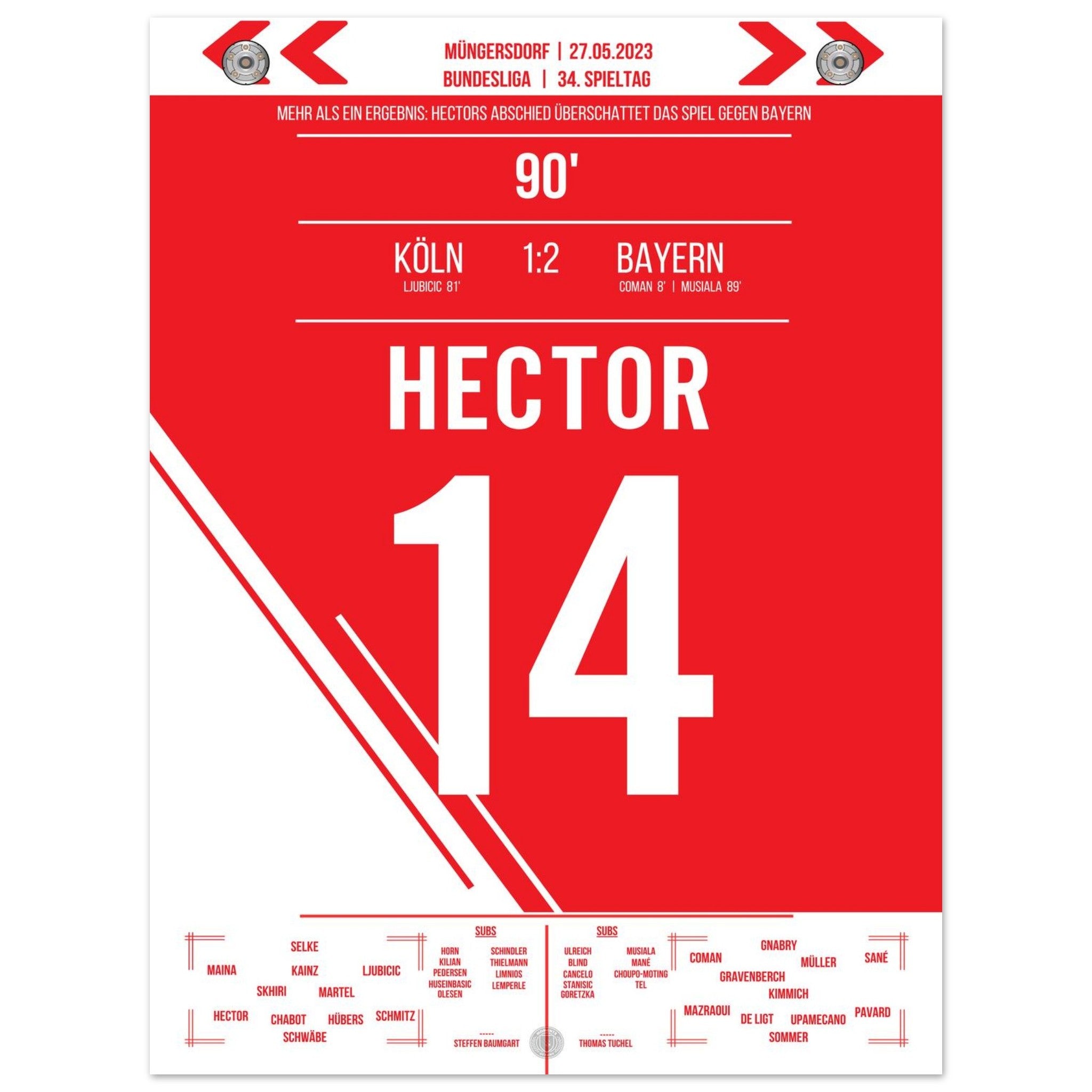 27. Mai 2023 – Köln vs. Bayern 1:2: Ein letztes Mal führt Jonas Hector den FC als Kapitän aufs Feld – gegen die Bayern verabschiedet sich die Vereinsikone nach über einem Jahrzehnt mit großem Applaus und Tränen in den Augen. Ein Moment voller Stolz, Dankbarkeit und Emotion. Unser Poster hält diesen würdevollen Abschied für immer fest.