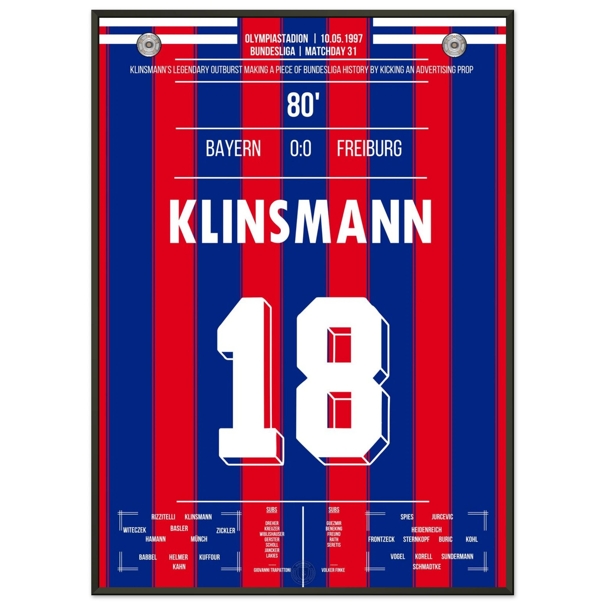 Ein torloses Remis mit legendärem Nachspiel: Nach seiner Auswechslung verliert Jürgen Klinsmann die Nerven und tritt wutentbrannt gegen eine Werbetonne – ein ikonischer Moment zwischen Frust und Leidenschaft.