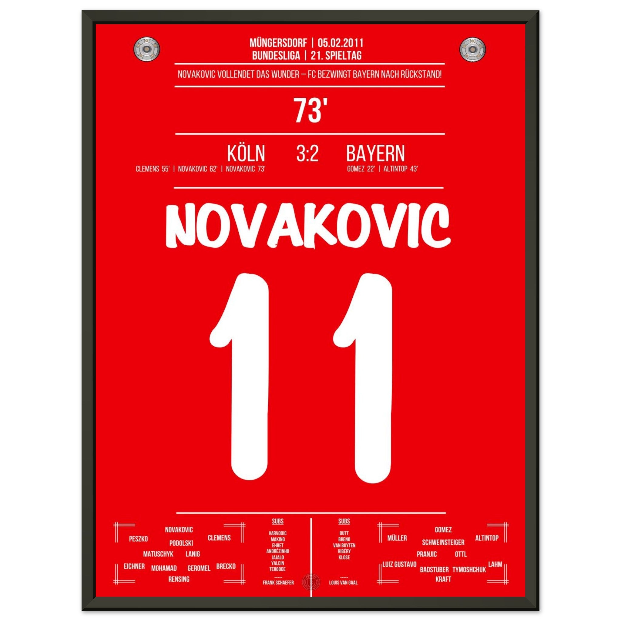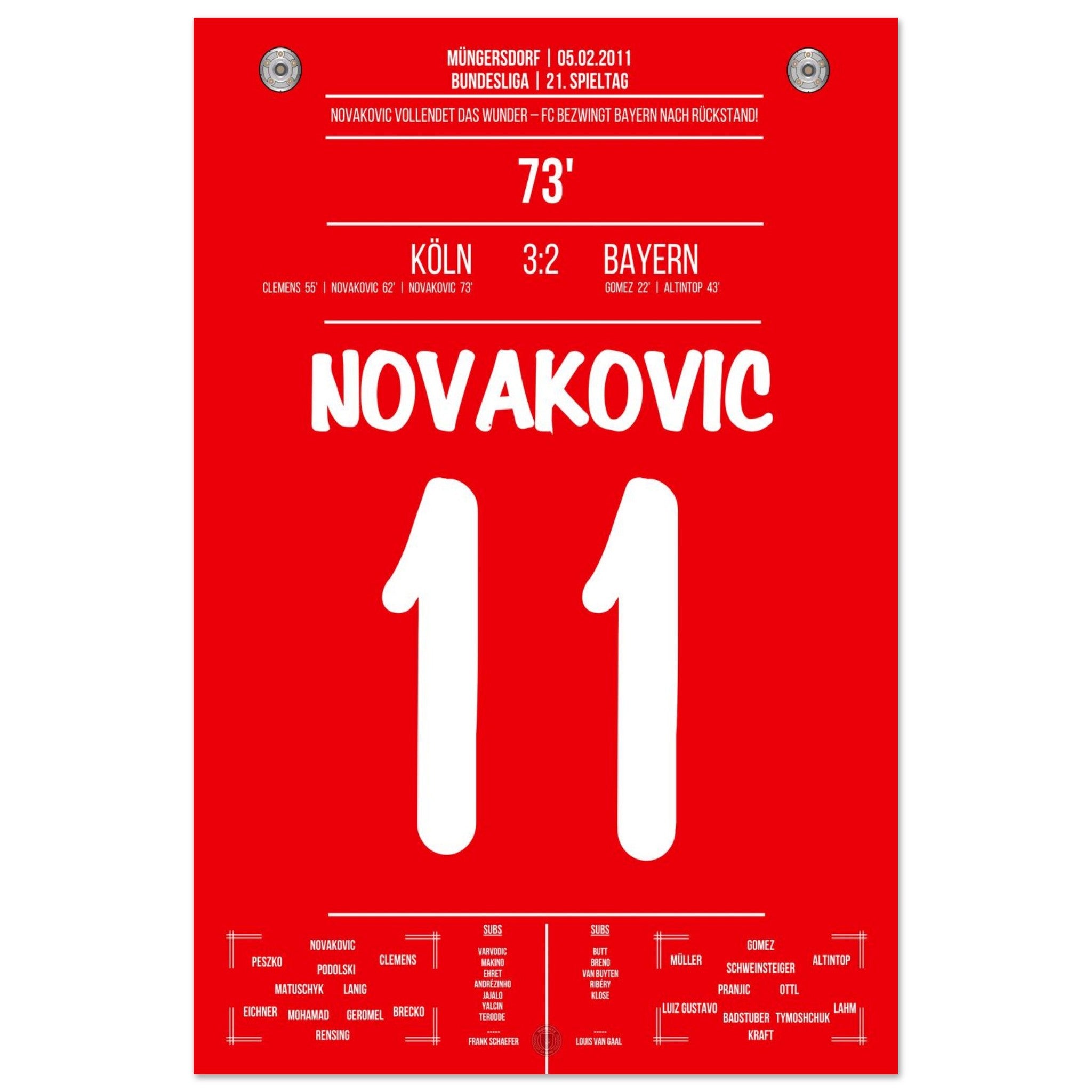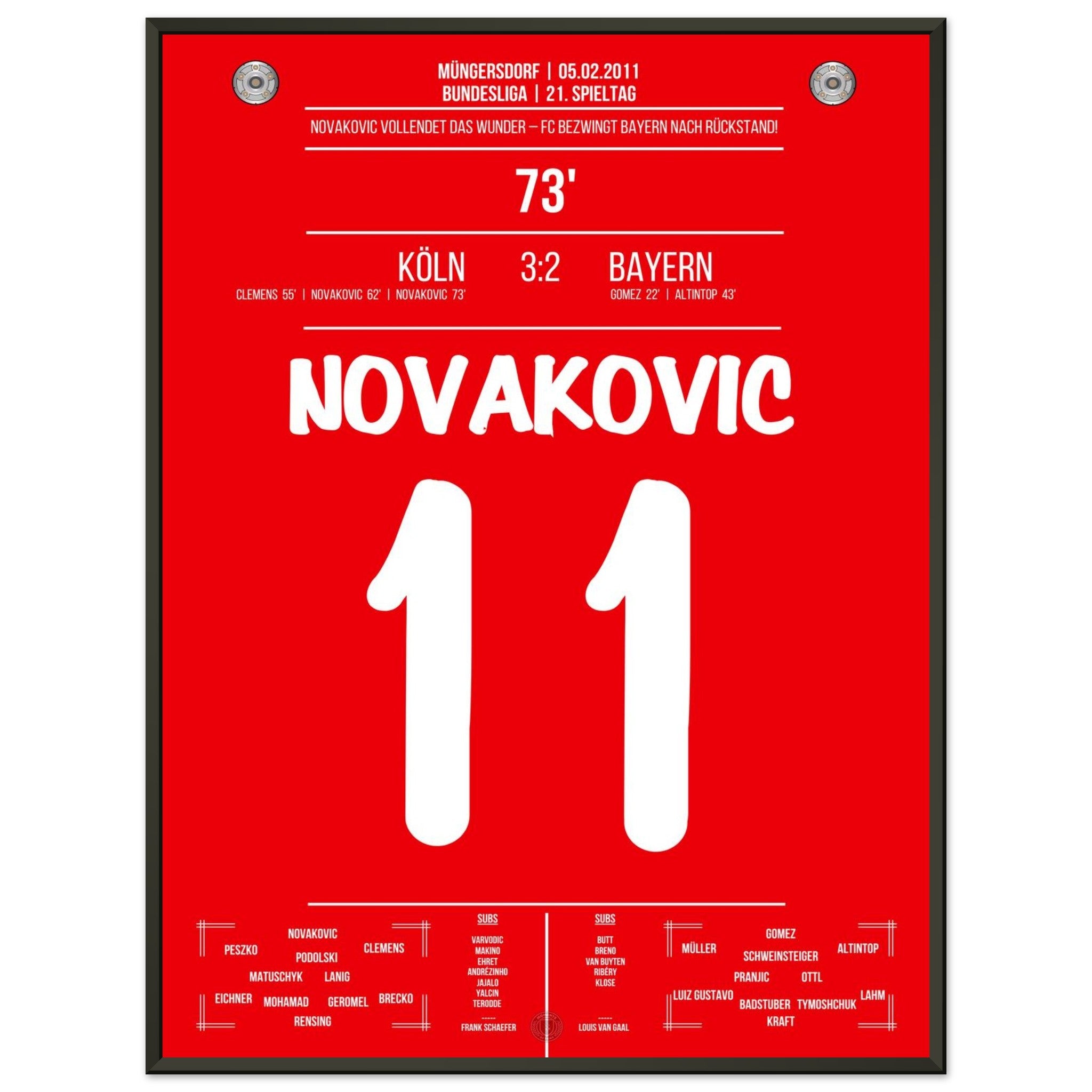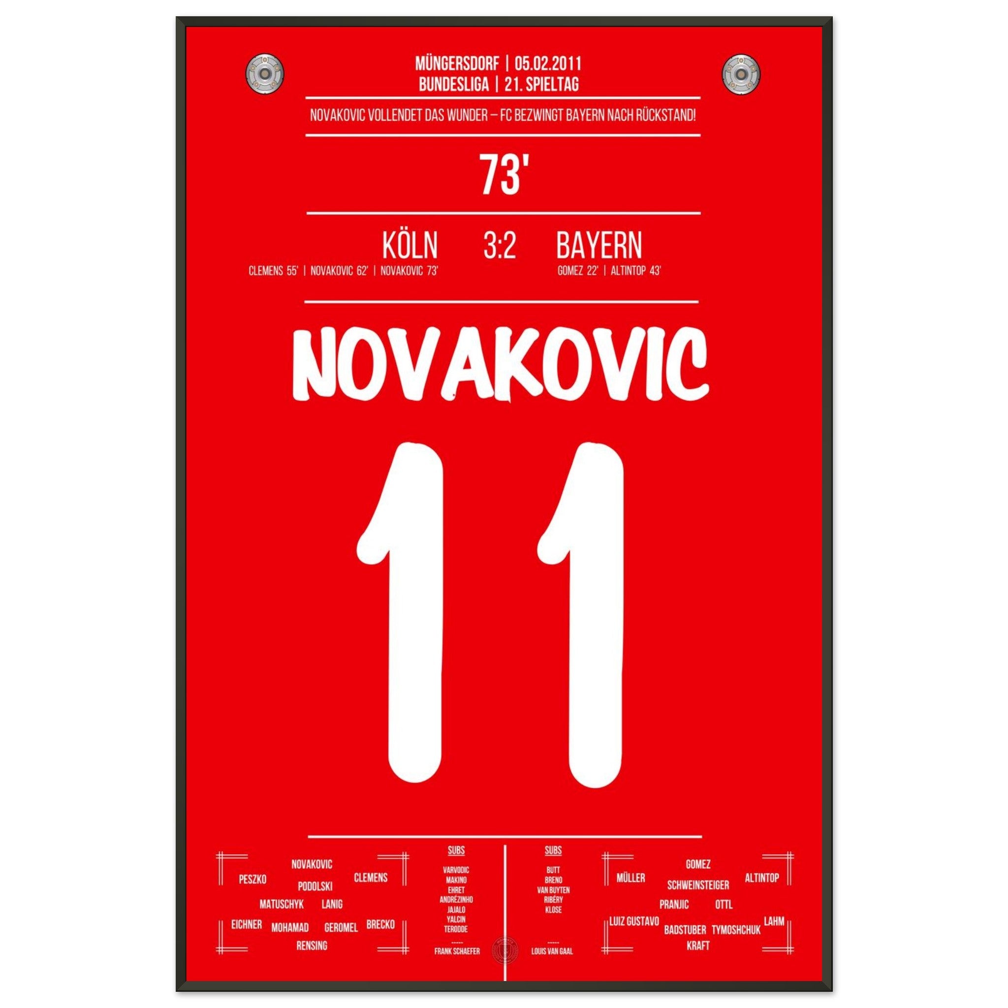 5. Februar 2011 – Köln vs. Bayern 3:2: Milivoje Novakovic dreht mit zwei Treffern einen 0:2-Rückstand gegen Bayern und schießt Köln zum Überraschungssieg. Ein Spiel voller Kampfgeist und Leidenschaft. Unser Poster verewigt diesen legendären Moment in Rot-Weiß.