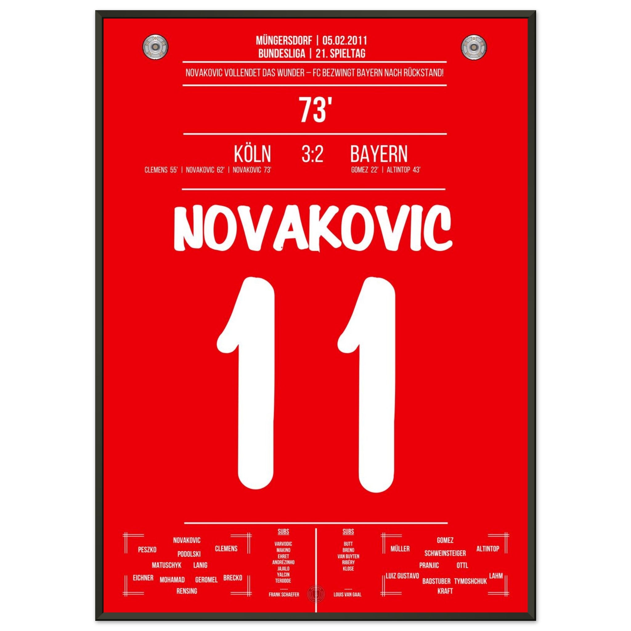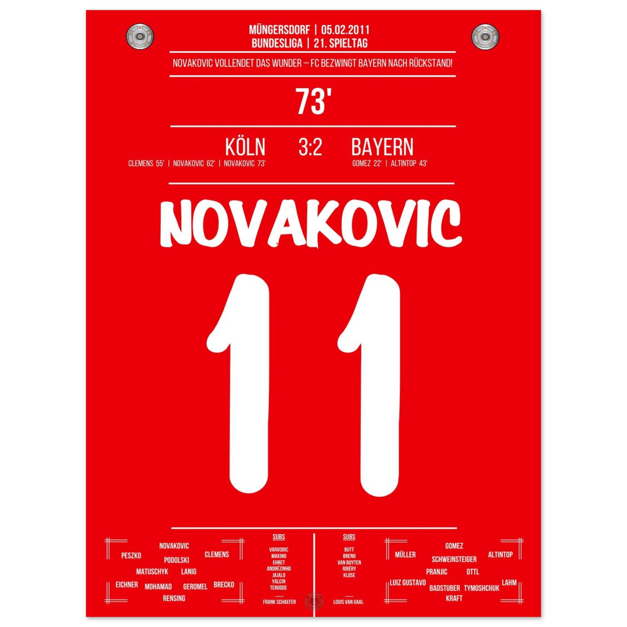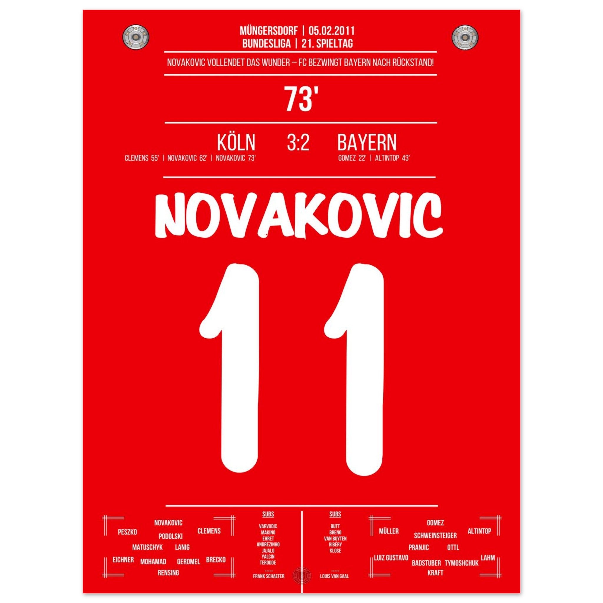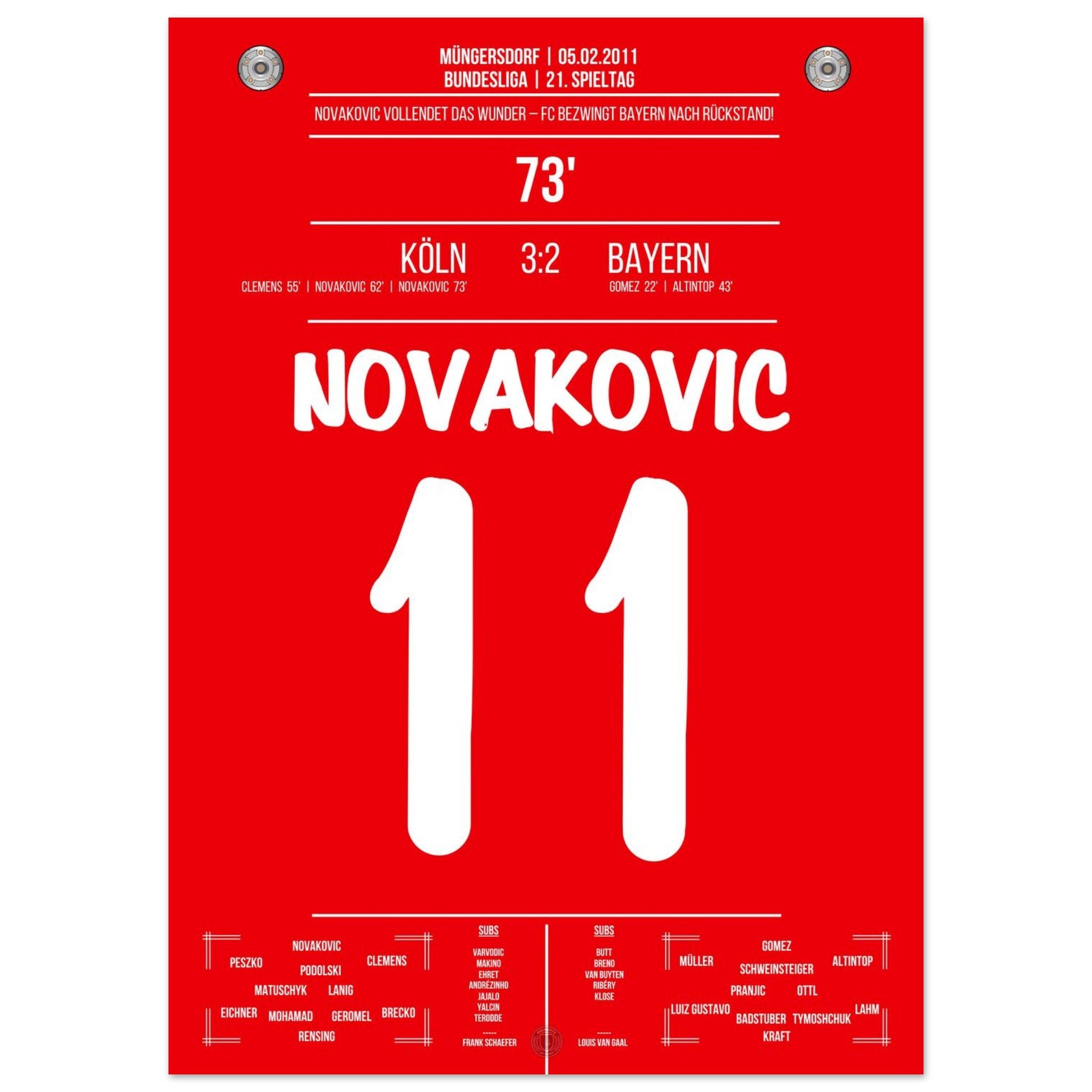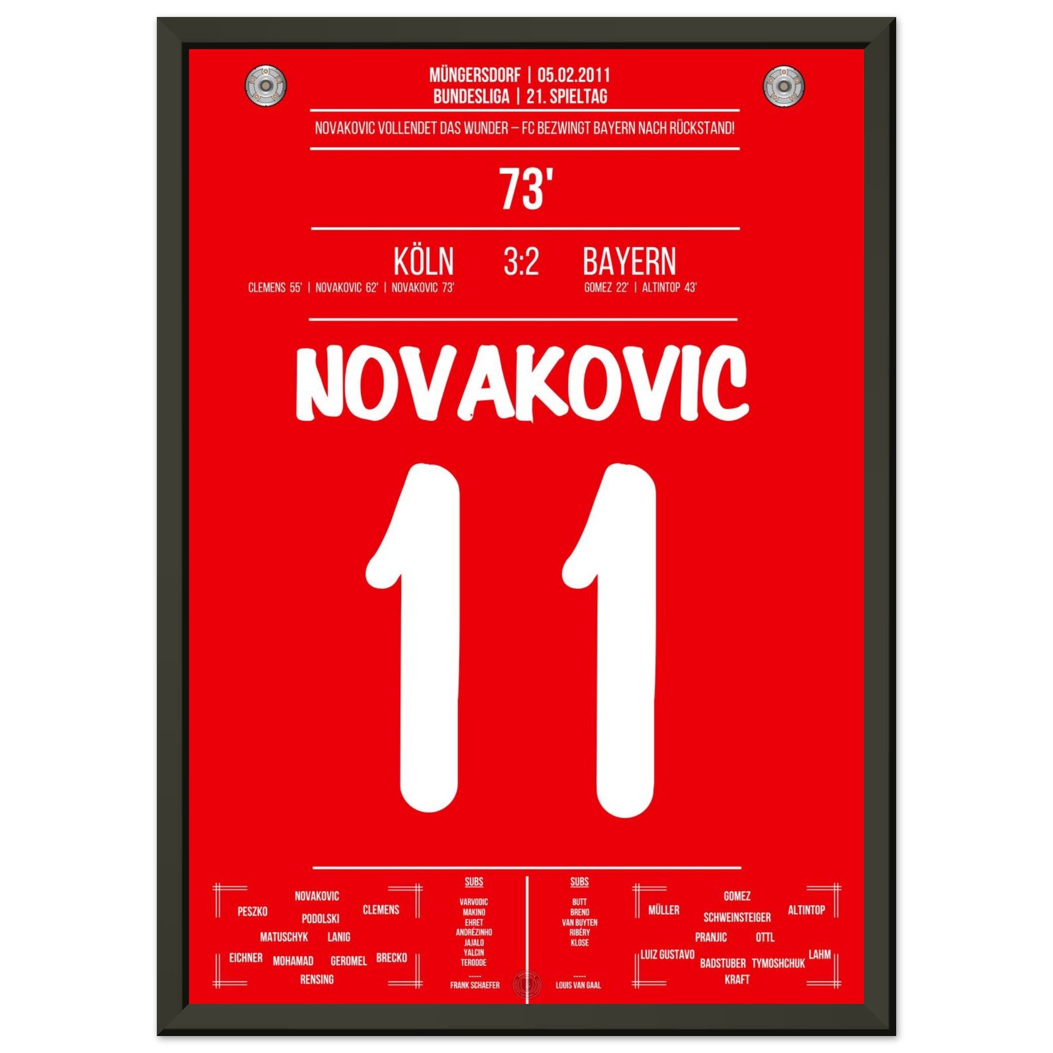 5. Februar 2011 – Köln vs. Bayern 3:2: Milivoje Novakovic dreht mit zwei Treffern einen 0:2-Rückstand gegen Bayern und schießt Köln zum Überraschungssieg. Ein Spiel voller Kampfgeist und Leidenschaft. Unser Poster verewigt diesen legendären Moment in Rot-Weiß.