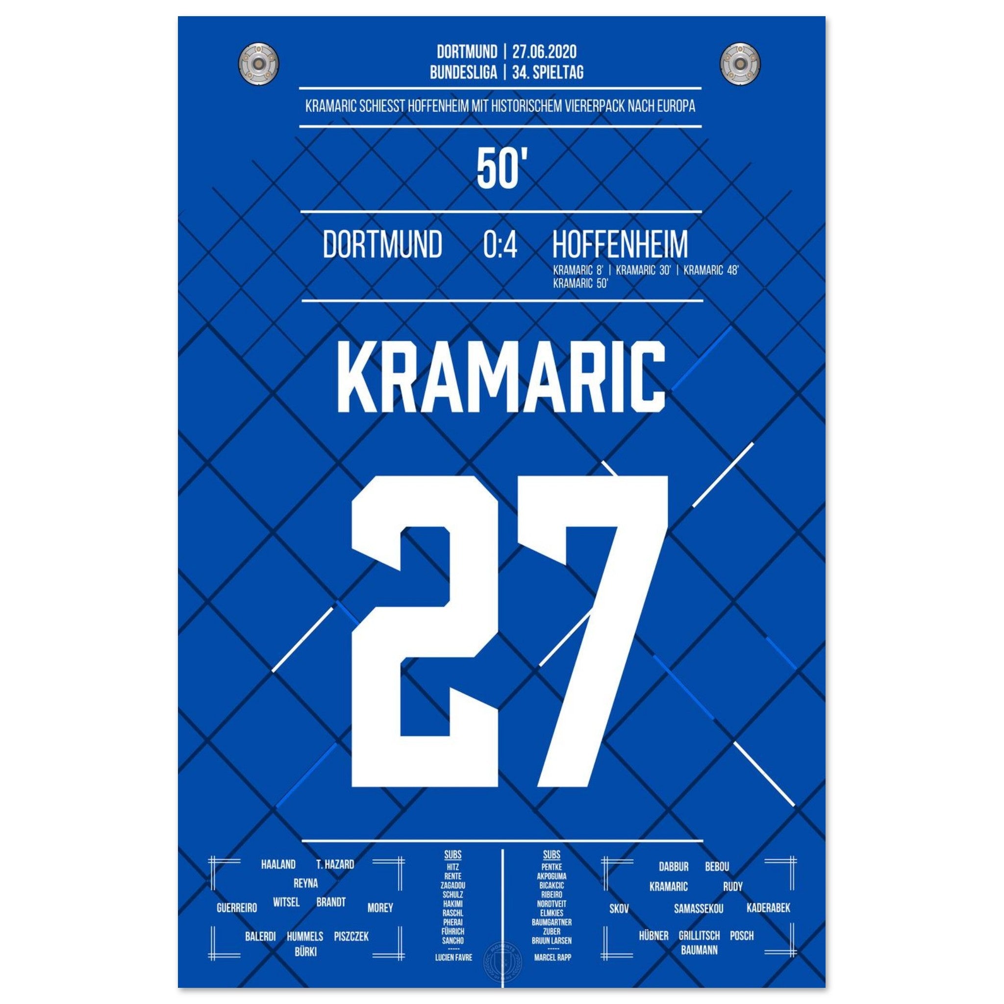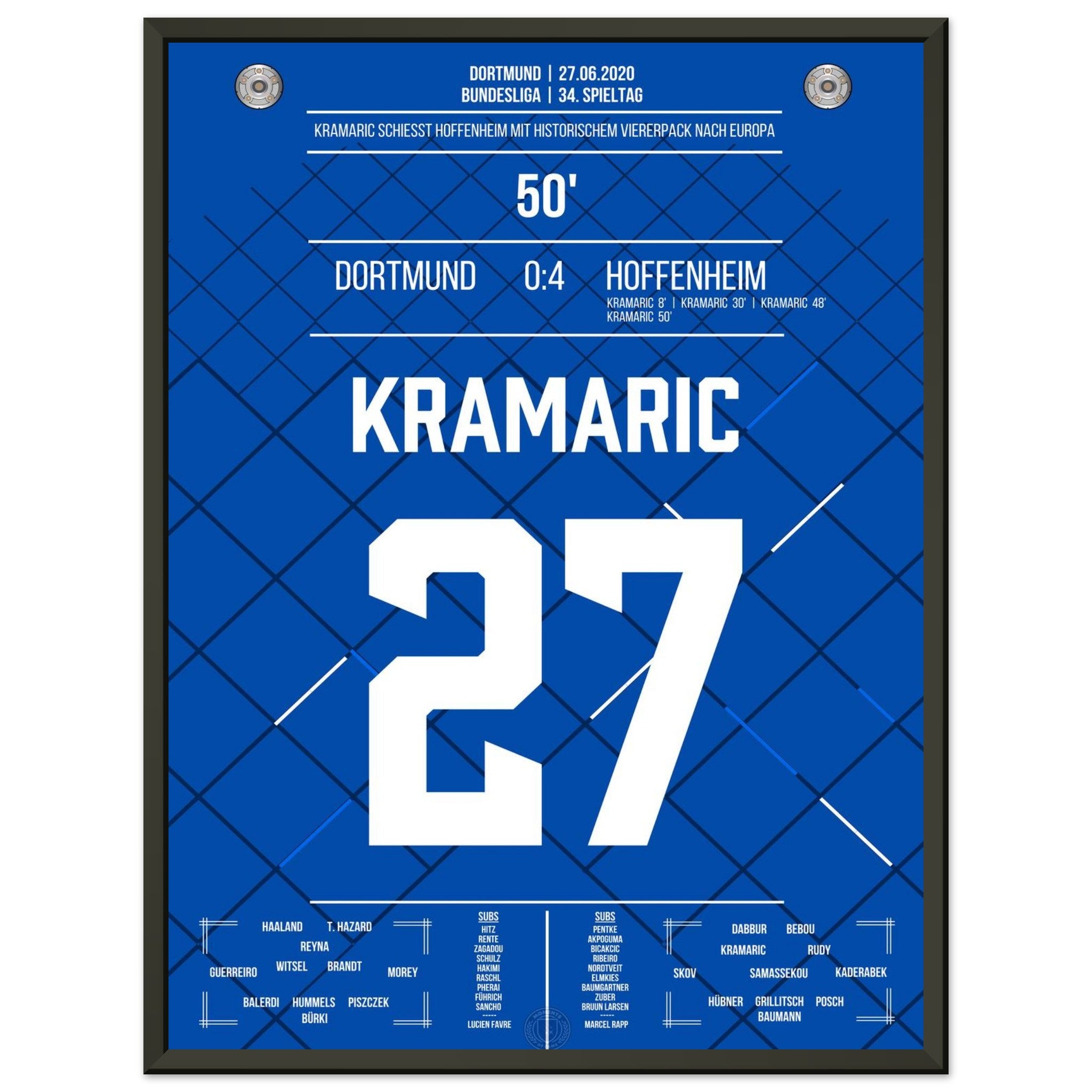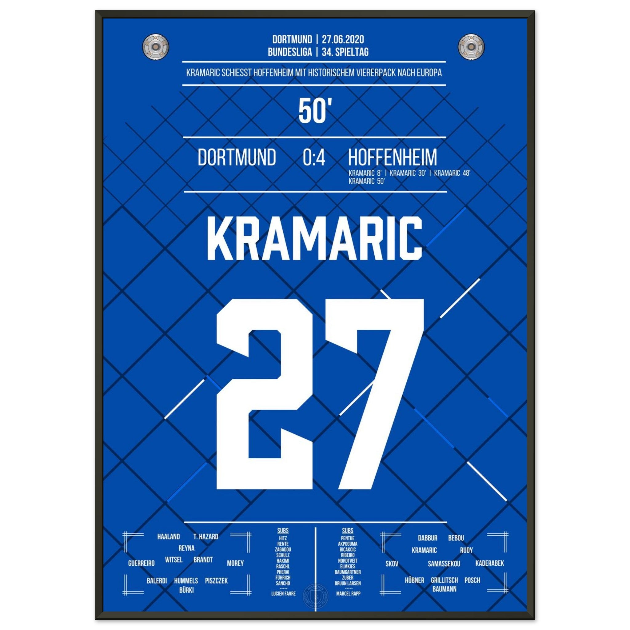 27. Juni 2020 – Dortmund vs. Hoffenheim 0:4: Andrej Kramarić erzielt alle vier Tore beim Auswärtssieg und schockt Dortmund mit einem historischen Viererpack. Eine individuelle Glanzleistung, wie sie die Bundesliga selten gesehen hat. Unser Poster hält diesen magischen Tag für alle Hoffenheim-Fans fest.
