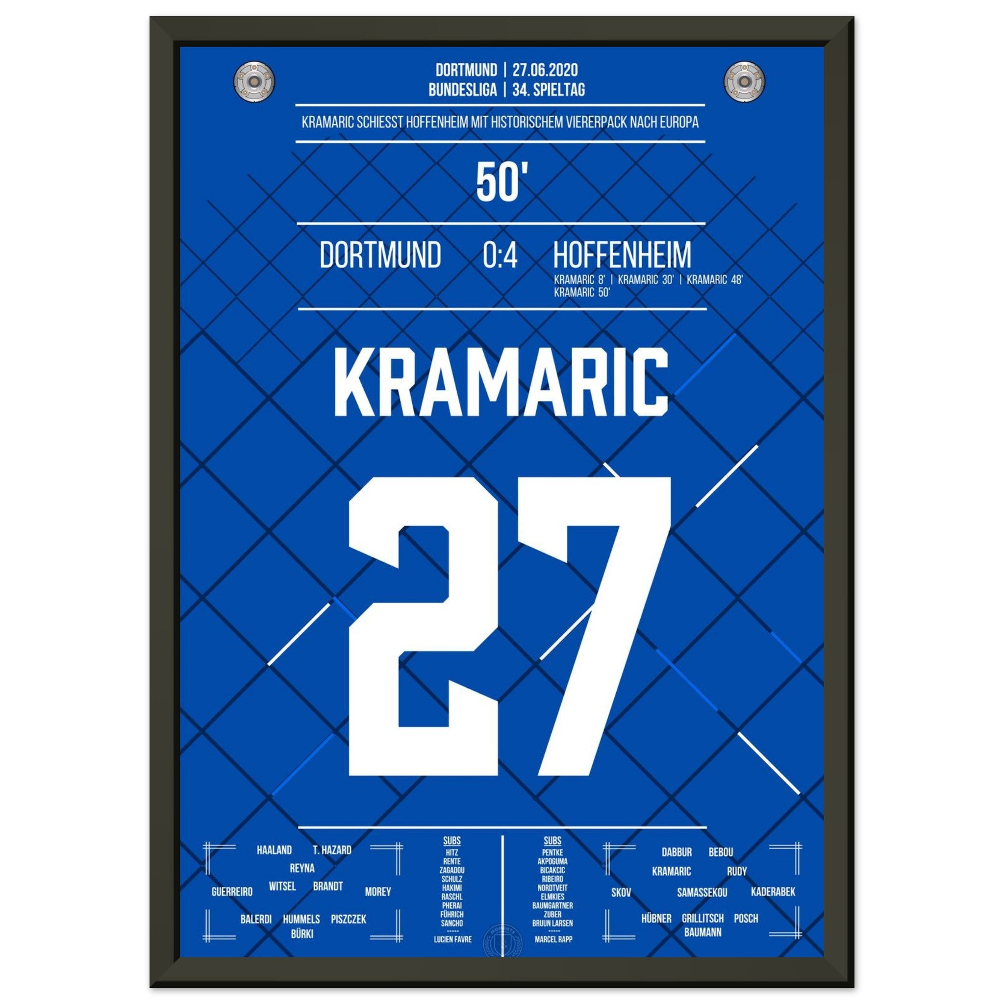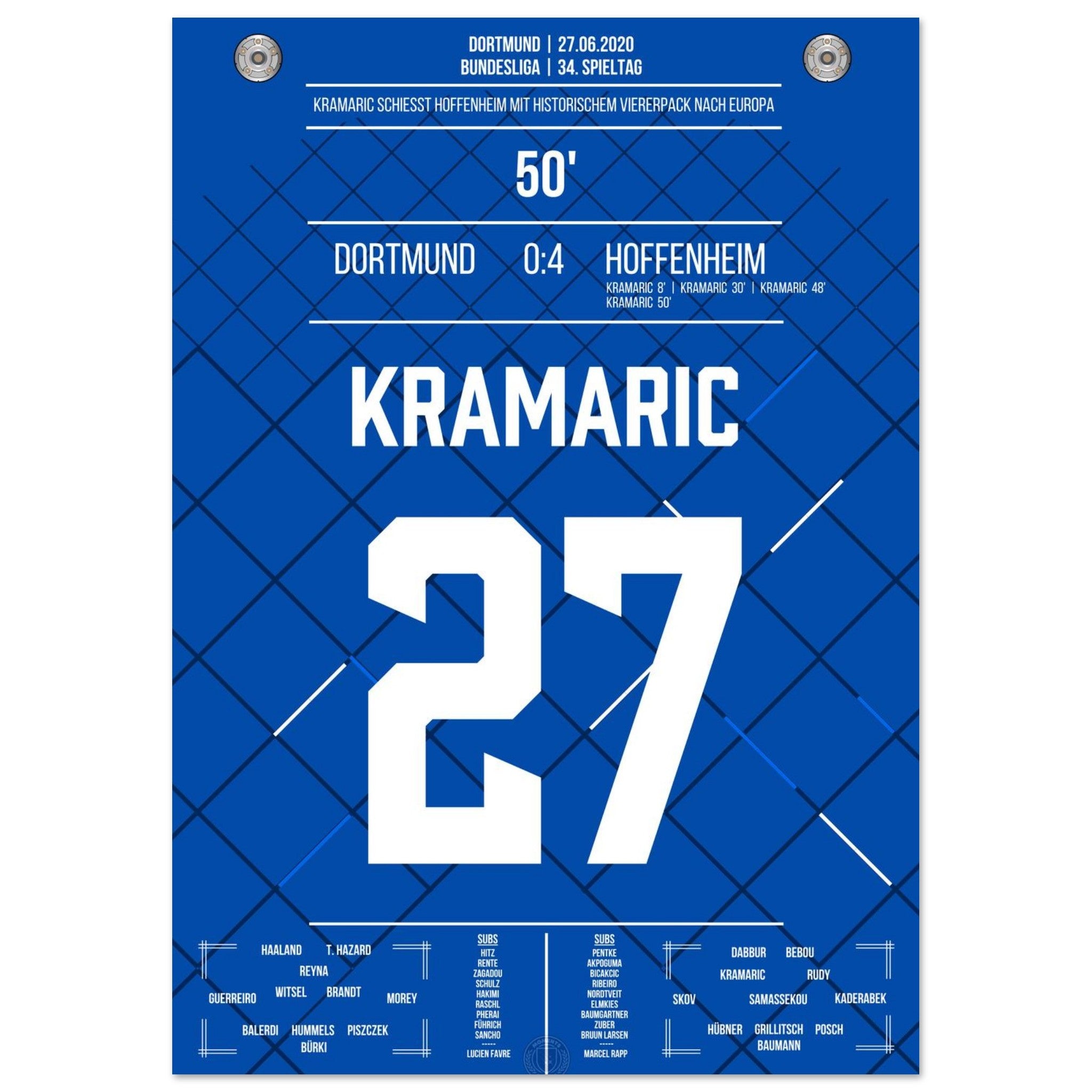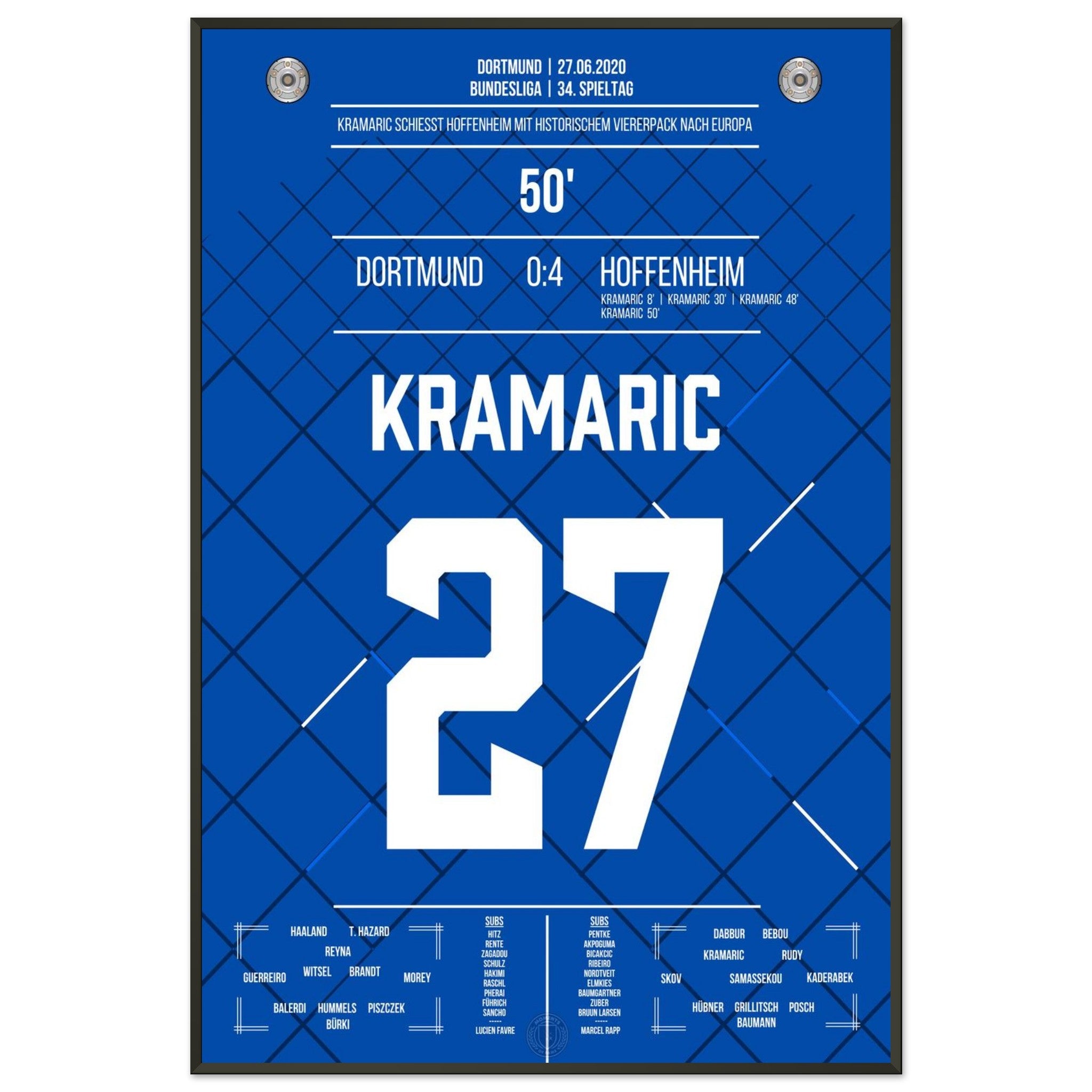 27. Juni 2020 – Dortmund vs. Hoffenheim 0:4: Andrej Kramarić erzielt alle vier Tore beim Auswärtssieg und schockt Dortmund mit einem historischen Viererpack. Eine individuelle Glanzleistung, wie sie die Bundesliga selten gesehen hat. Unser Poster hält diesen magischen Tag für alle Hoffenheim-Fans fest.