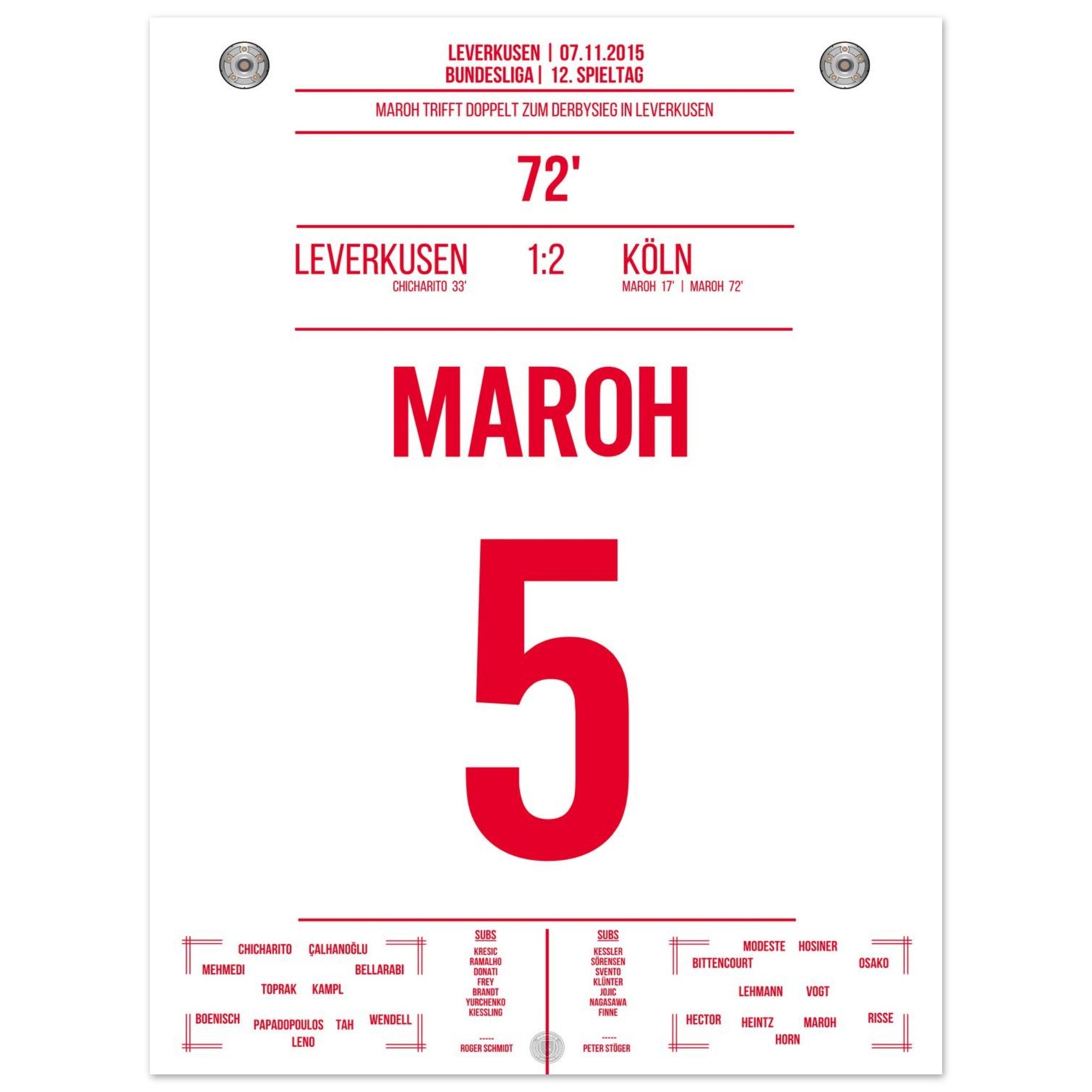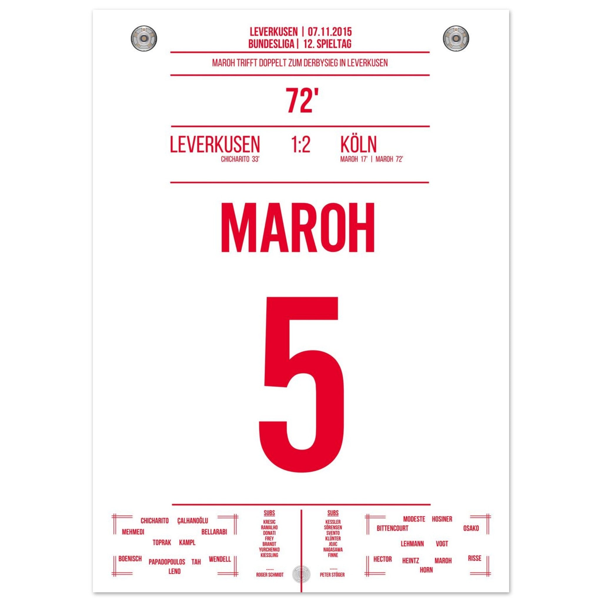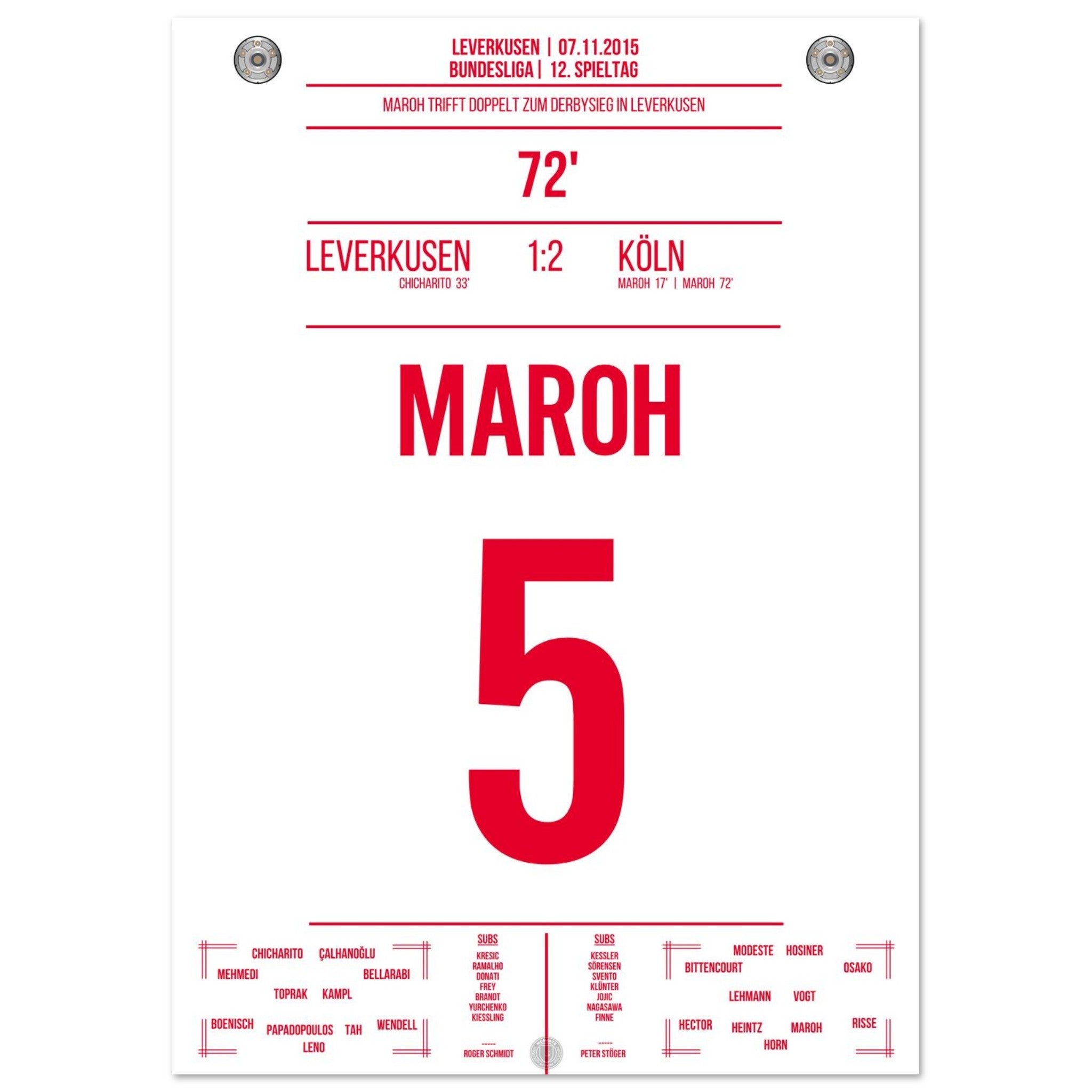 7. November 2015 – Leverkusen vs. Köln 1:2: In der 72. Minute trifft Dominique Maroh nach einem Eckball zur Führung und entscheidet das umkämpfte Rheinderby für den FC. Ein Sieg voller Emotionen und Derby-Feuer. Unser Poster hält diesen unvergesslichen Moment in Rot-Weiß fest.