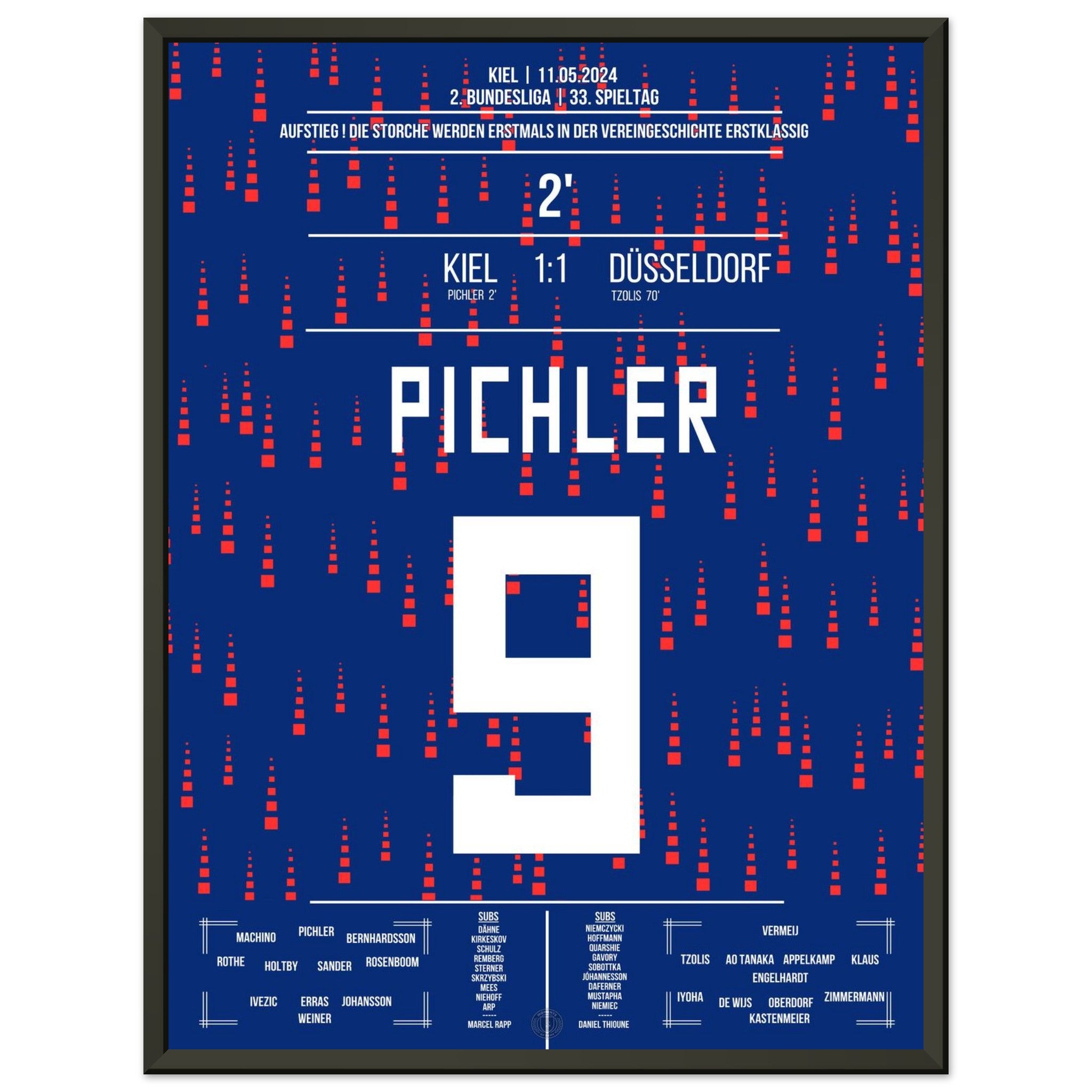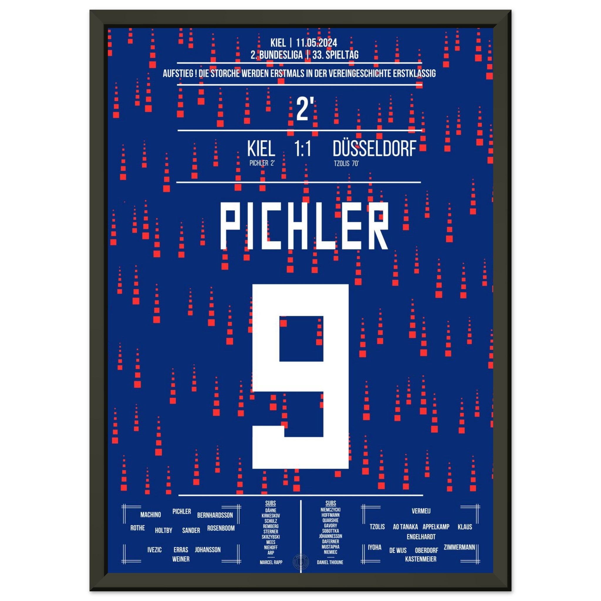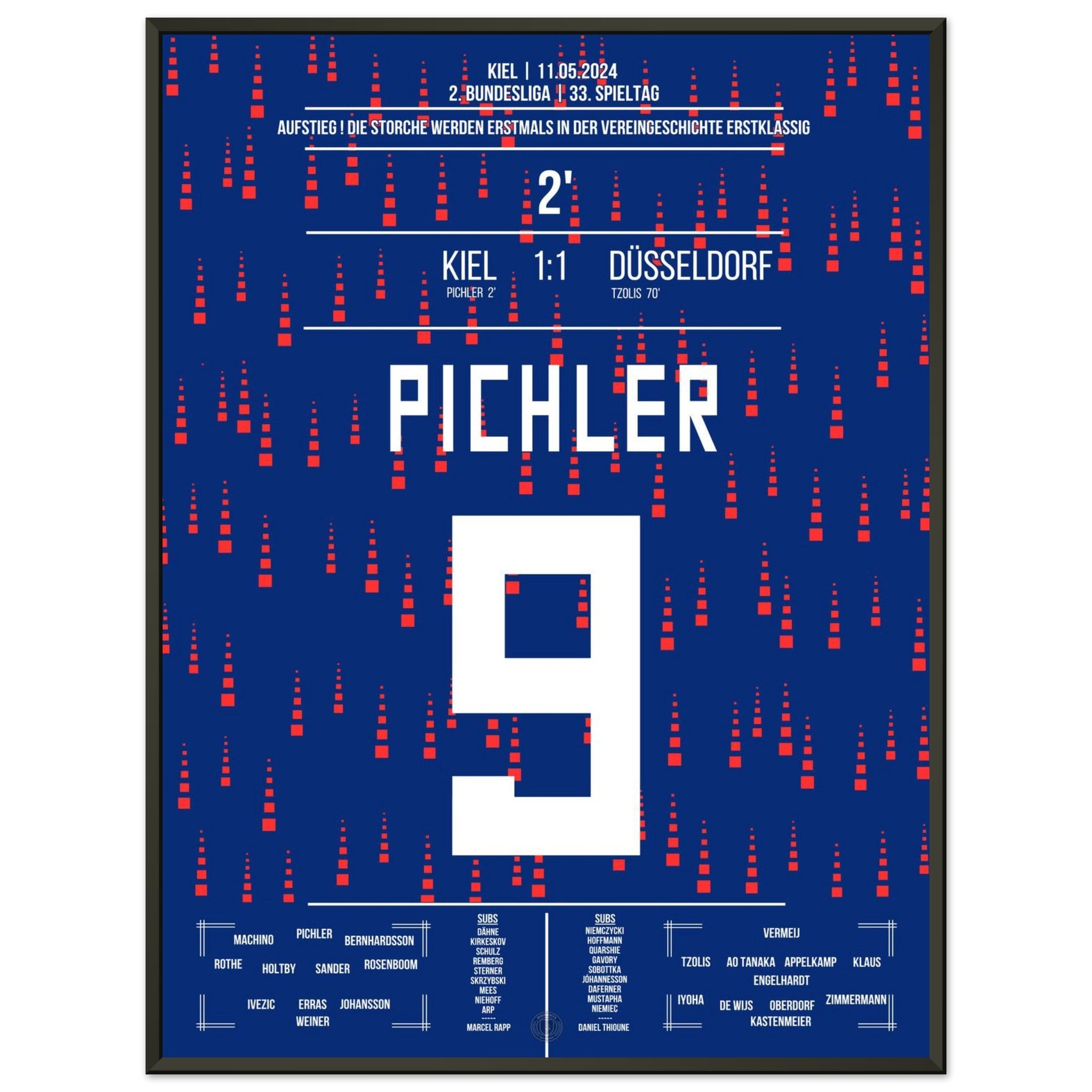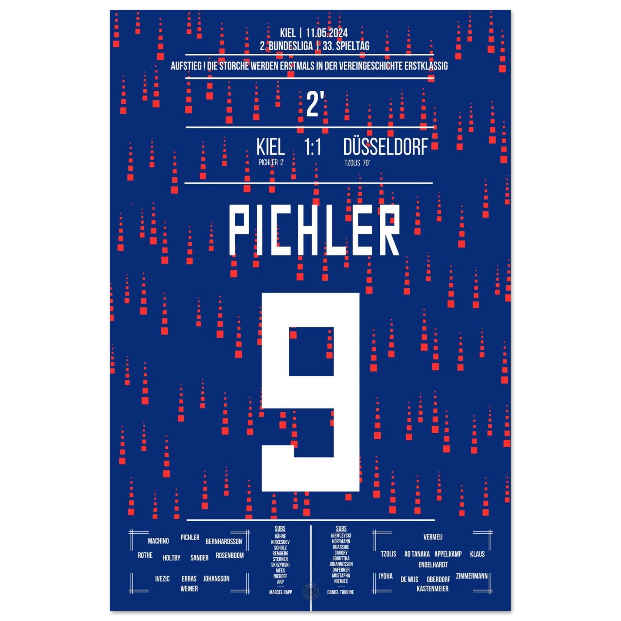 11. Mai 2024 – Kiel vs. Düsseldorf 1:1: In einem nervenaufreibenden Aufstiegsduell erzielt Benedikt Pichler das entscheidende Tor und schreibt Geschichte: Sein Treffer bringt Kiel erstmals überhaupt in die Bundesliga. Ein unvergesslicher Moment für Stadt, Verein und Fans. Unser Poster verewigt diesen historischen Augenblick für die Ewigkeit.