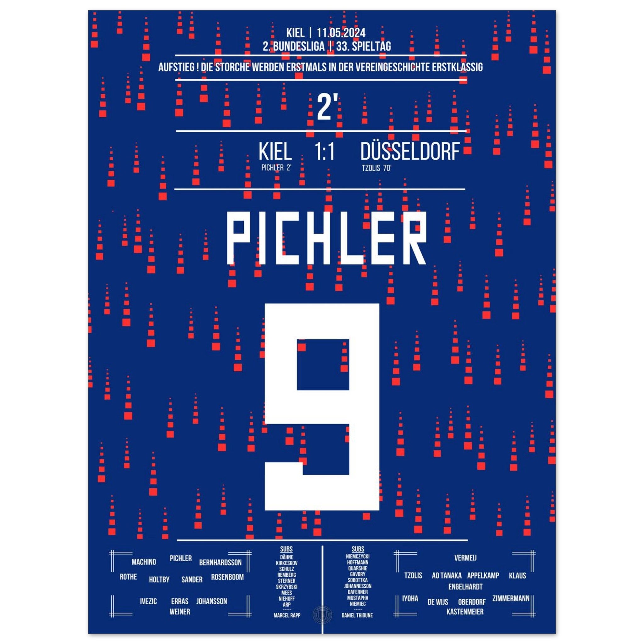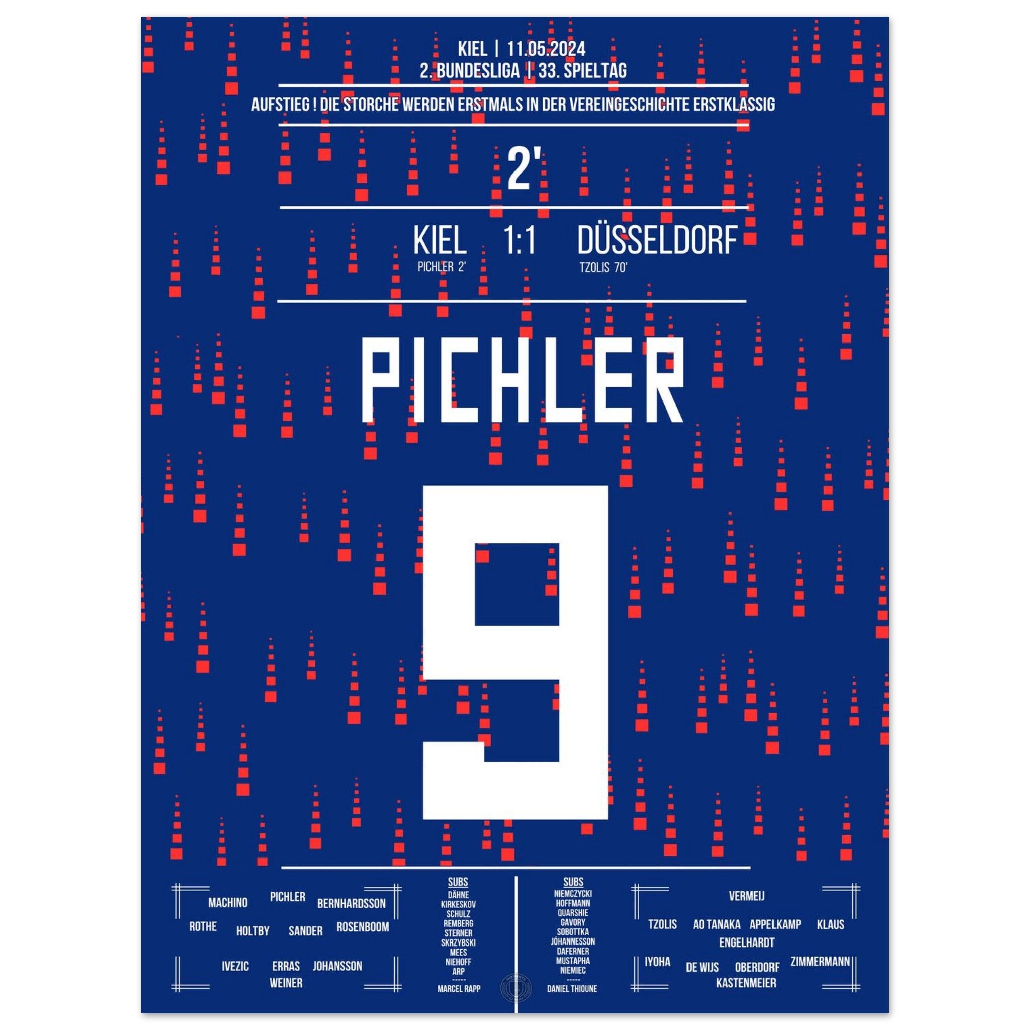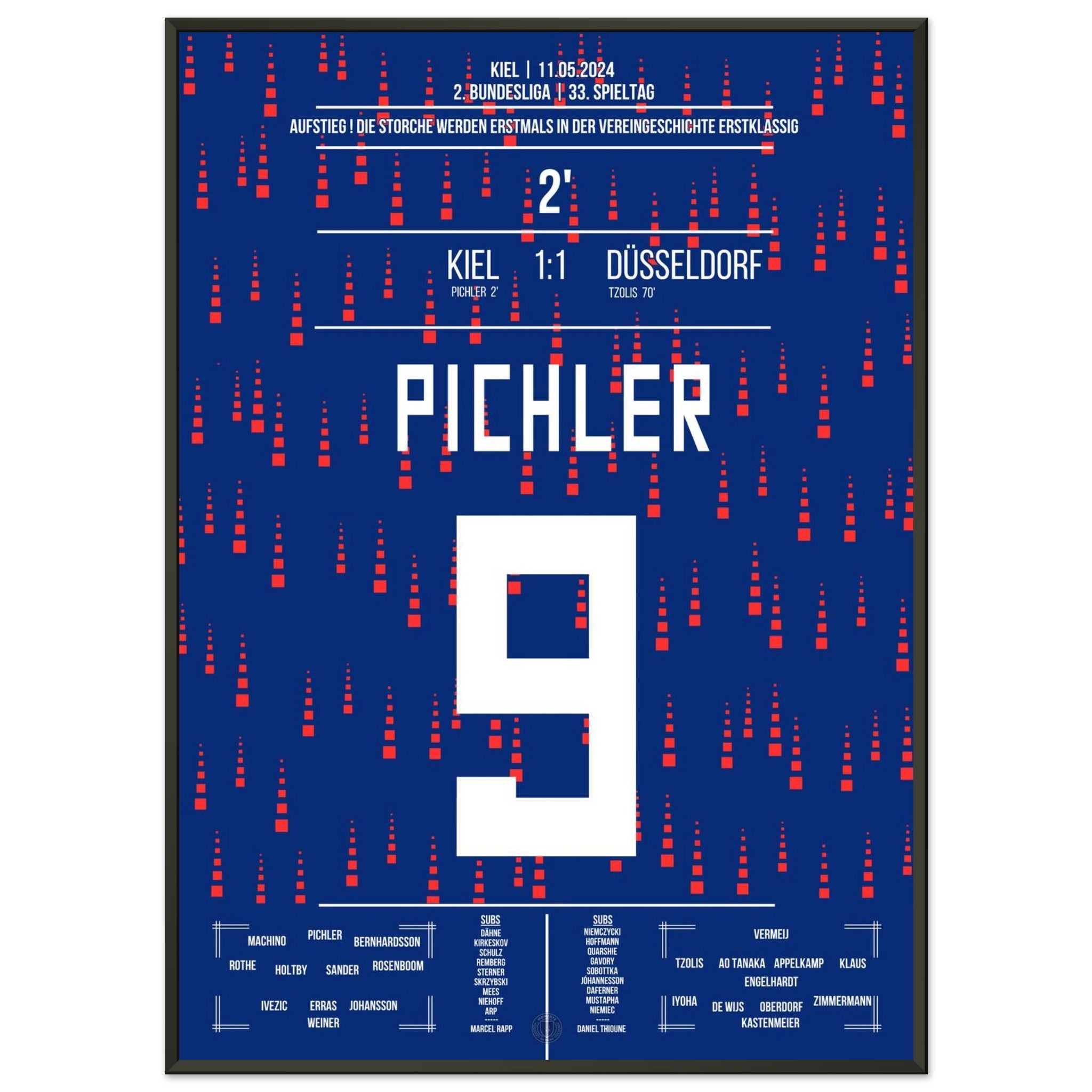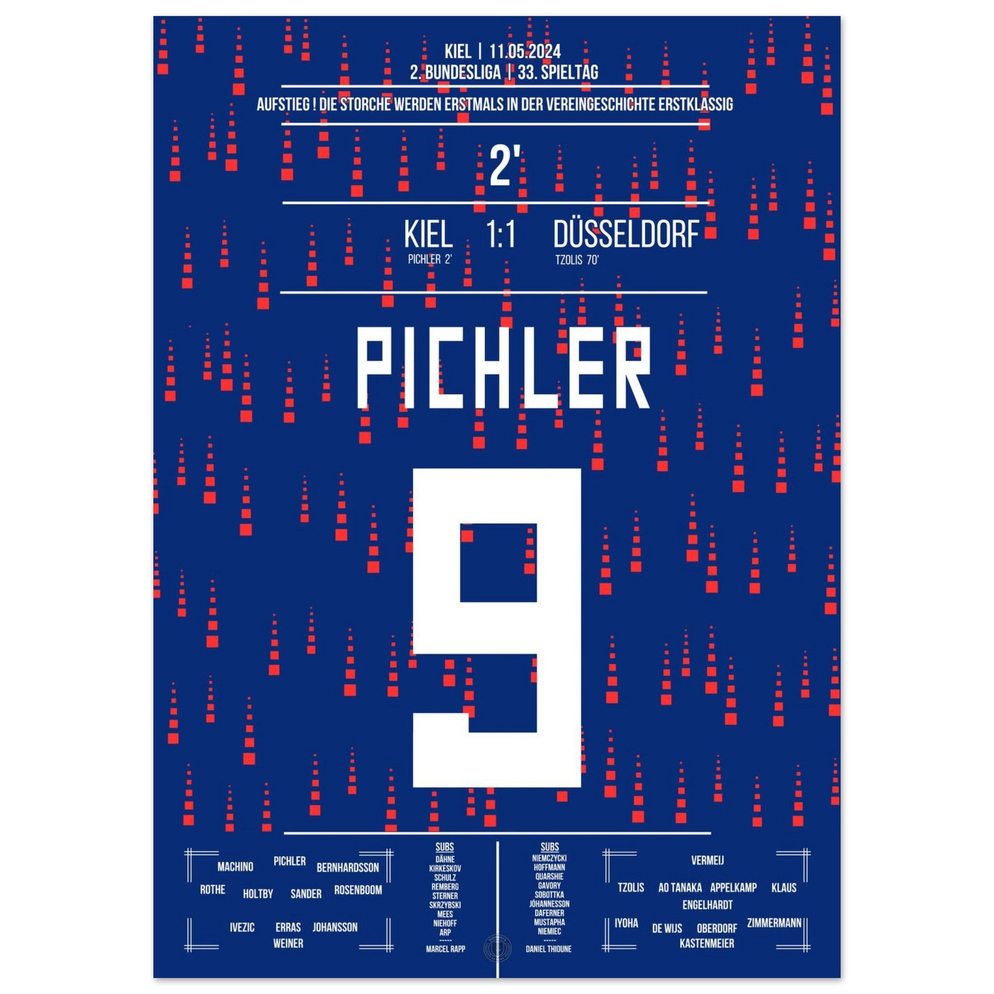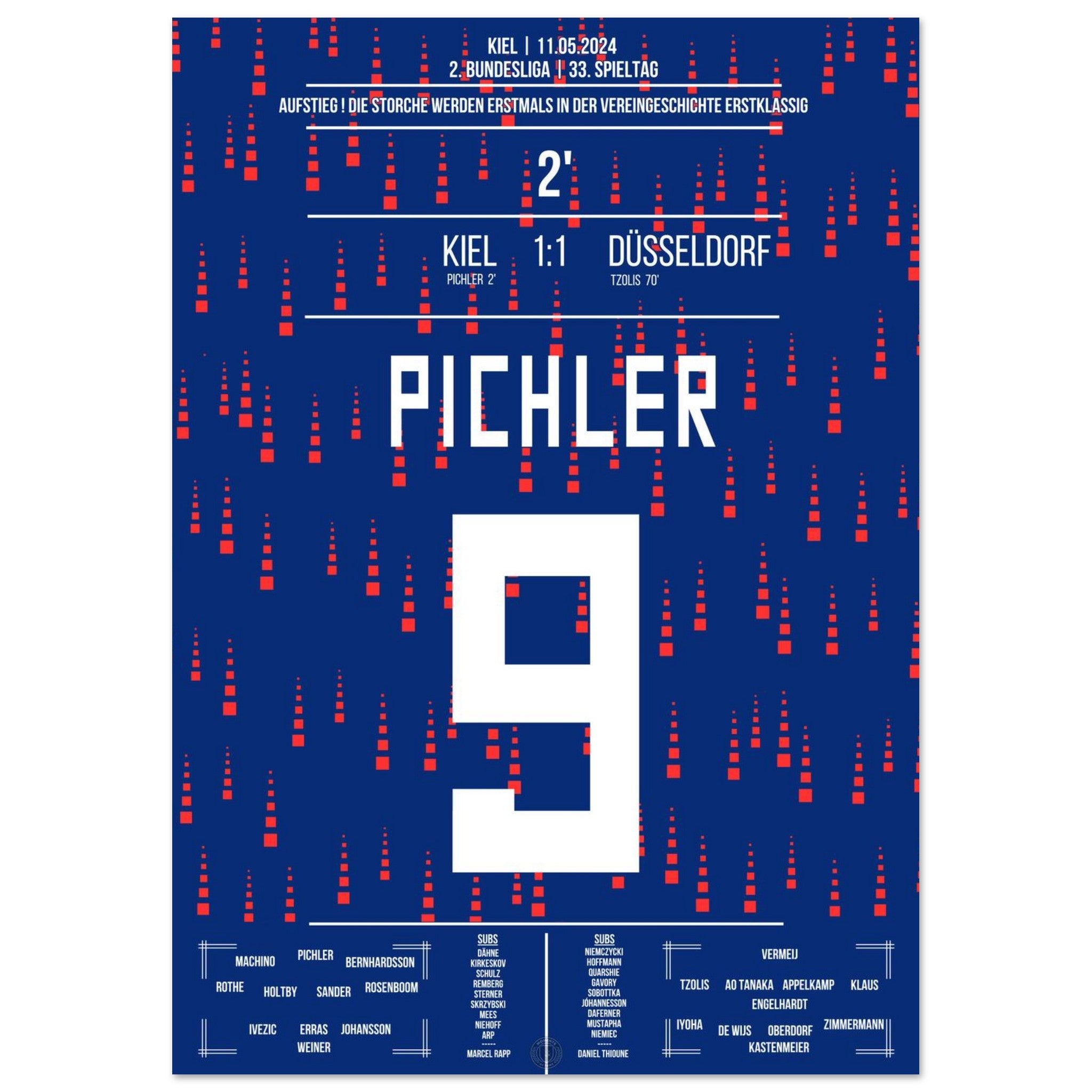 11. Mai 2024 – Kiel vs. Düsseldorf 1:1: In einem nervenaufreibenden Aufstiegsduell erzielt Benedikt Pichler das entscheidende Tor und schreibt Geschichte: Sein Treffer bringt Kiel erstmals überhaupt in die Bundesliga. Ein unvergesslicher Moment für Stadt, Verein und Fans. Unser Poster verewigt diesen historischen Augenblick für die Ewigkeit.