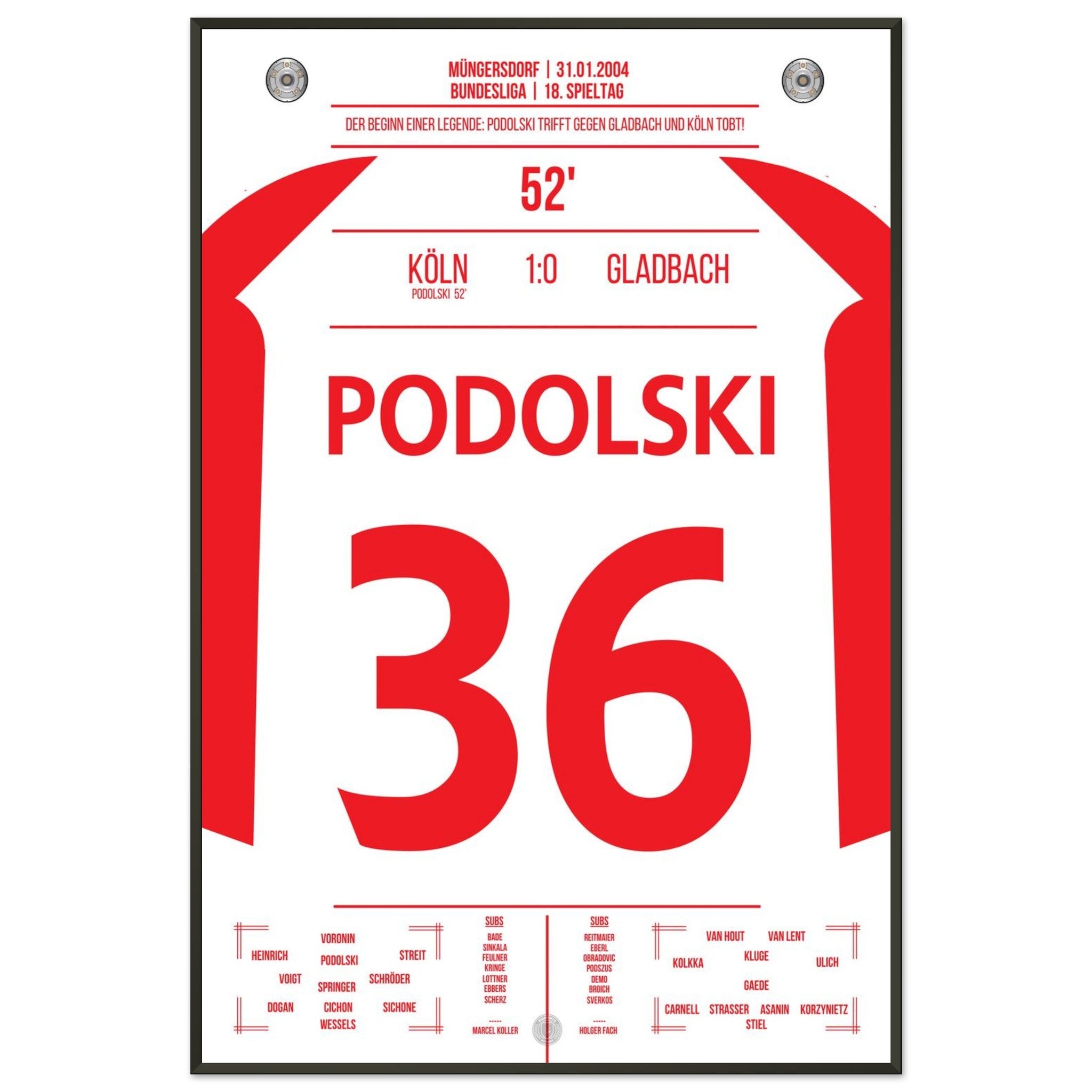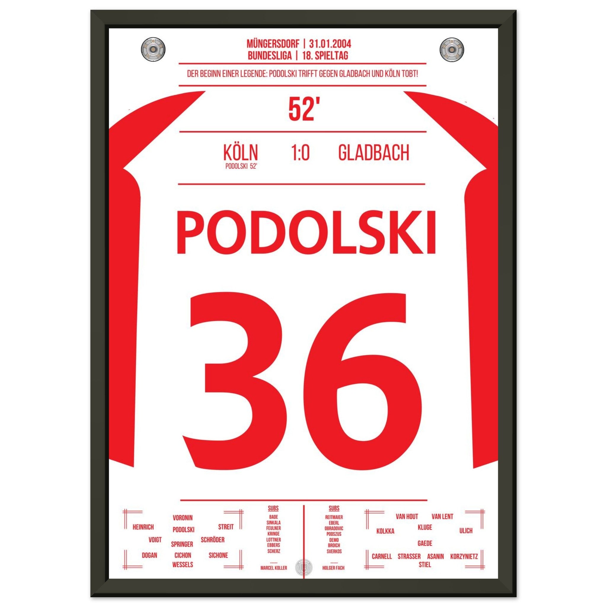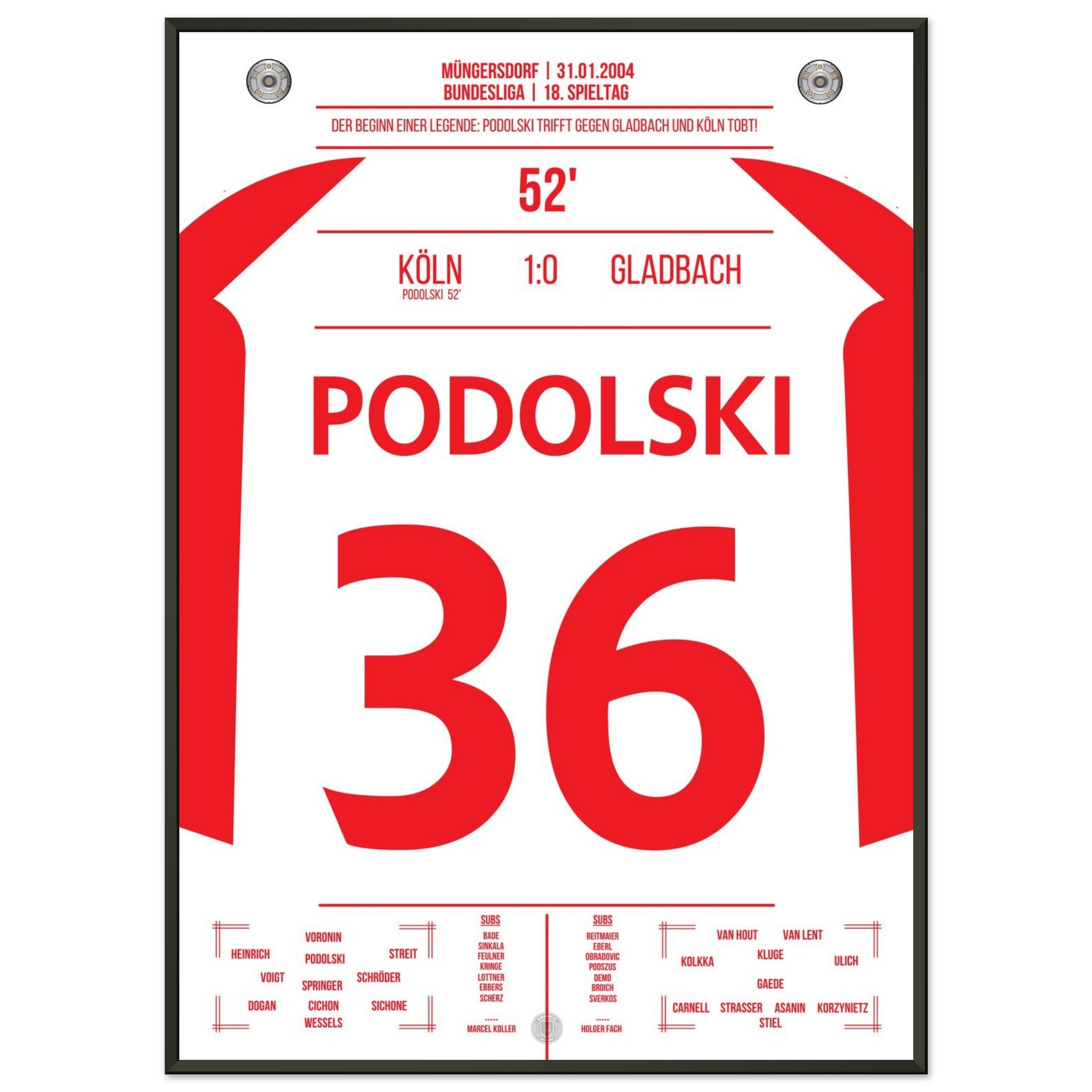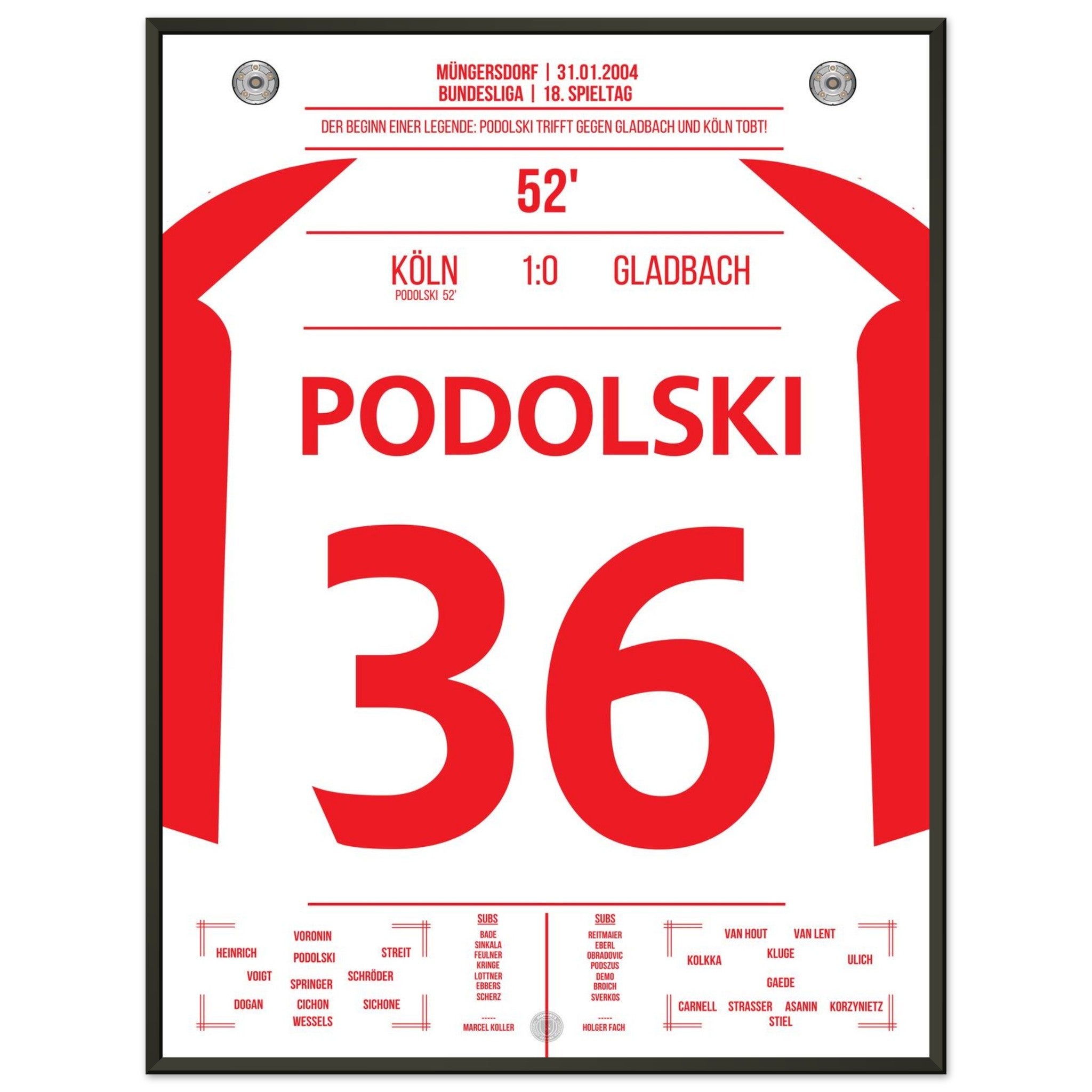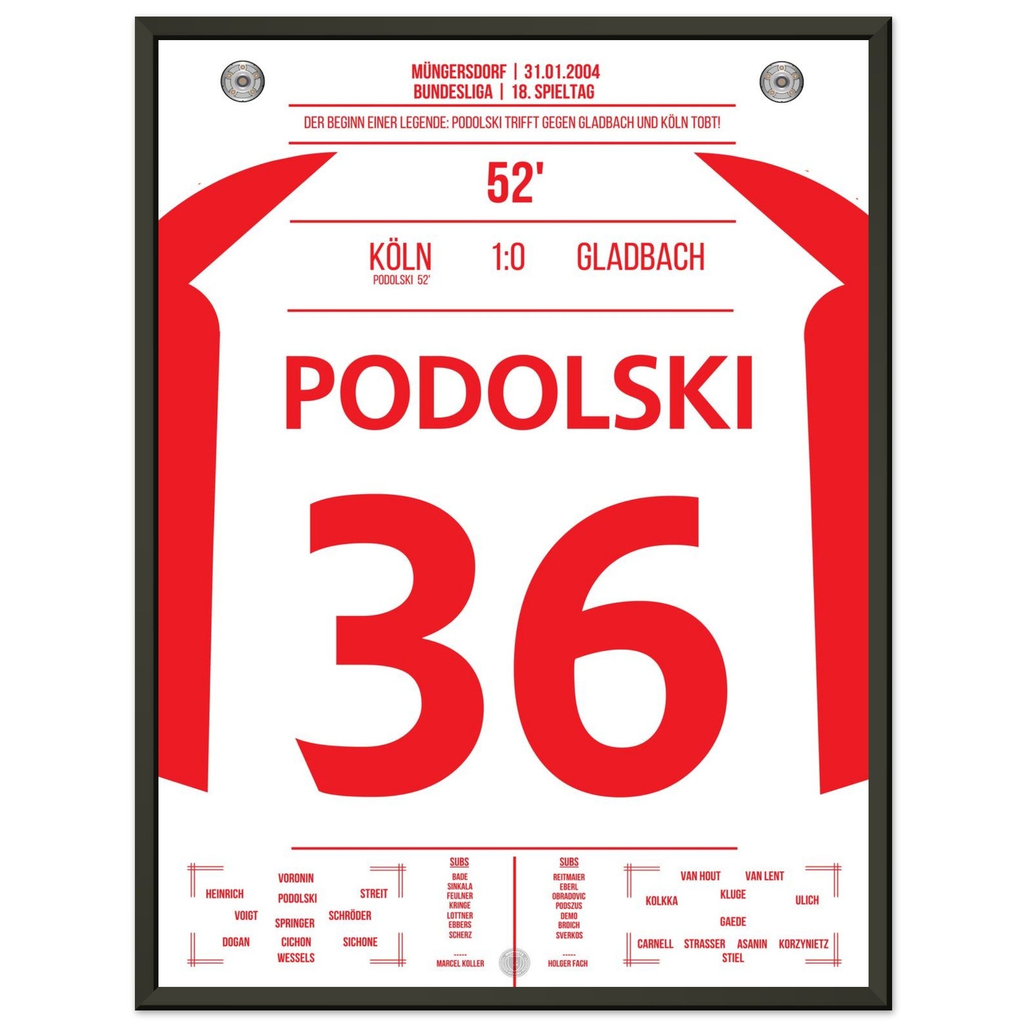 31. Januar 2004 – Köln vs. Mönchengladbach 1:0: In der 52. Minute trifft der junge Lukas Podolski im Derby zum einzigen Tor des Spiels und lässt das Müngersdorfer Stadion beben. Ein Vollspannkracher und der Beginn einer Legende. Unser Poster hält diesen besonderen Podolski-Moment in Rot-Weiß fest.