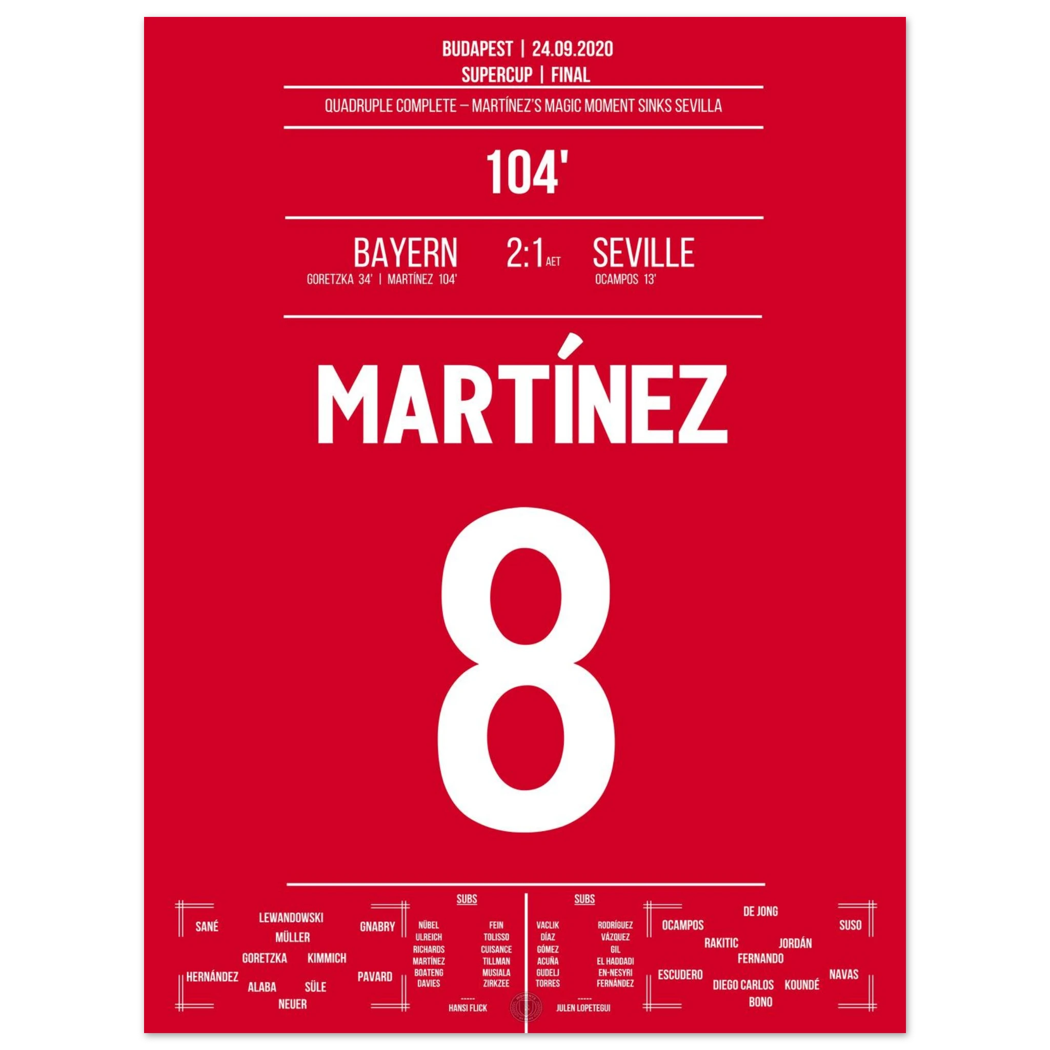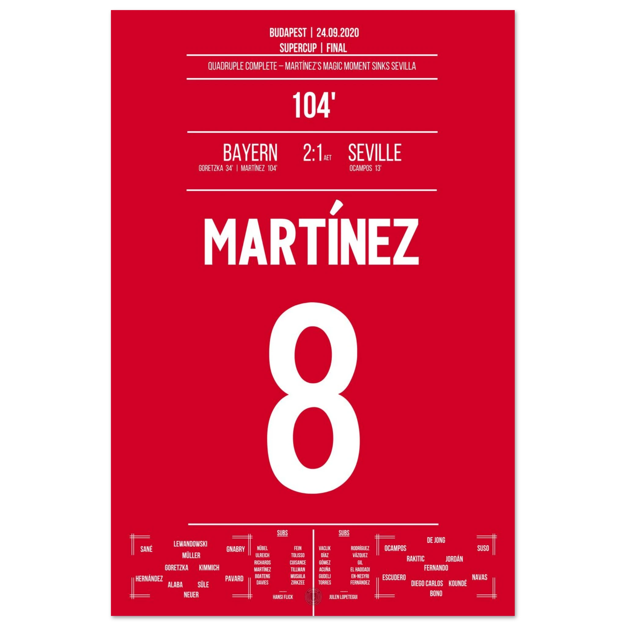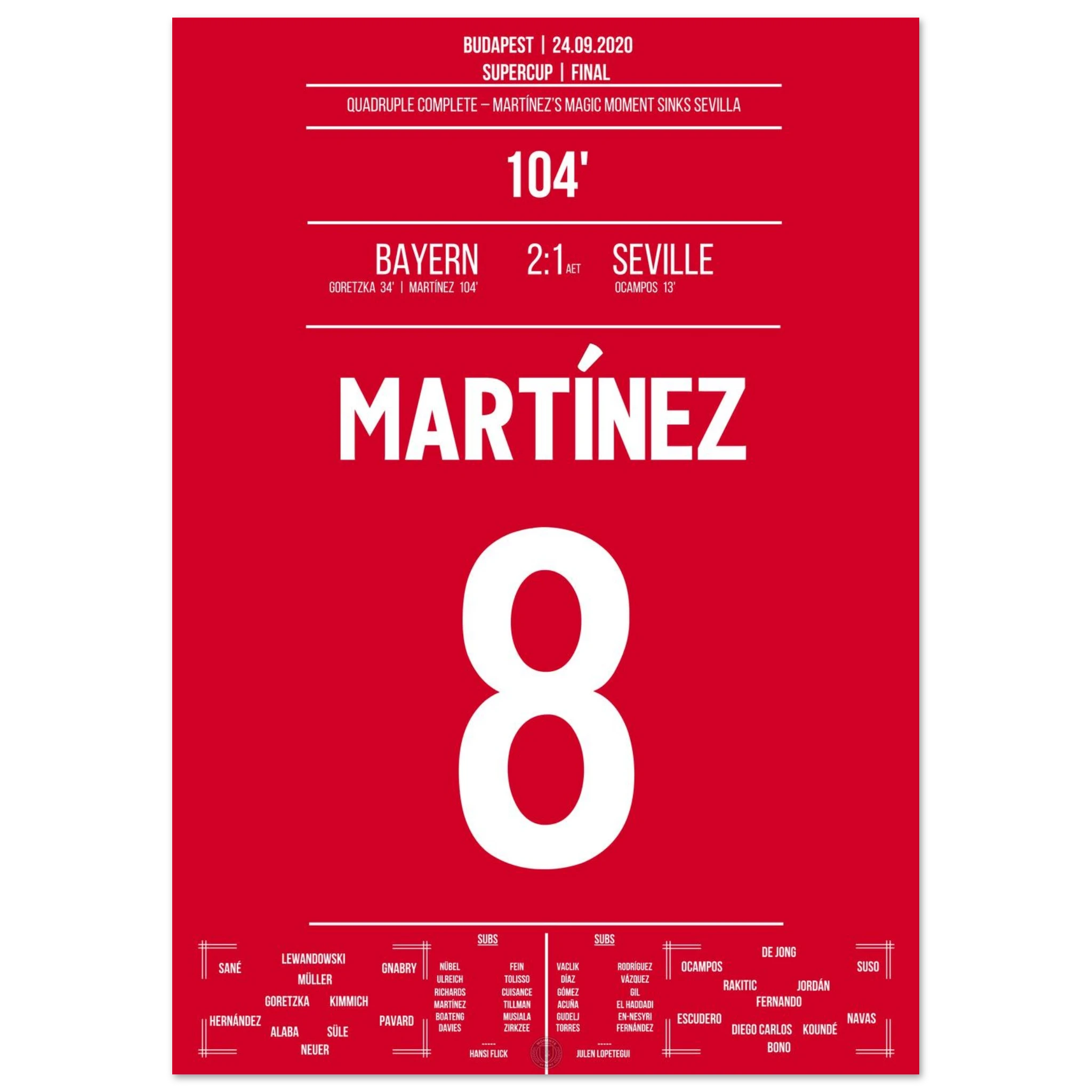 Im europäischen Supercup sorgt Javi Martínez in der 104. Minute für die Entscheidung: Nach einer Ecke steigt er am höchsten und nickt zum 2:1 ein. Mit seinem Treffer sichert er Bayern den vierten Titel des Jahres – das historische Quadruple ist perfekt.