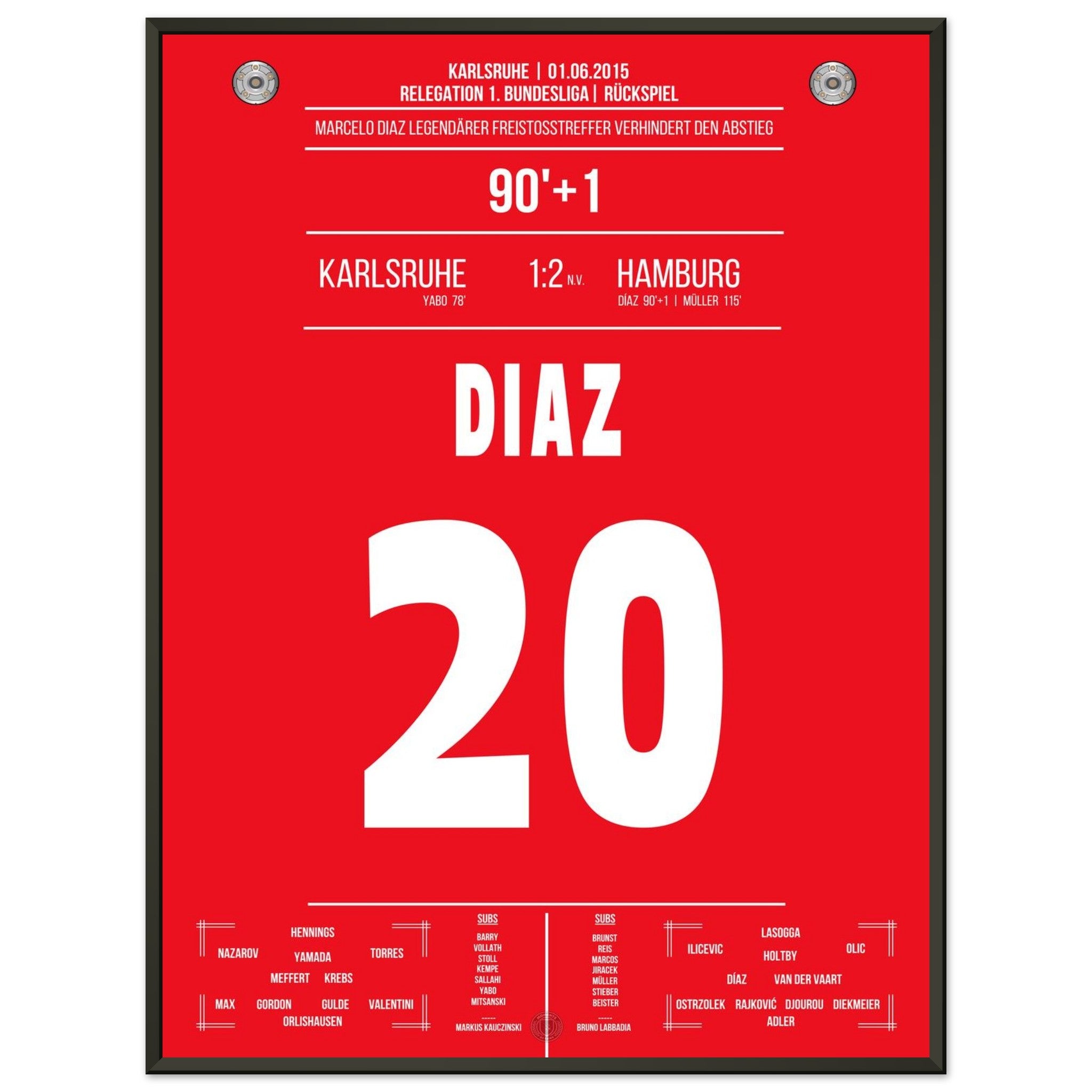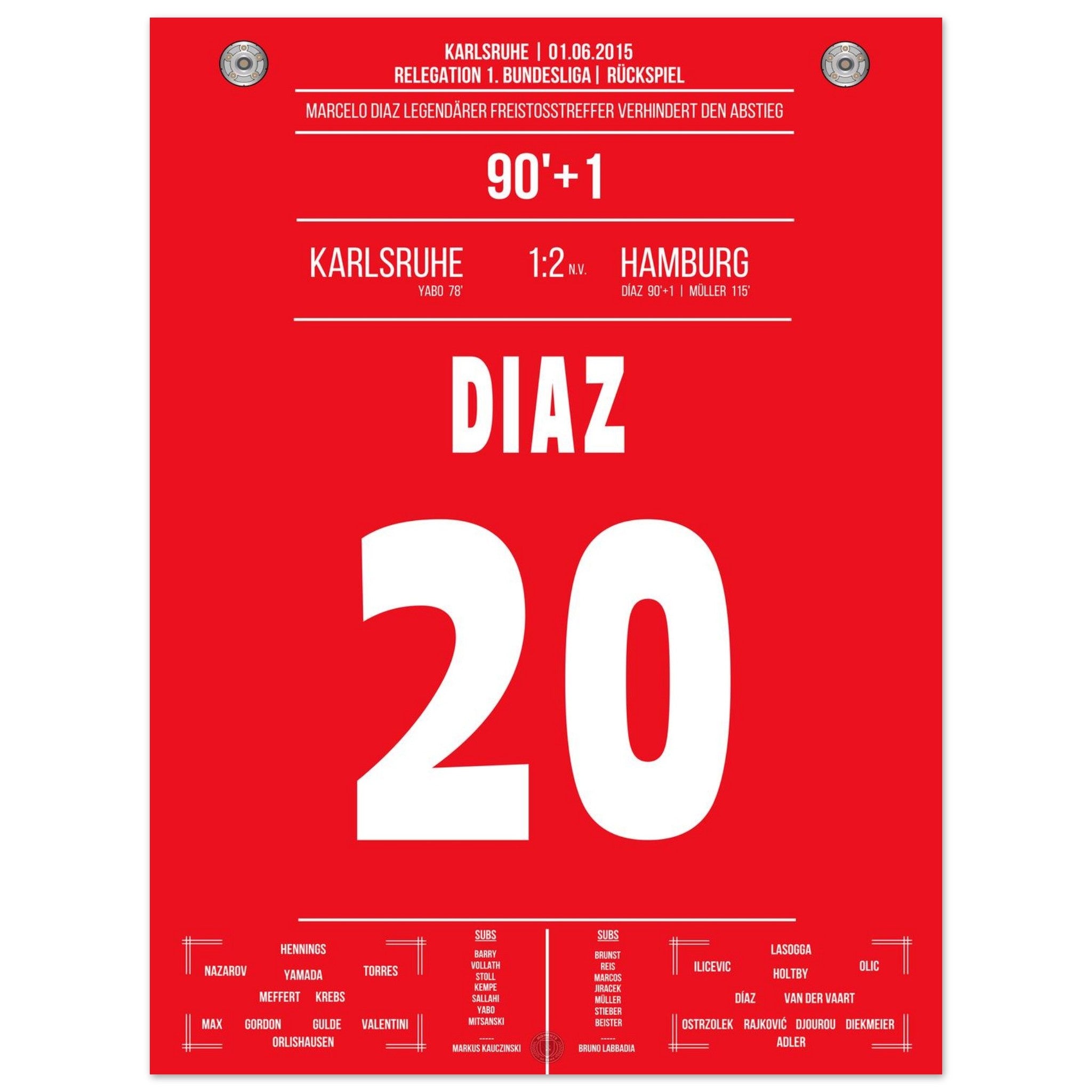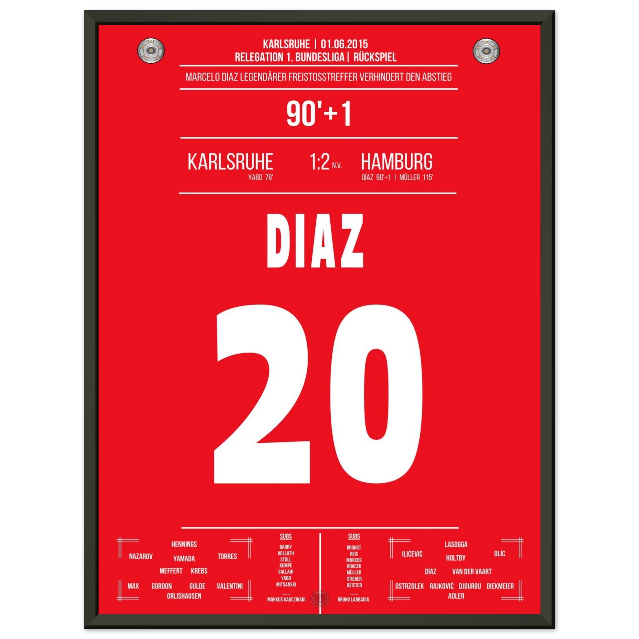 1. Juni 2015 – Karlsruhe vs. Hamburg 1:2 n.V.: In der 91. Minute zieht Marcelo Díaz einen Freistoß aus dem Nichts – und trifft. Hamburg rettet sich in letzter Sekunde in die Verlängerung und wahrt die Bundesliga-Zugehörigkeit. Unser Poster feiert einen der dramatischsten Momente der Relegationsgeschichte.