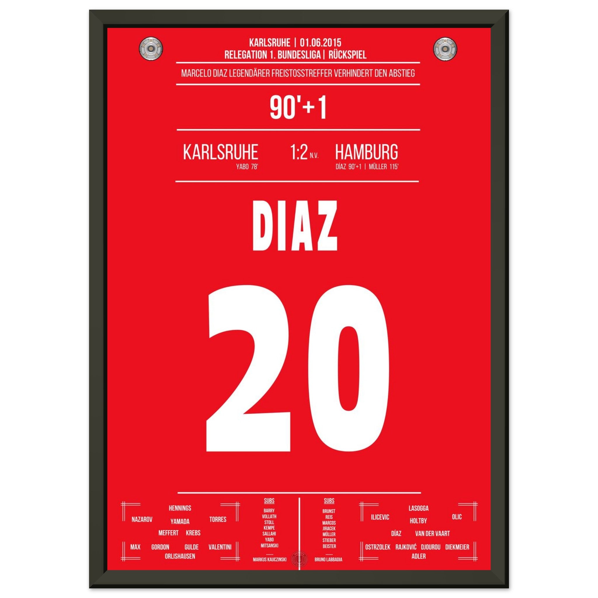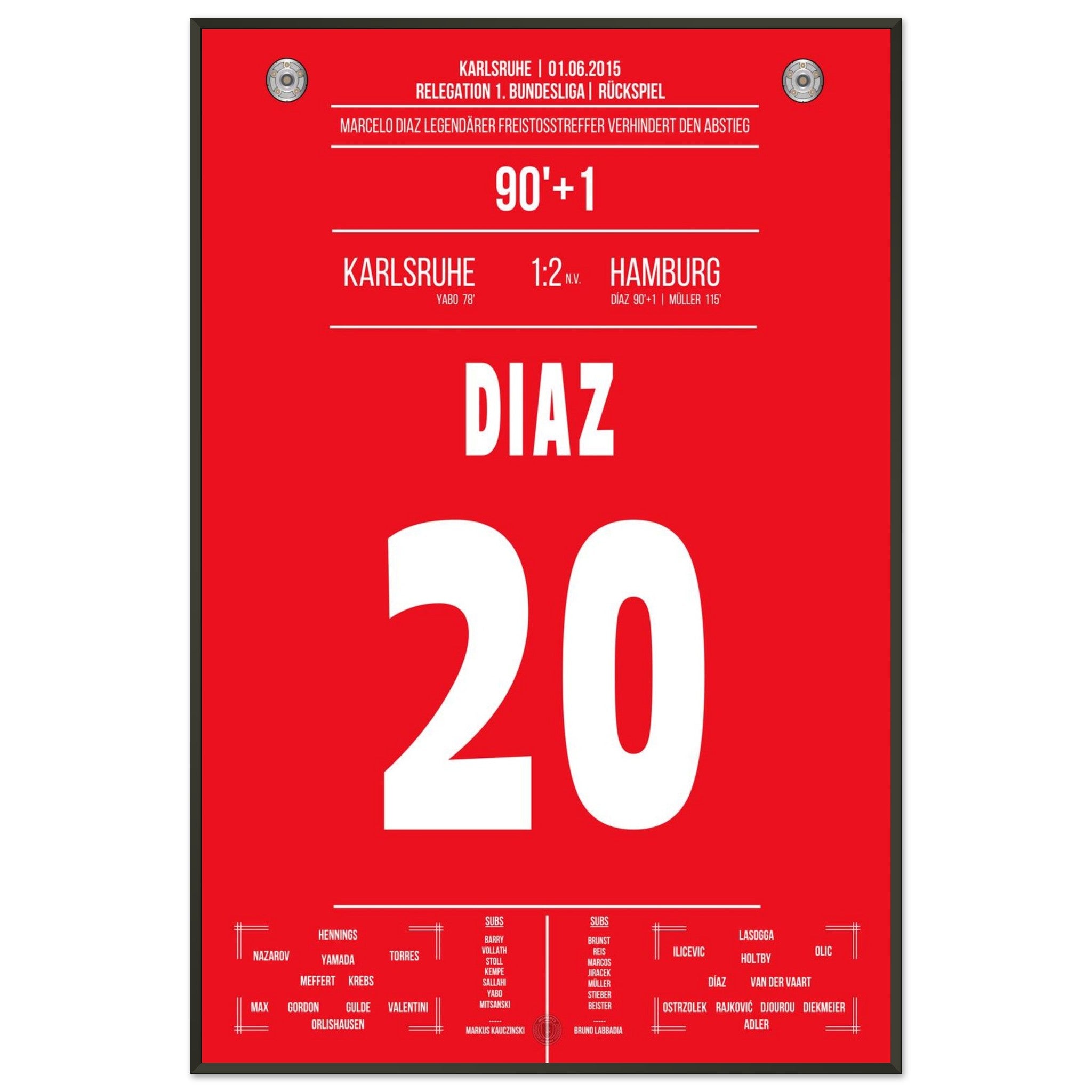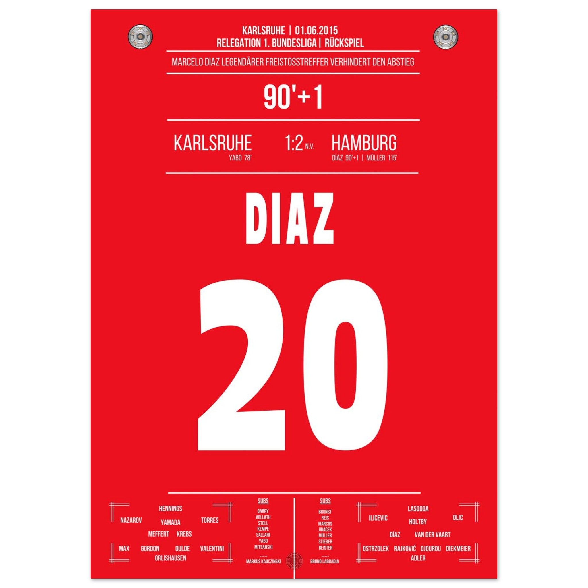 1. Juni 2015 – Karlsruhe vs. Hamburg 1:2 n.V.: In der 91. Minute zieht Marcelo Díaz einen Freistoß aus dem Nichts – und trifft. Hamburg rettet sich in letzter Sekunde in die Verlängerung und wahrt die Bundesliga-Zugehörigkeit. Unser Poster feiert einen der dramatischsten Momente der Relegationsgeschichte.