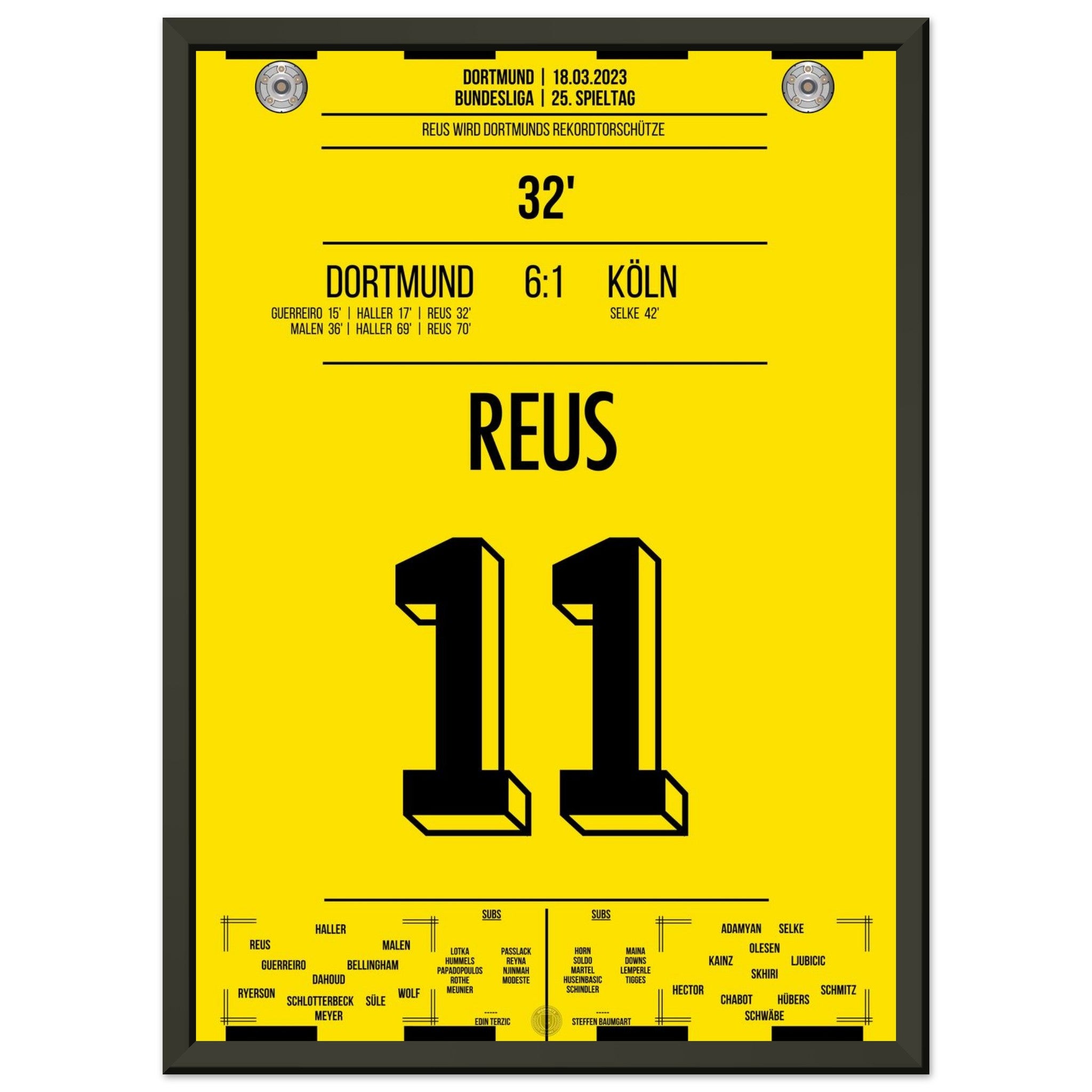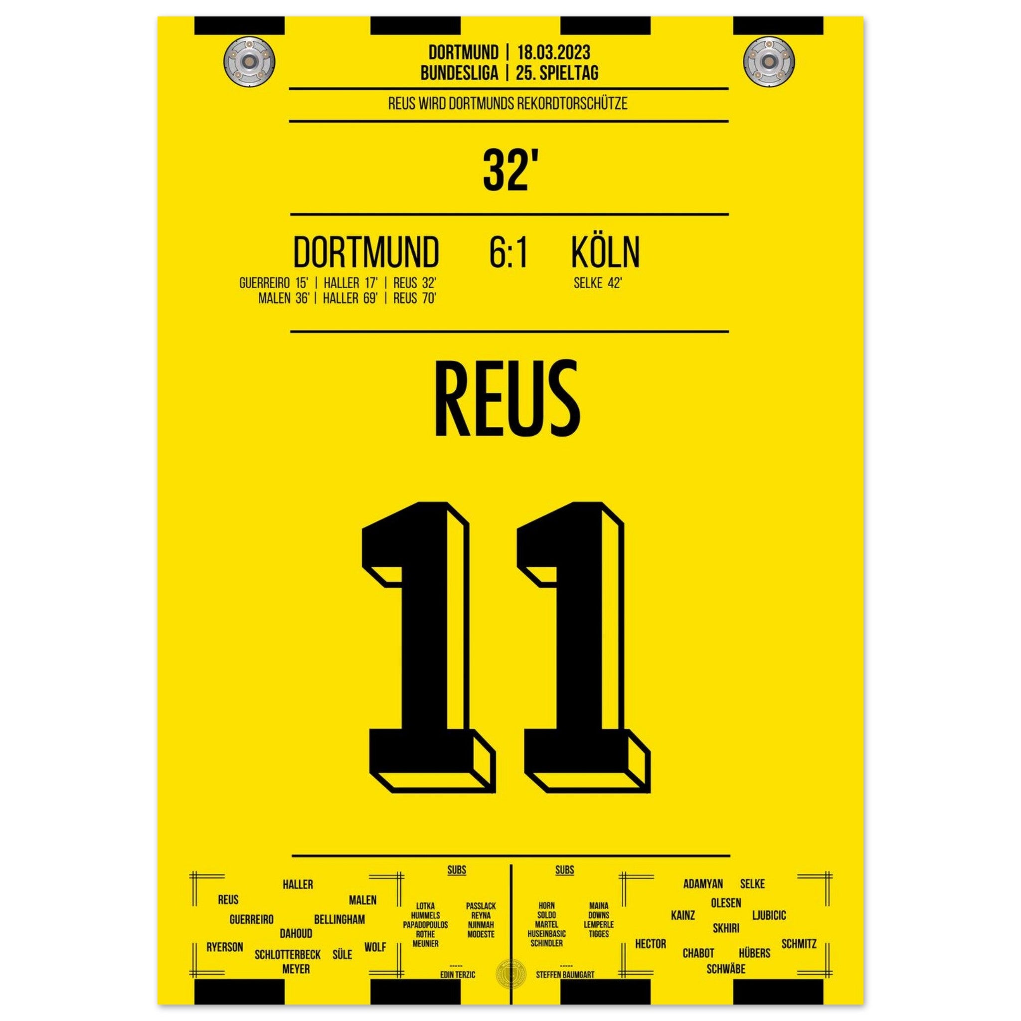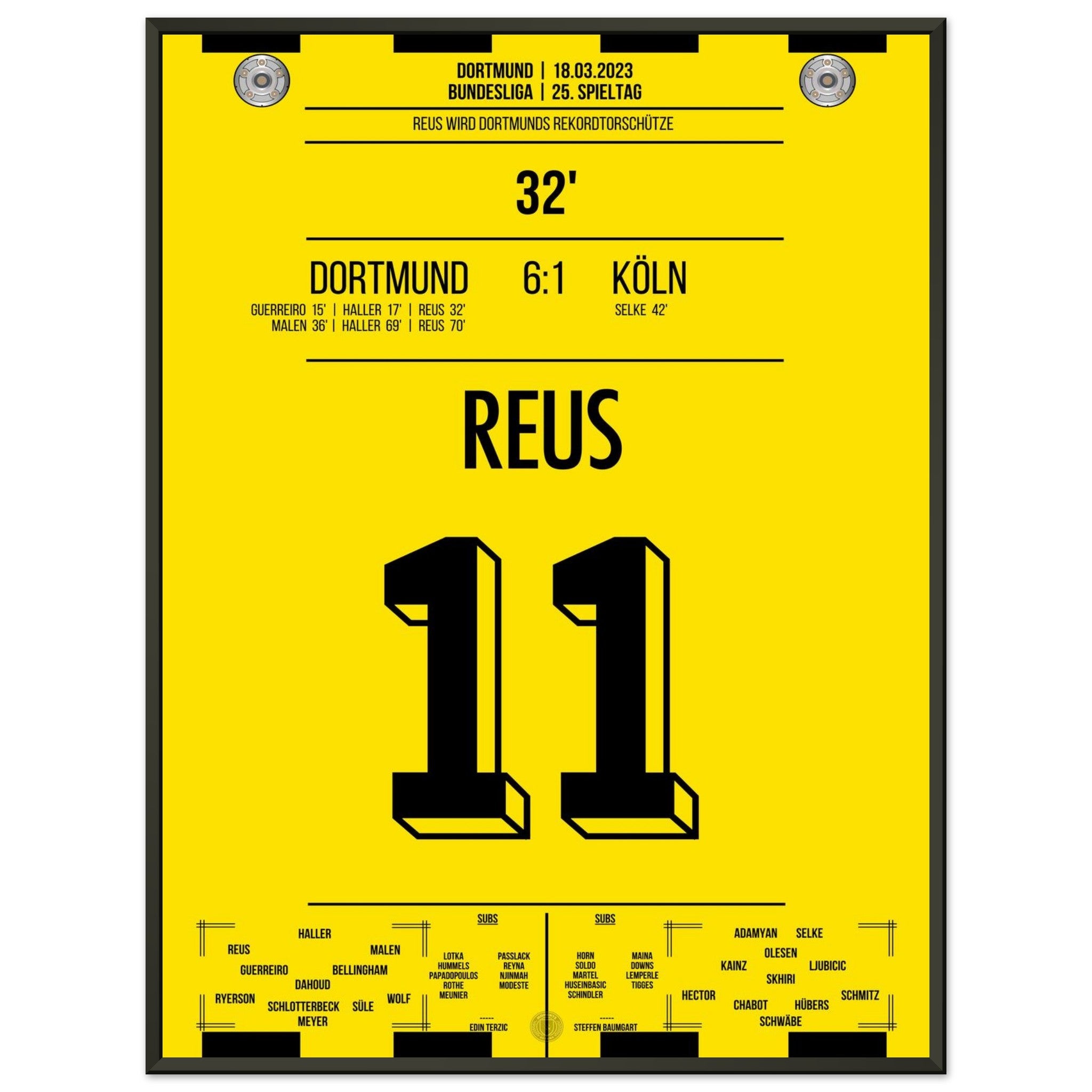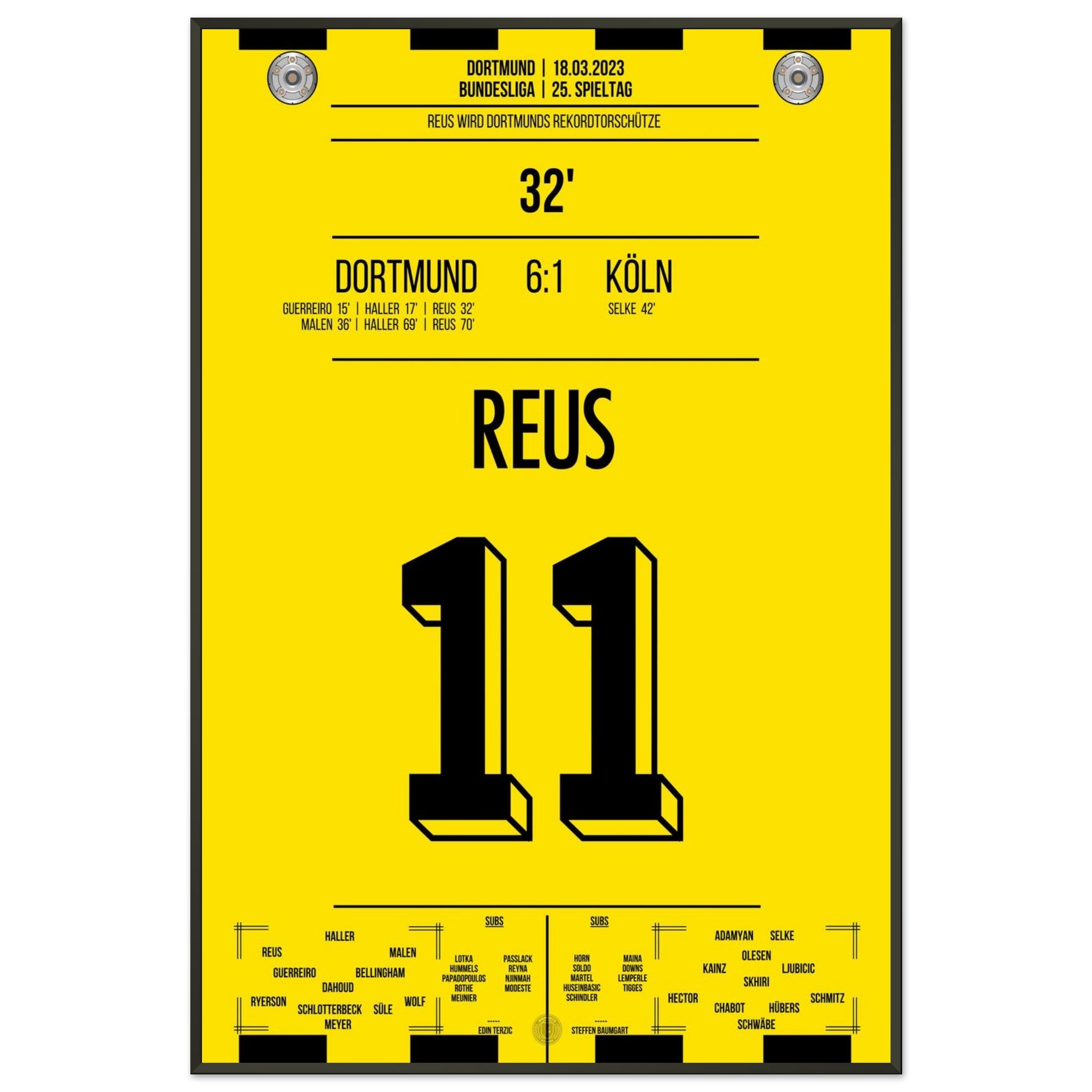 18. März 2023 – Dortmund vs. Köln 6:1: In der 32. Minute trifft Marco Reus und wird damit alleiniger Rekordtorschütze bei Dortmund – ein Meilenstein in einer goldenen Karriere. Beim Torfestival gegen Köln schreibt er endgültig Vereinsgeschichte. Unser Poster verewigt diesen historischen Reus-Moment in Schwarz-Gelb.