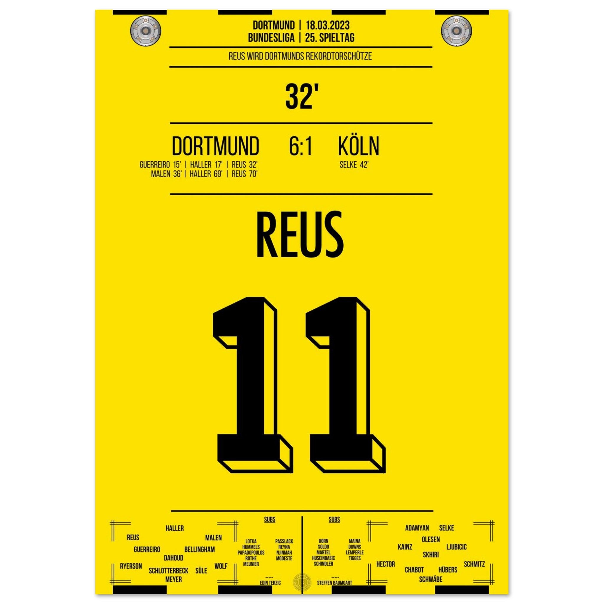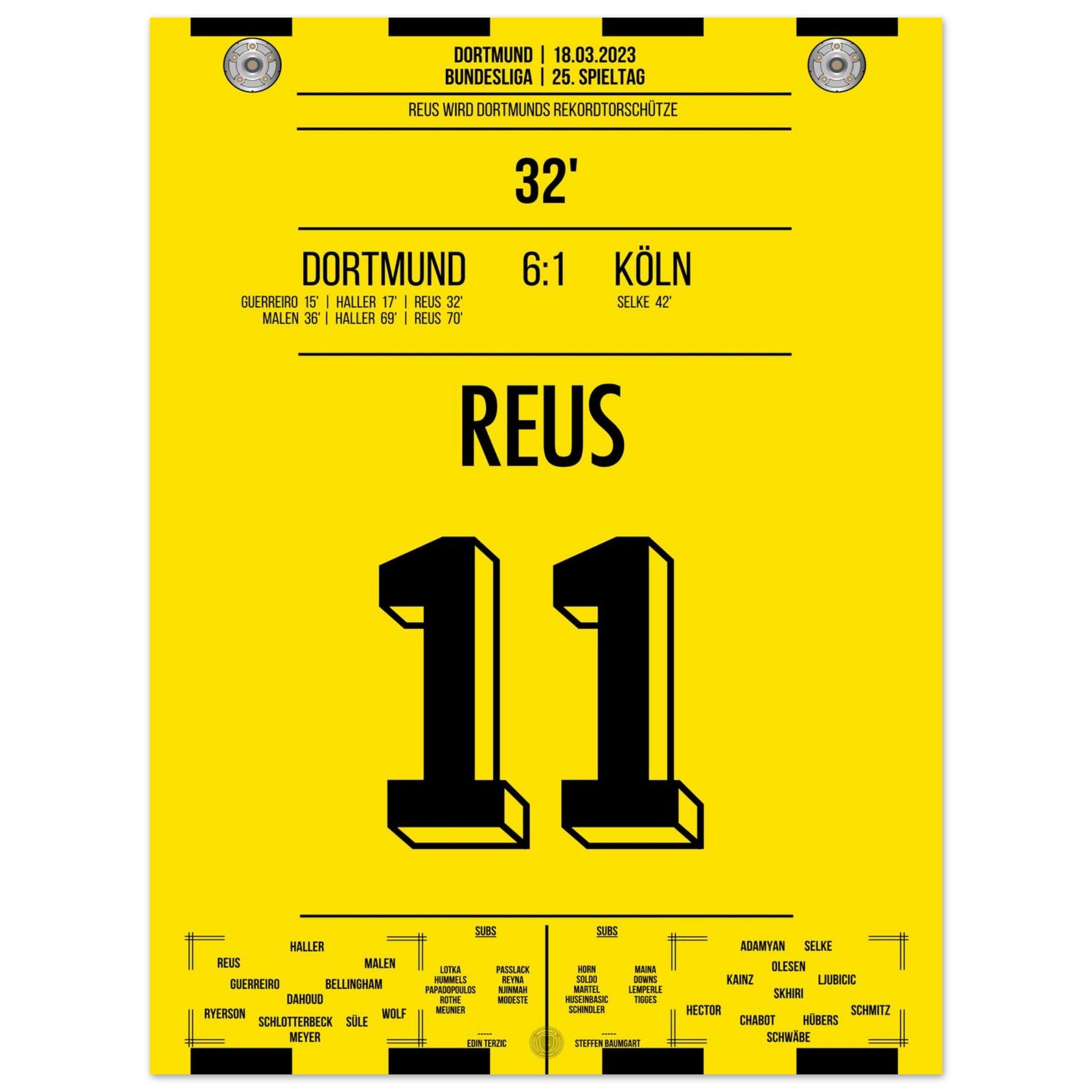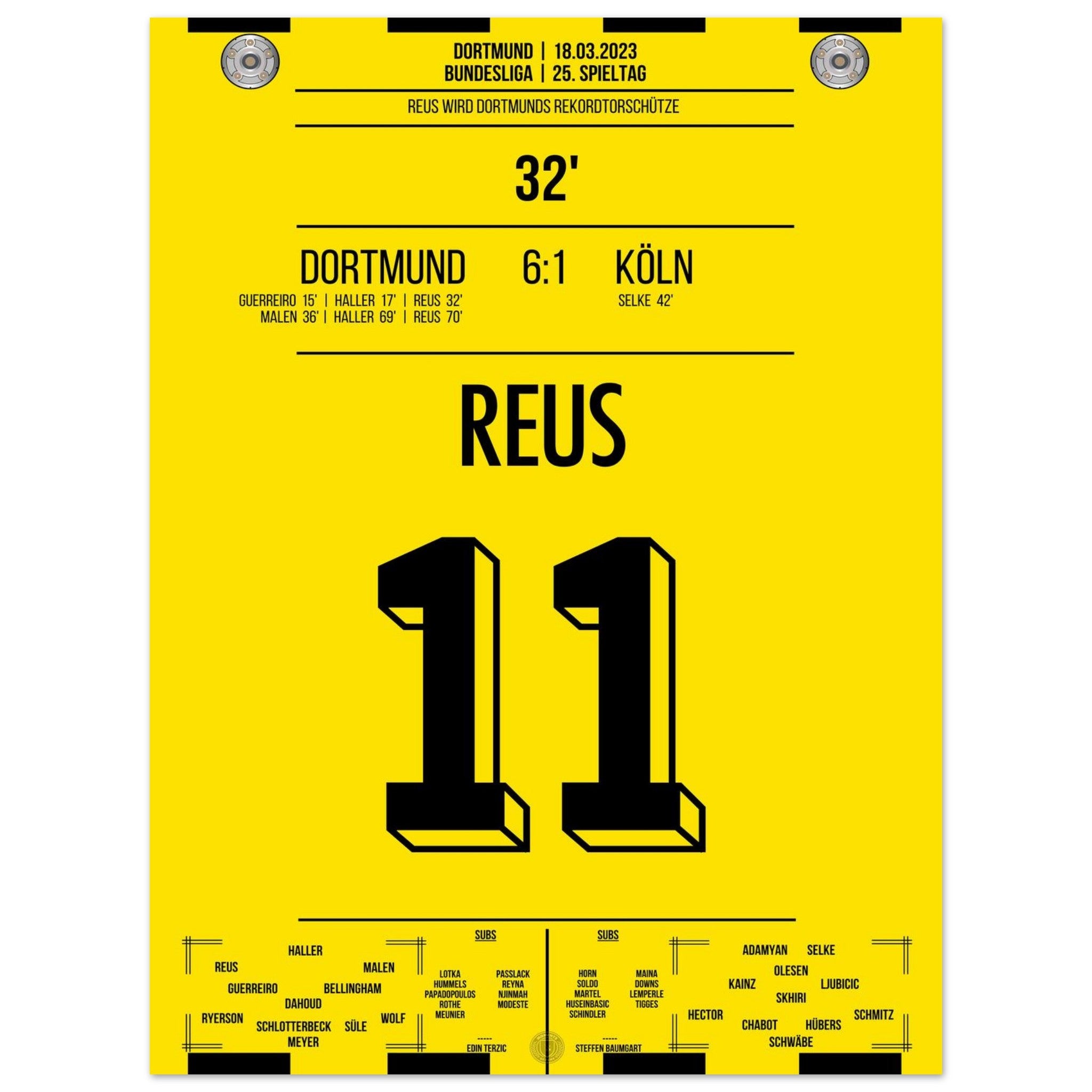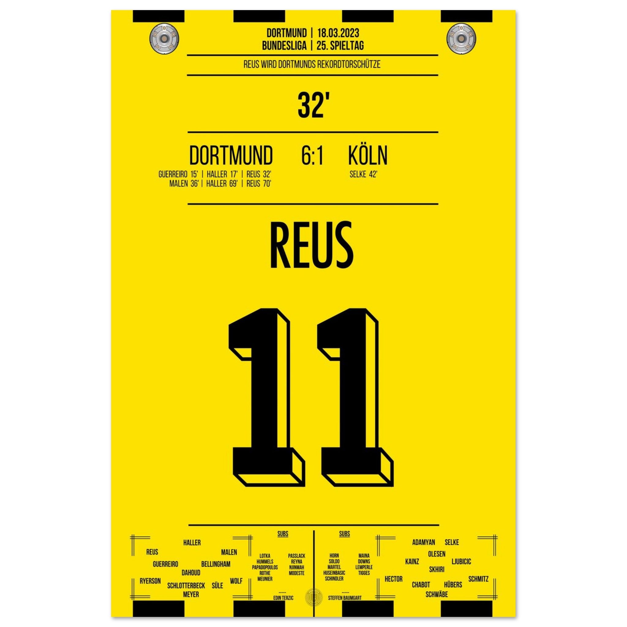 18. März 2023 – Dortmund vs. Köln 6:1: In der 32. Minute trifft Marco Reus und wird damit alleiniger Rekordtorschütze bei Dortmund – ein Meilenstein in einer goldenen Karriere. Beim Torfestival gegen Köln schreibt er endgültig Vereinsgeschichte. Unser Poster verewigt diesen historischen Reus-Moment in Schwarz-Gelb.