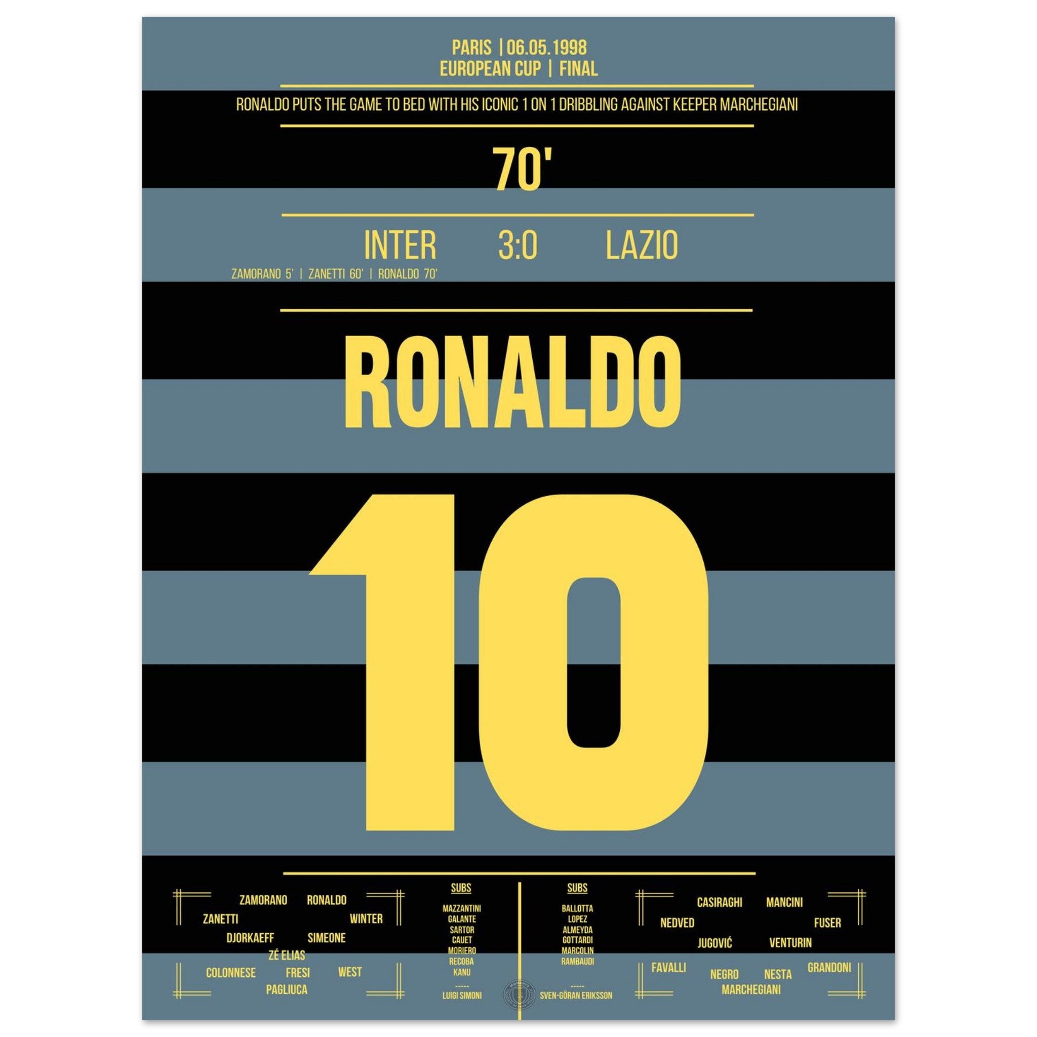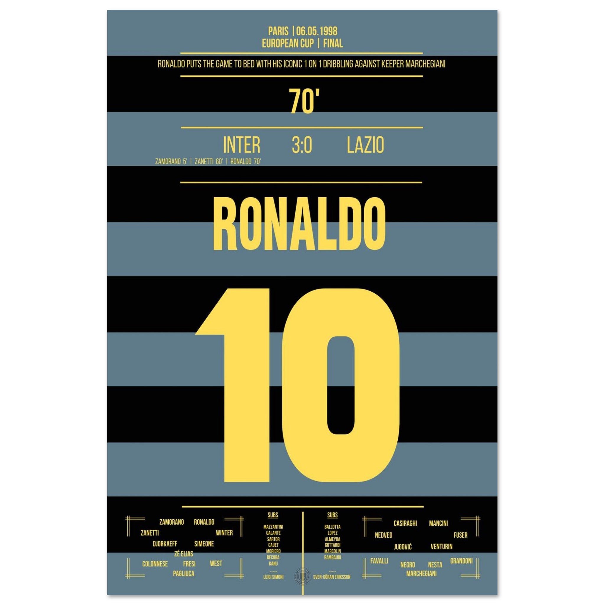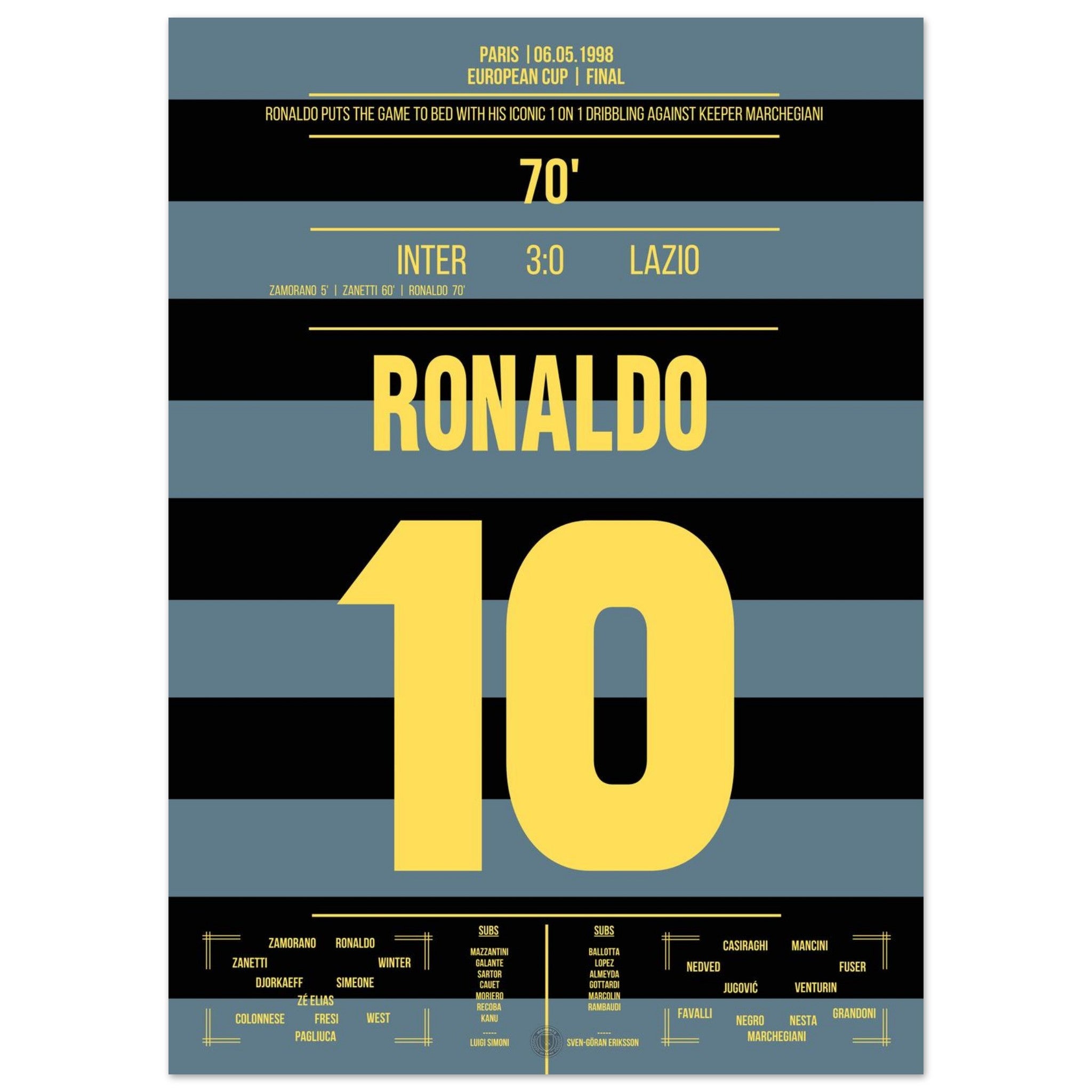 Im europäischen Finale liefert Ronaldo ein Spektakel für die Ewigkeit. Mit seinem legendären Übersteiger narrt er Keeper Marchegiani und vollendet zum 3:0-Endstand. Pure Magie des „Phänomens“ – ein Tor, das Fußballgeschichte schrieb.