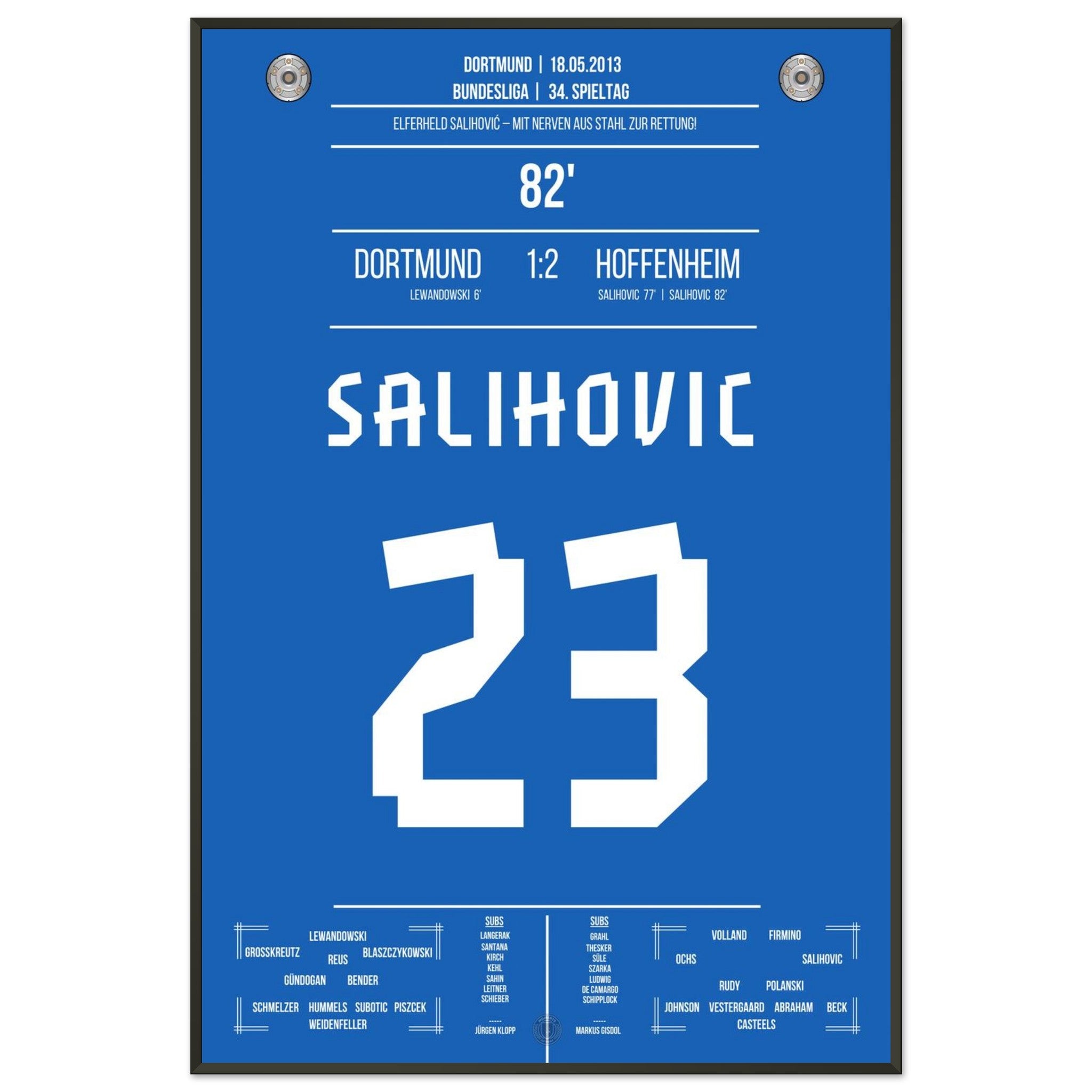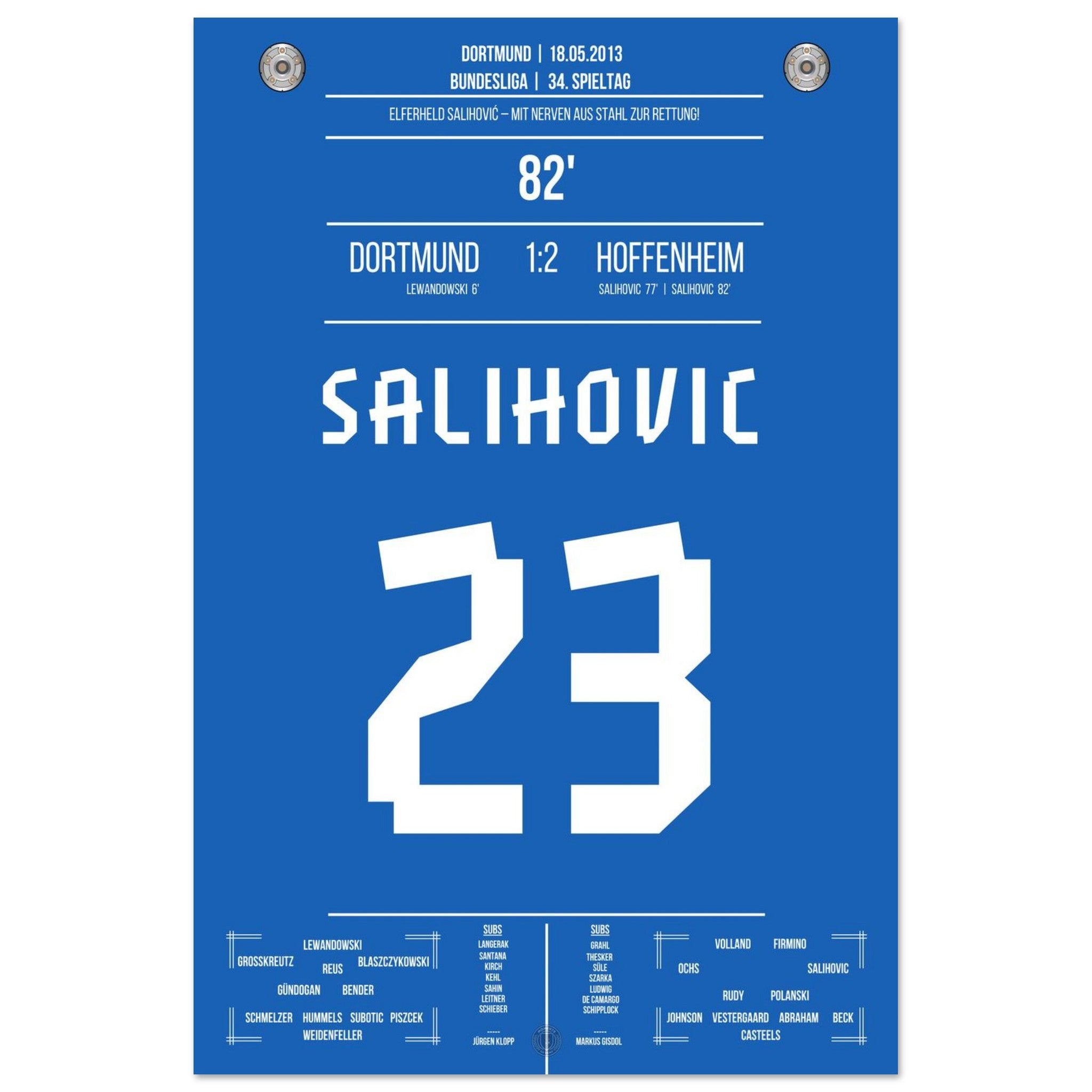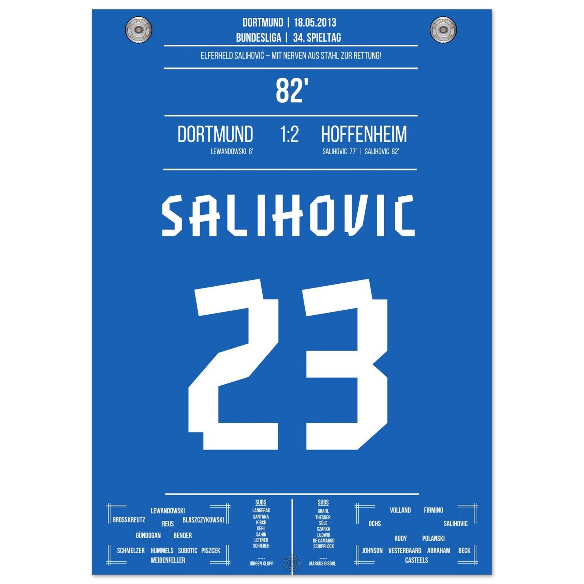 18. Mai 2013 – Dortmund vs. Hoffenheim 1:2: Sejad Salihović verwandelt in der 82. Minute eiskalt vom Punkt und bringt Hoffenheim damit auf die Siegerstraße. Mit seinem Doppelpack beim Favoriten sichert er Hoffenheim die Relegation in letzter Sekunde. Unser Poster feiert diesen nervenstarken Moment in der Fußballgeschichte.