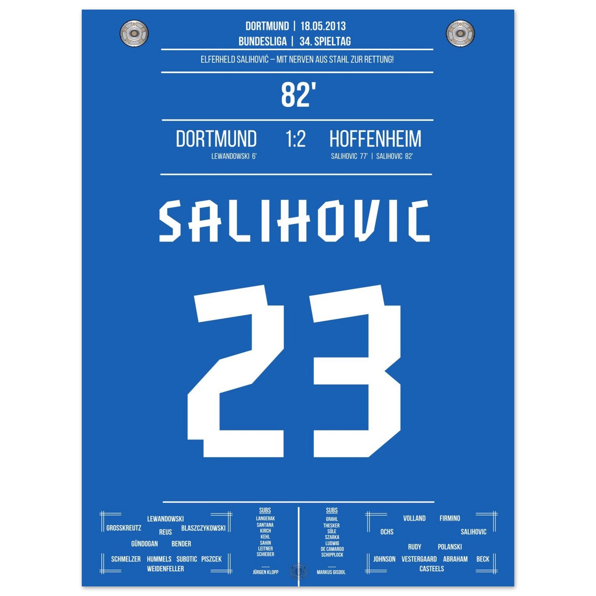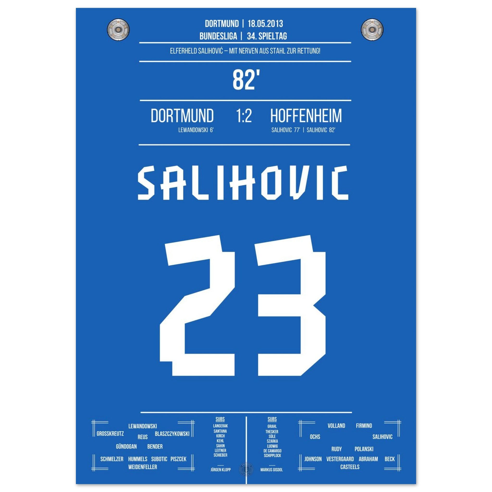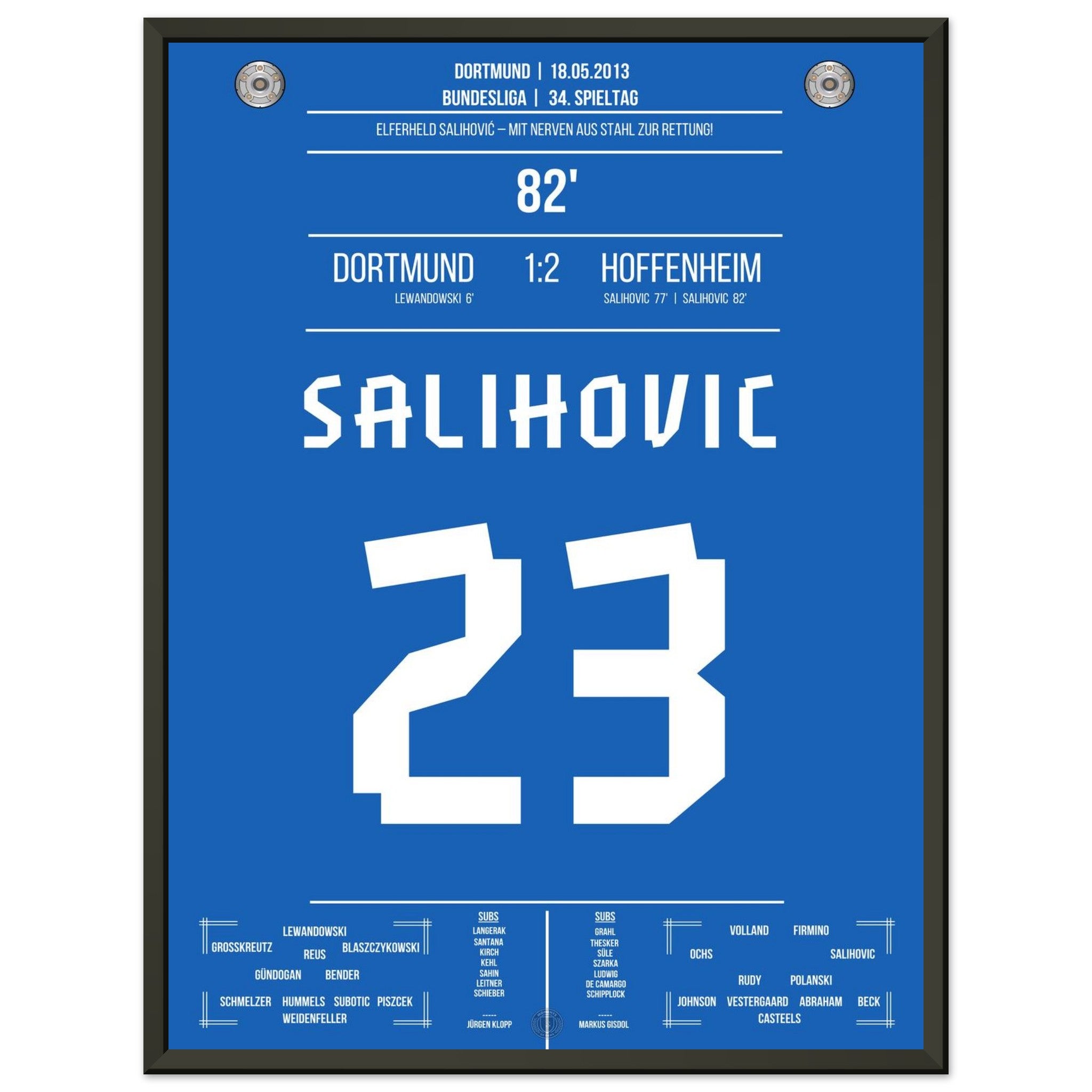 18. Mai 2013 – Dortmund vs. Hoffenheim 1:2: Sejad Salihović verwandelt in der 82. Minute eiskalt vom Punkt und bringt Hoffenheim damit auf die Siegerstraße. Mit seinem Doppelpack beim Favoriten sichert er Hoffenheim die Relegation in letzter Sekunde. Unser Poster feiert diesen nervenstarken Moment in der Fußballgeschichte.