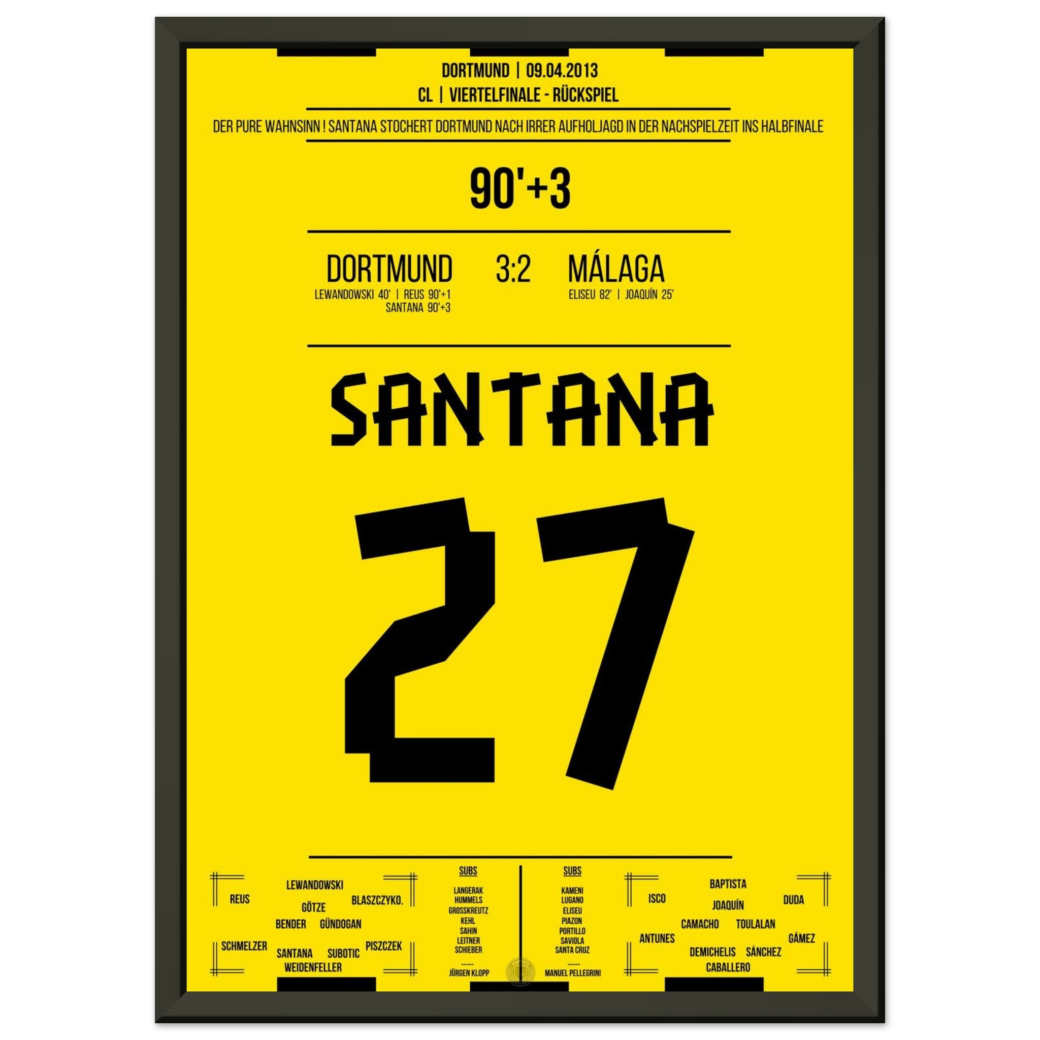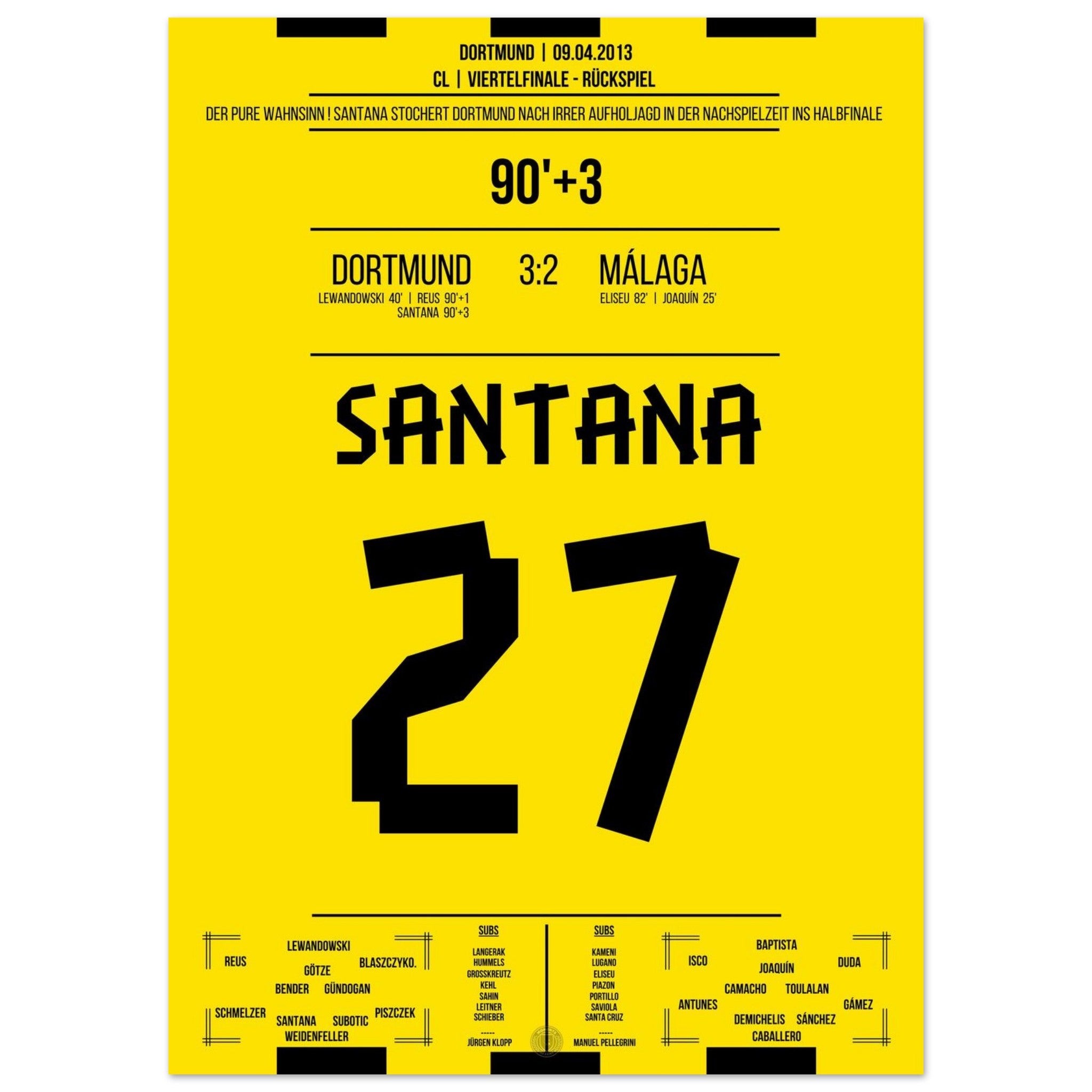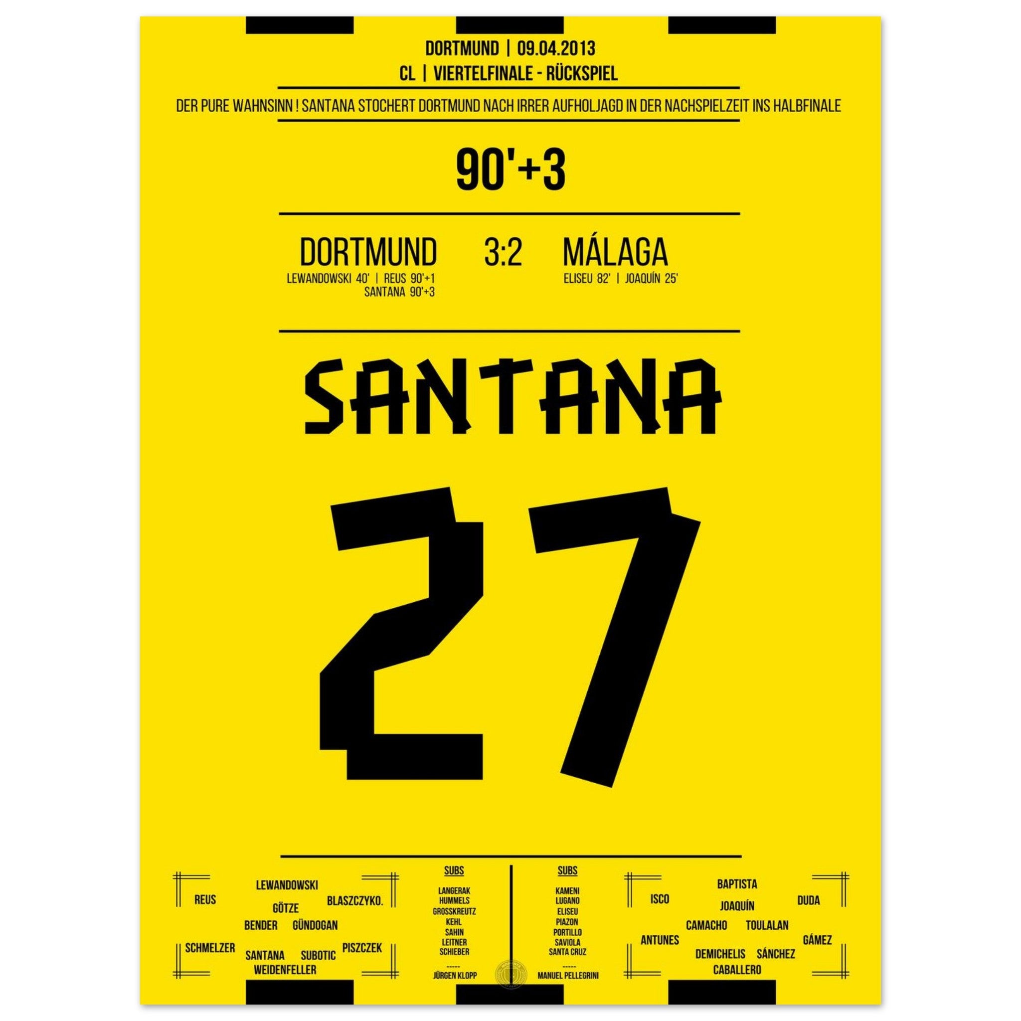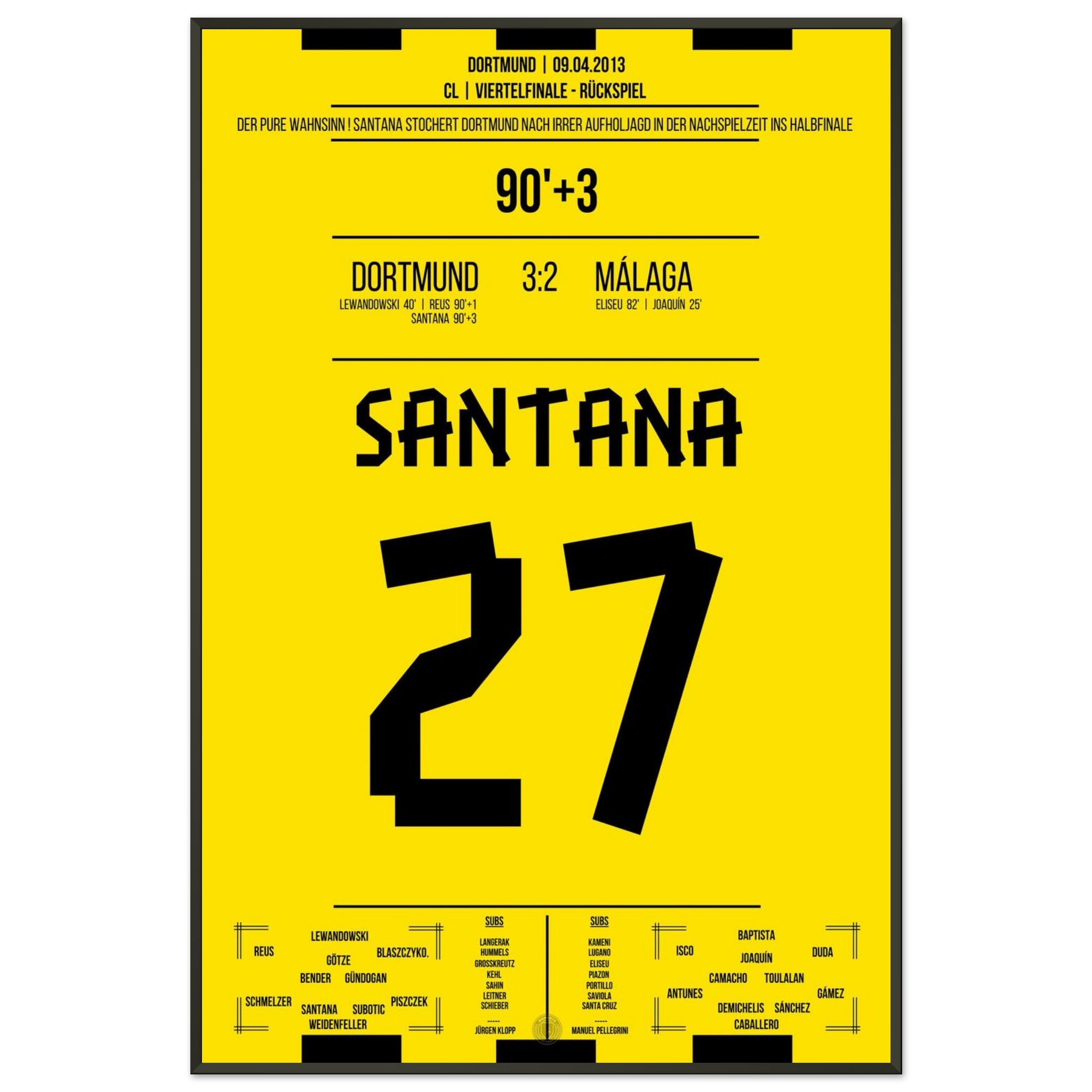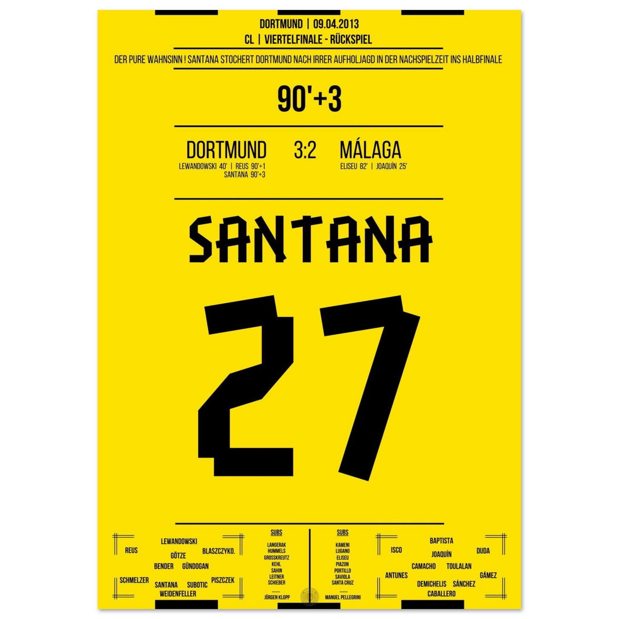 9. April 2013 – Dortmund vs. Málaga 3:2: In der 93. Minute stochert Felipe Santana den Ball über die Linie und vollendet das Wunder von Dortmund – nach 1:2-Rückstand zieht Dortmund dramatisch ins CL-Halbfinale ein. Ein Tor, das den Wahnsinn perfekt macht. Unser Poster verewigt diesen unvergesslichen Gänsehautmoment.