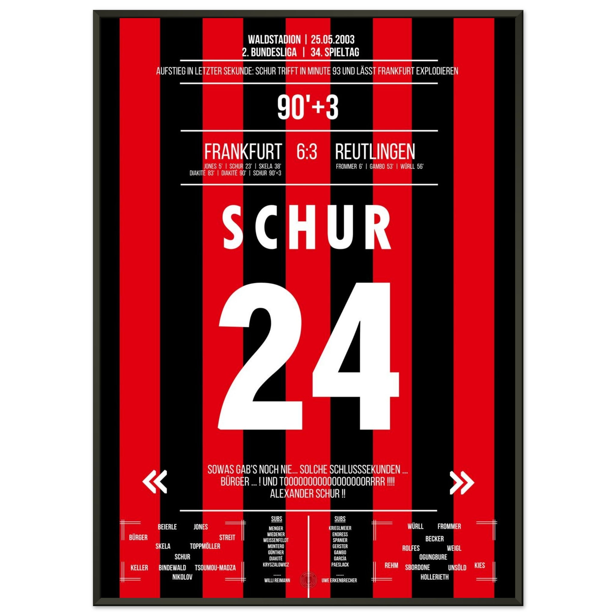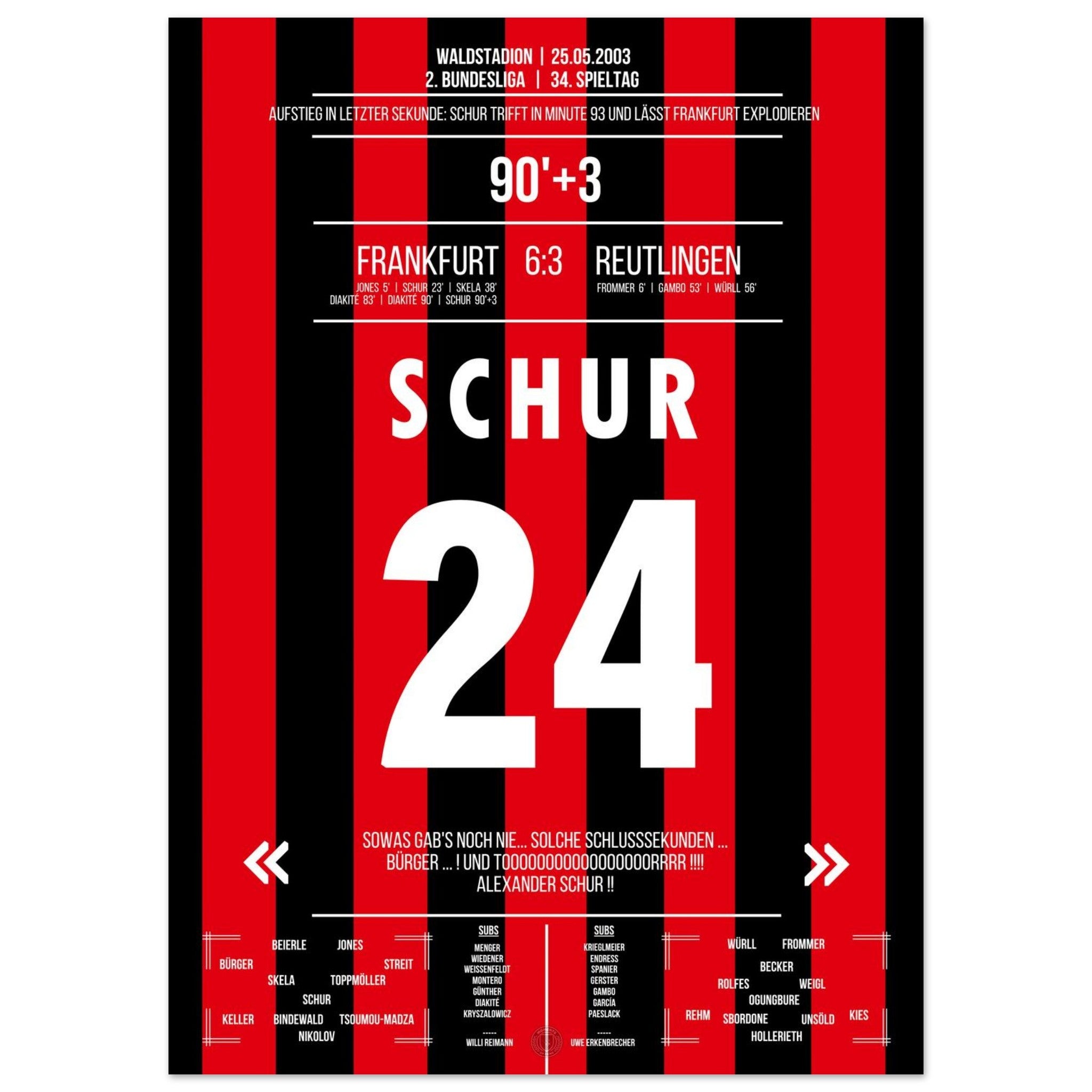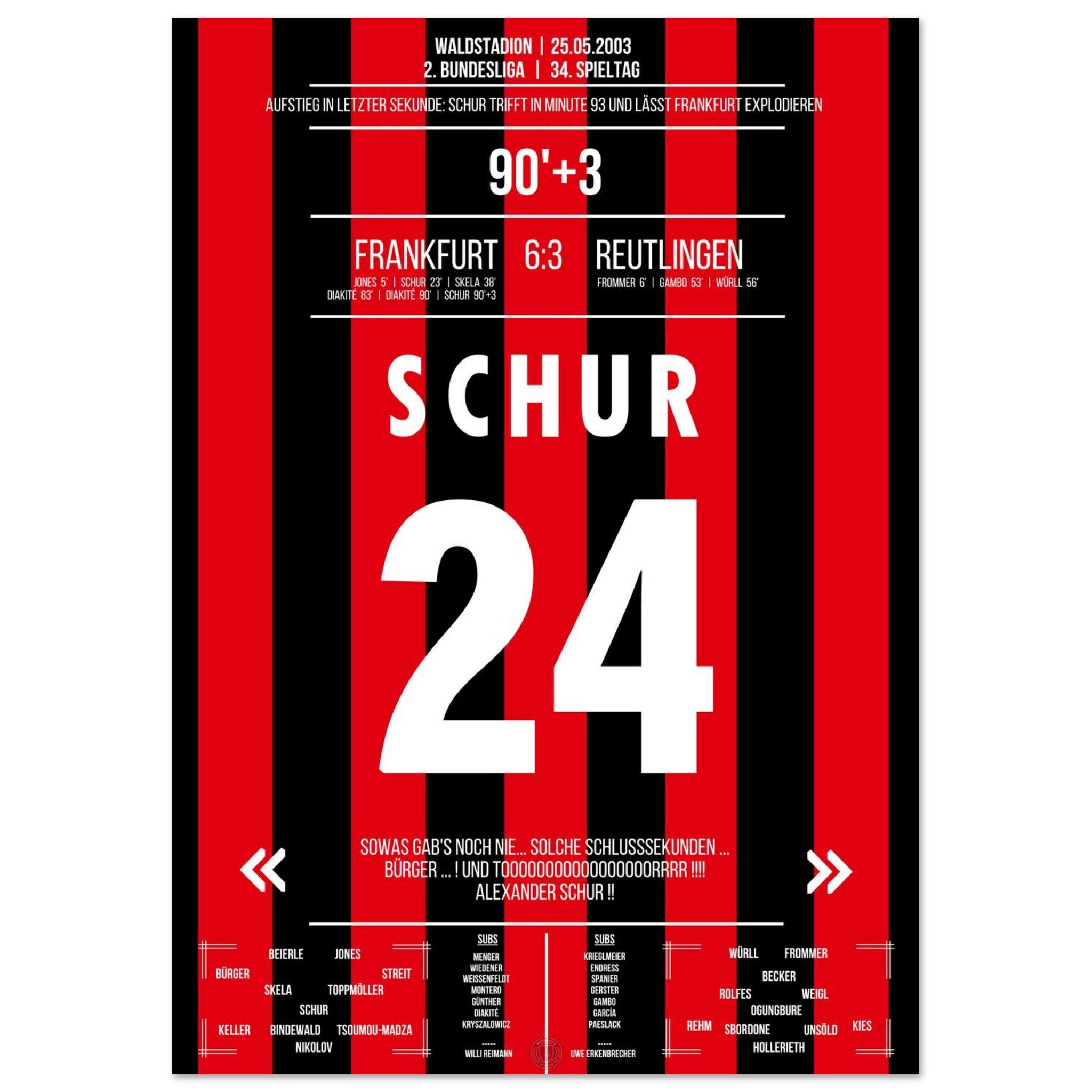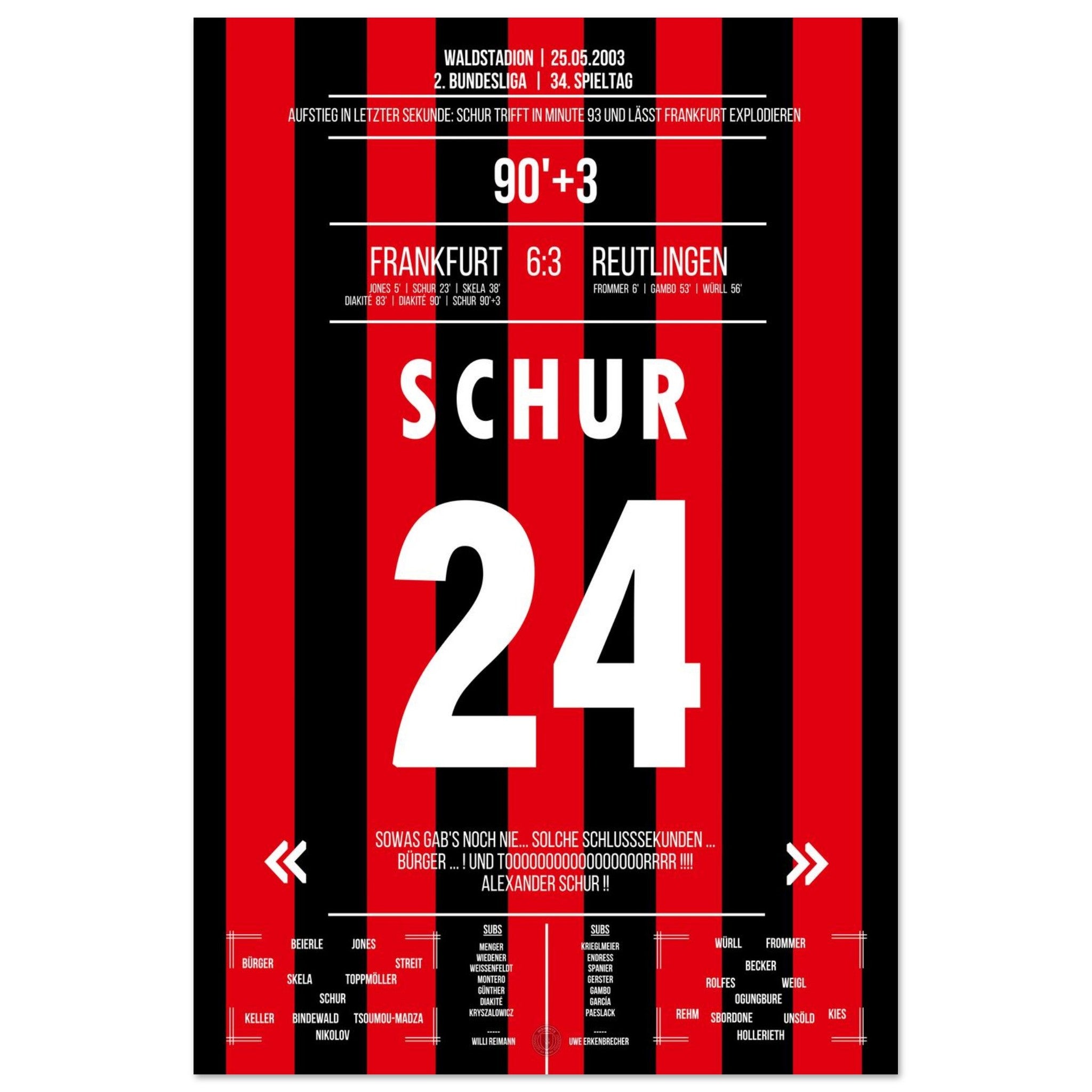 25. Mai 2003 – Frankfurt vs. Reutlingen 6:3: In der 93. Minute macht Alexander Schur das 6:3 und macht den Bundesliga-Aufstieg perfekt. Ein Moment purer Leidenschaft, der Frankfurt für immer prägt. Unser Poster hält diesen heldenhaften Aufstiegsmoment fest.