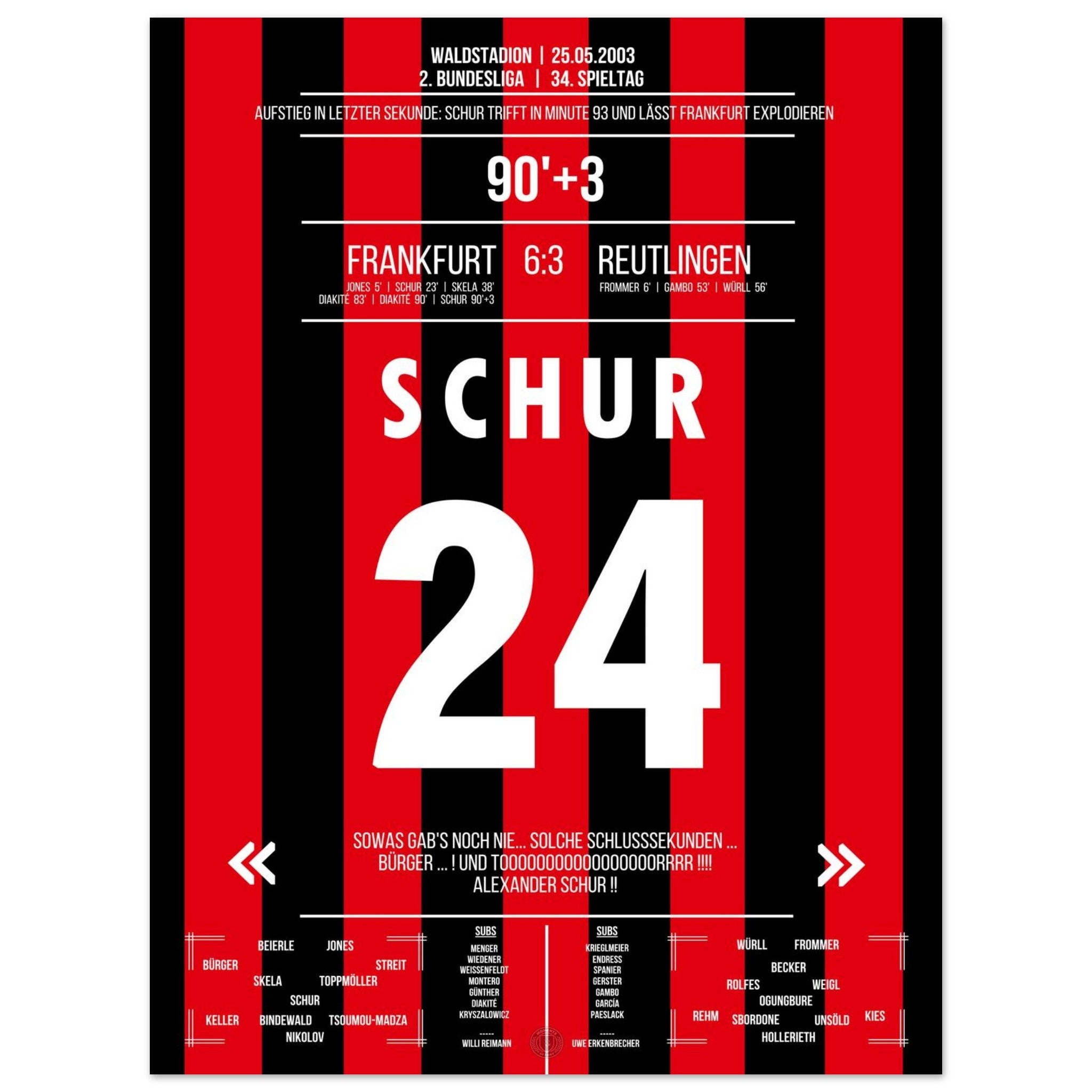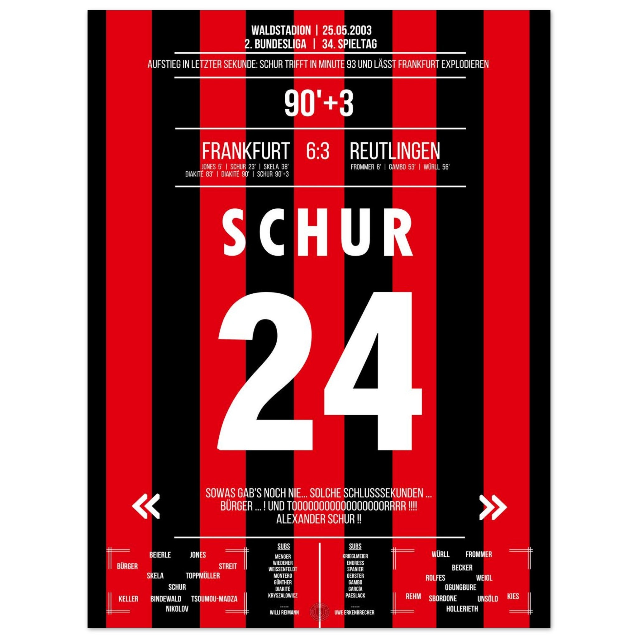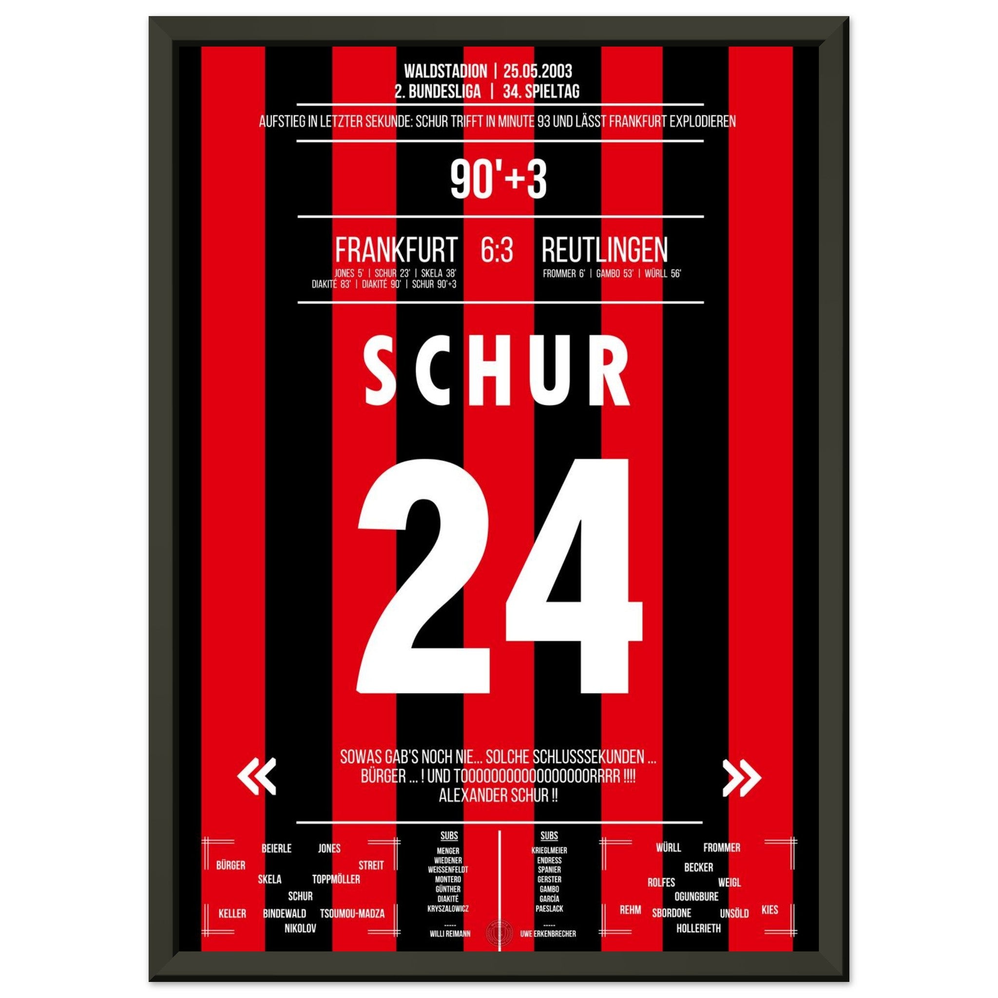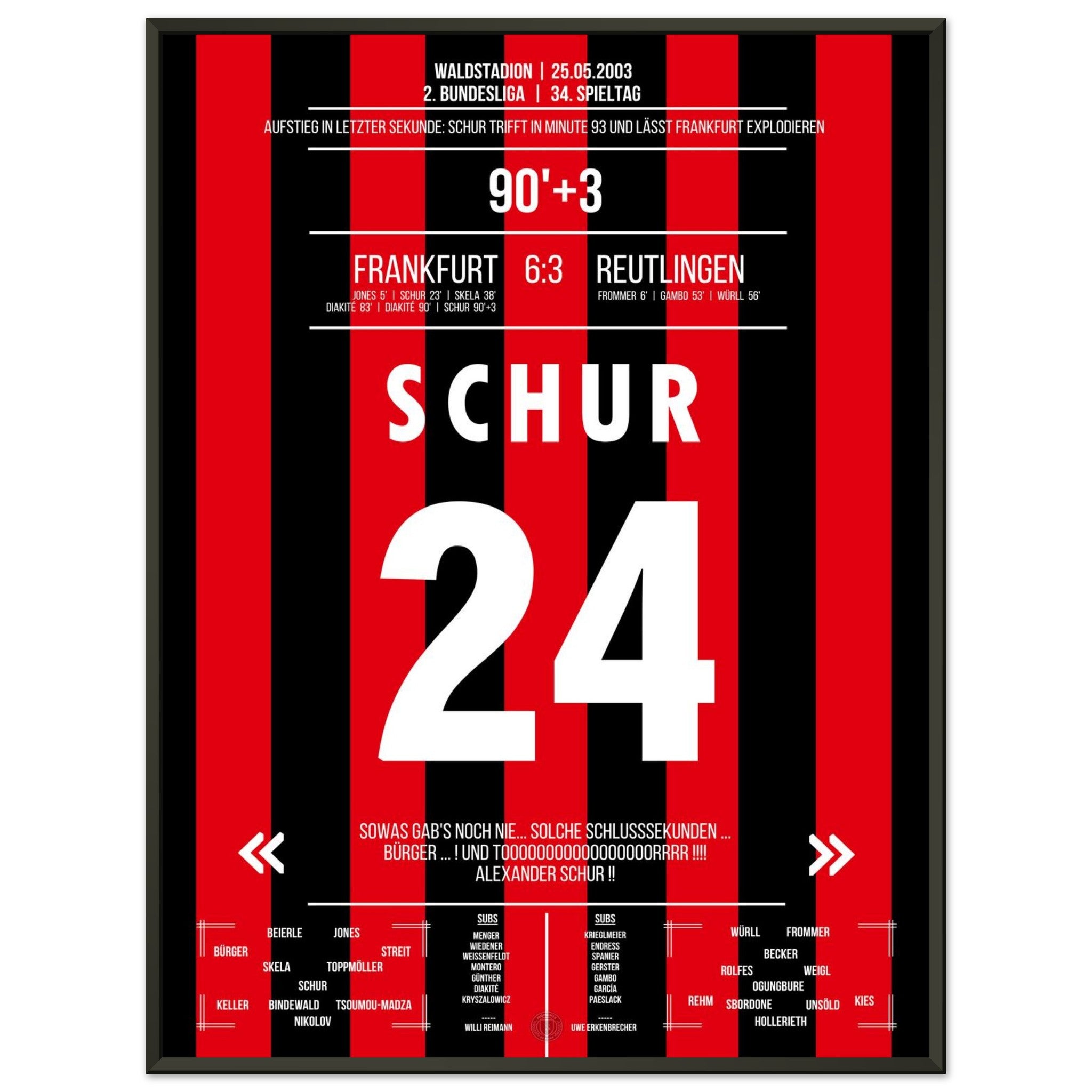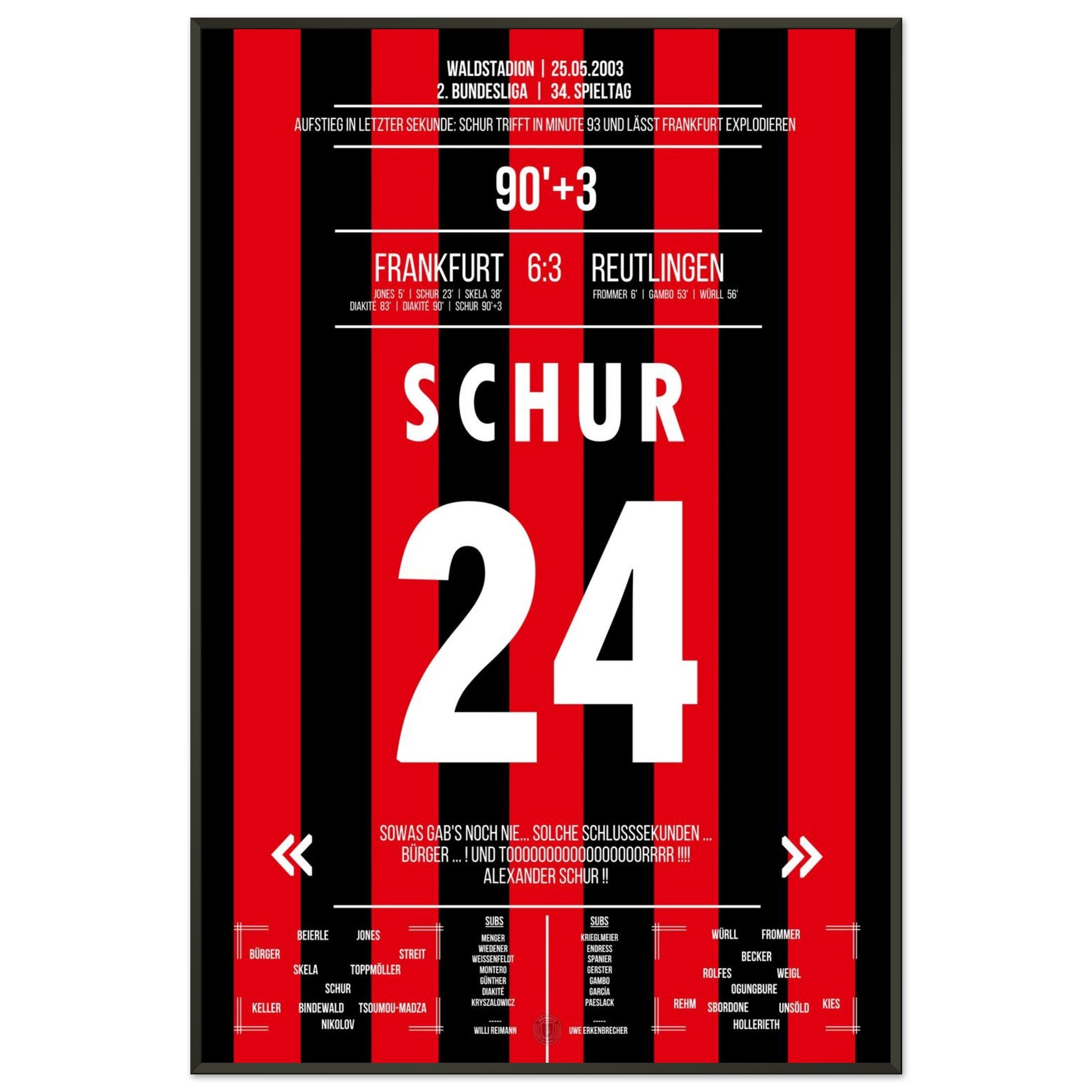 25. Mai 2003 – Frankfurt vs. Reutlingen 6:3: In der 93. Minute macht Alexander Schur das 6:3 und macht den Bundesliga-Aufstieg perfekt. Ein Moment purer Leidenschaft, der Frankfurt für immer prägt. Unser Poster hält diesen heldenhaften Aufstiegsmoment fest.