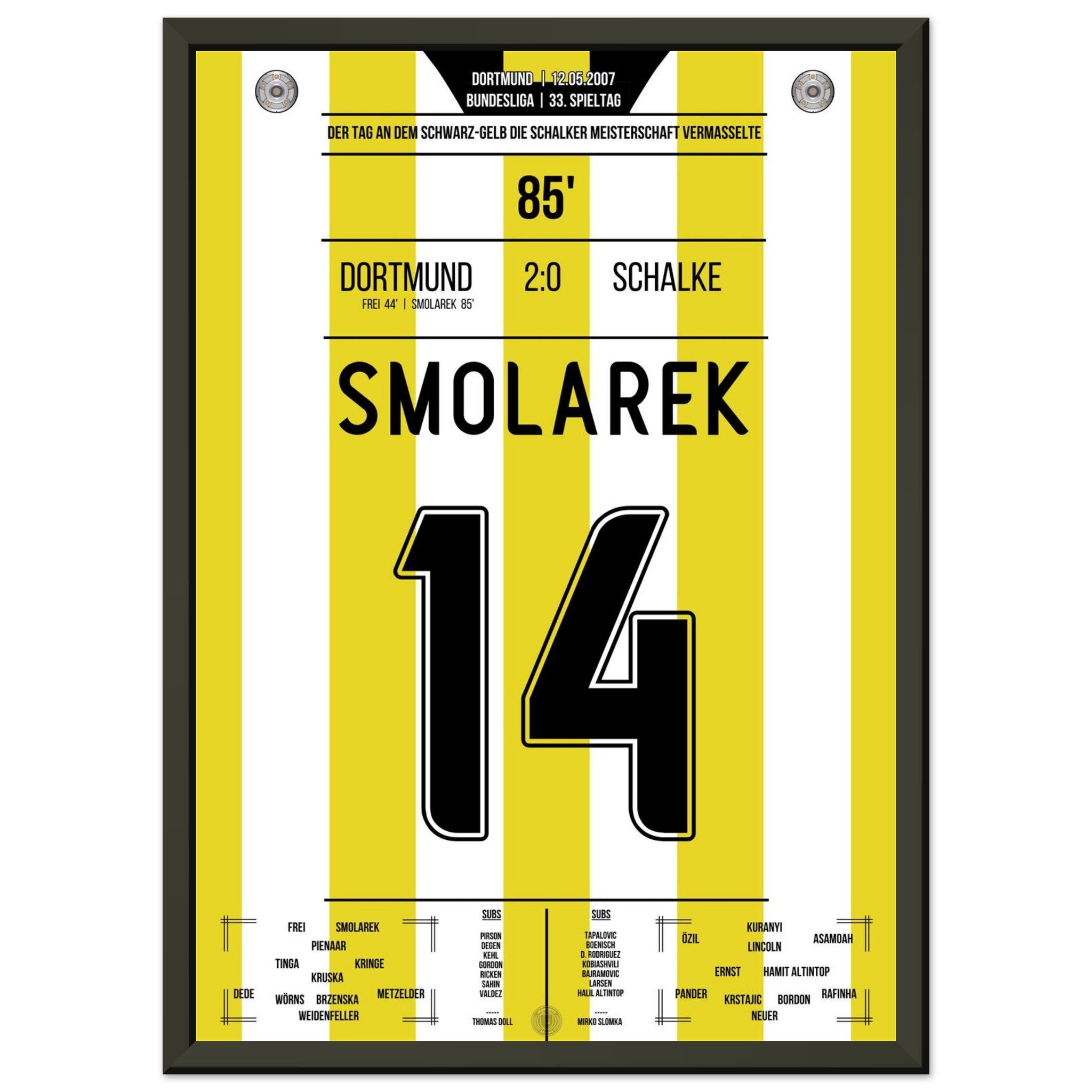 12. Mai 2007 – Dortmund vs. Schalke 2:0: Ebi Smolarek trifft im Derby und stürzt Schalke im Titelrennen – Dortmund vermasselt dem Erzrivalen die Meisterschaft und feiert den Sieg wie einen Titel. Ein Klassiker für die Ewigkeit. Unser Poster hält diesen legendären Derby-Moment in Schwarz-Gelb fest.