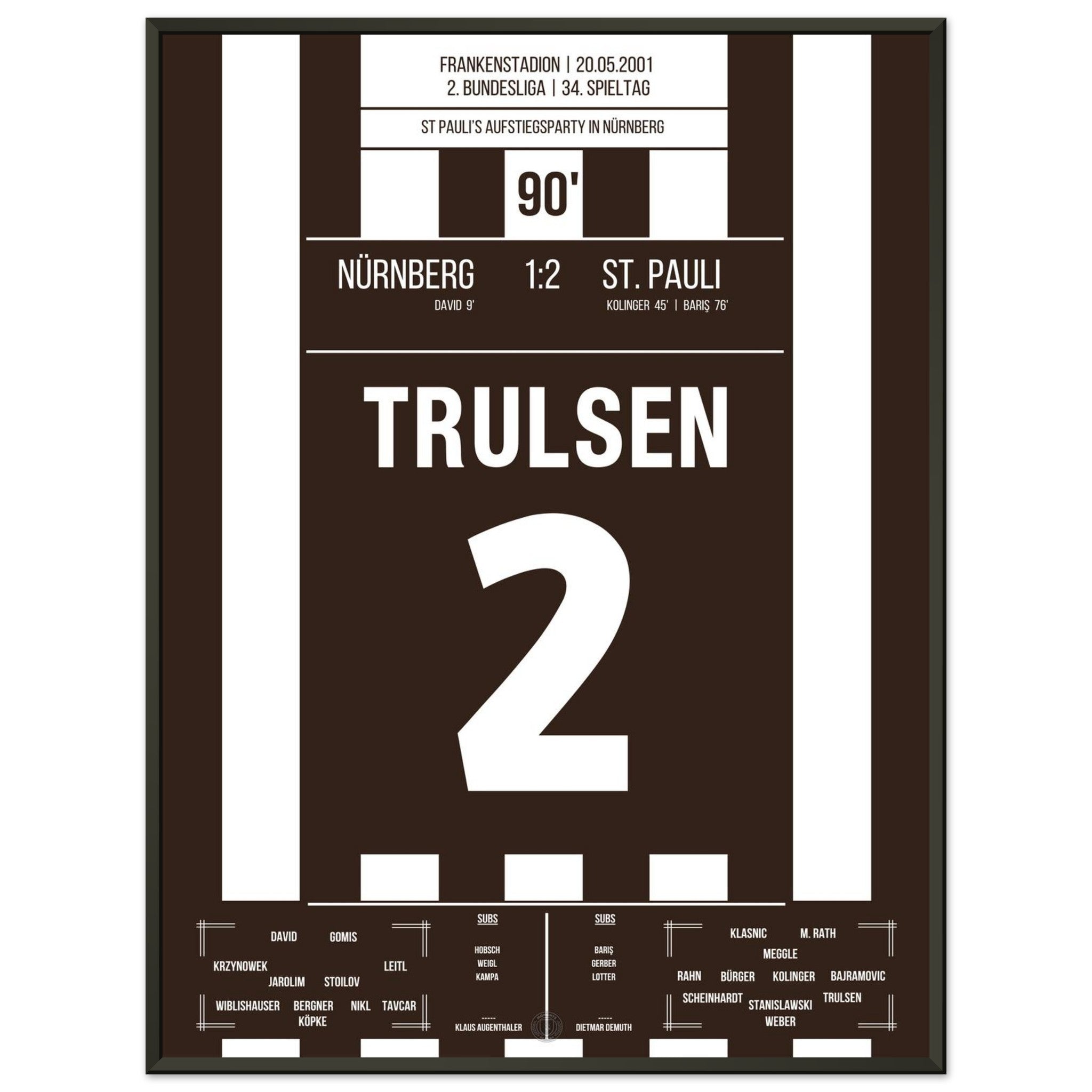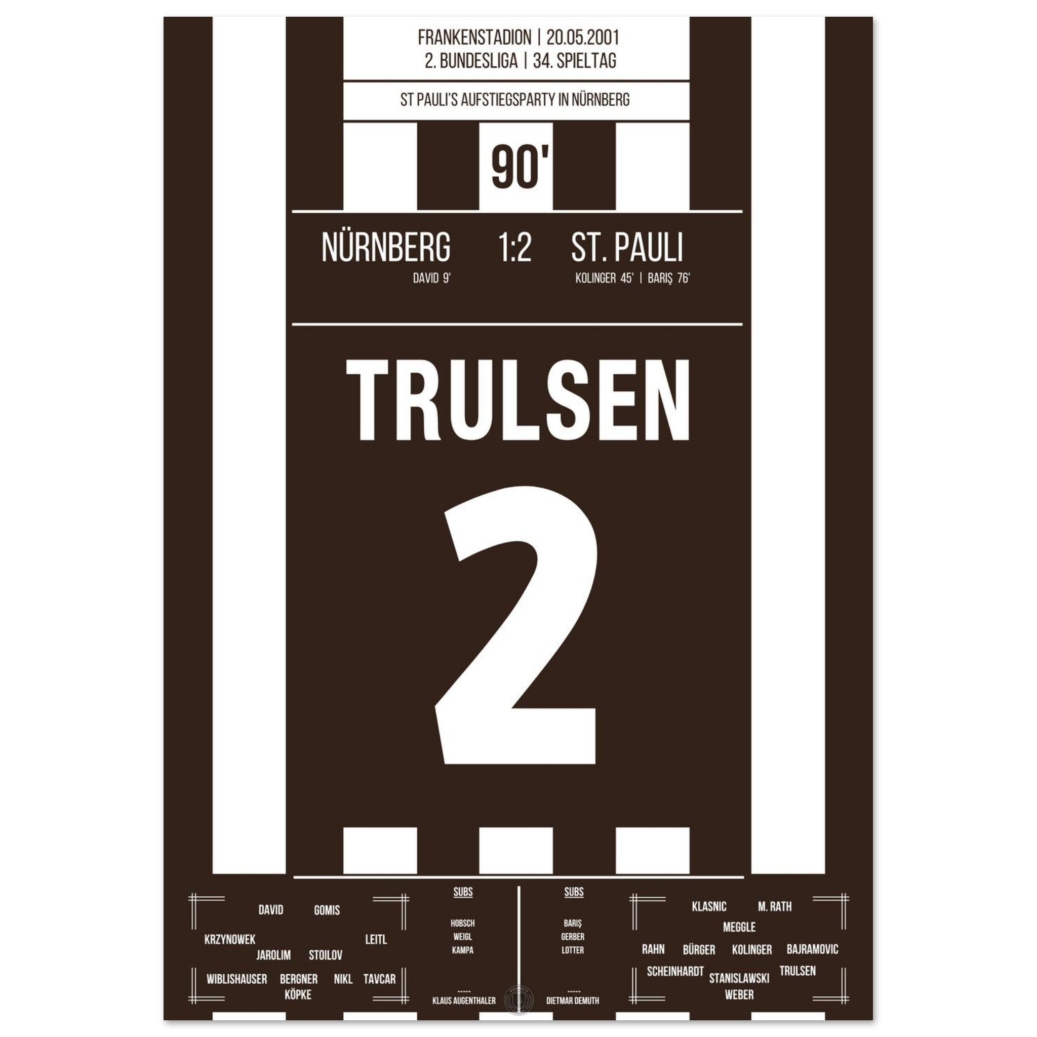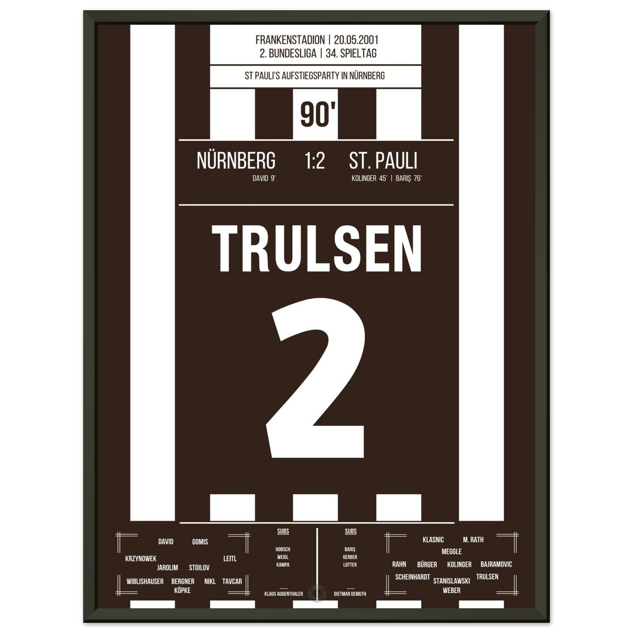 20. Mai 2001 – Nürnberg vs. St. Pauli 1:2: Am letzten Spieltag krönt sich St. Pauli mit einem Auswärtssieg in Nürnberg zum Aufsteiger – Ekstase pur bei den Fans, Rückkehr in die Bundesliga perfekt. Unser Poster hält diesen emotionalen Aufstiegsmoment in Braun-Weiß fest.