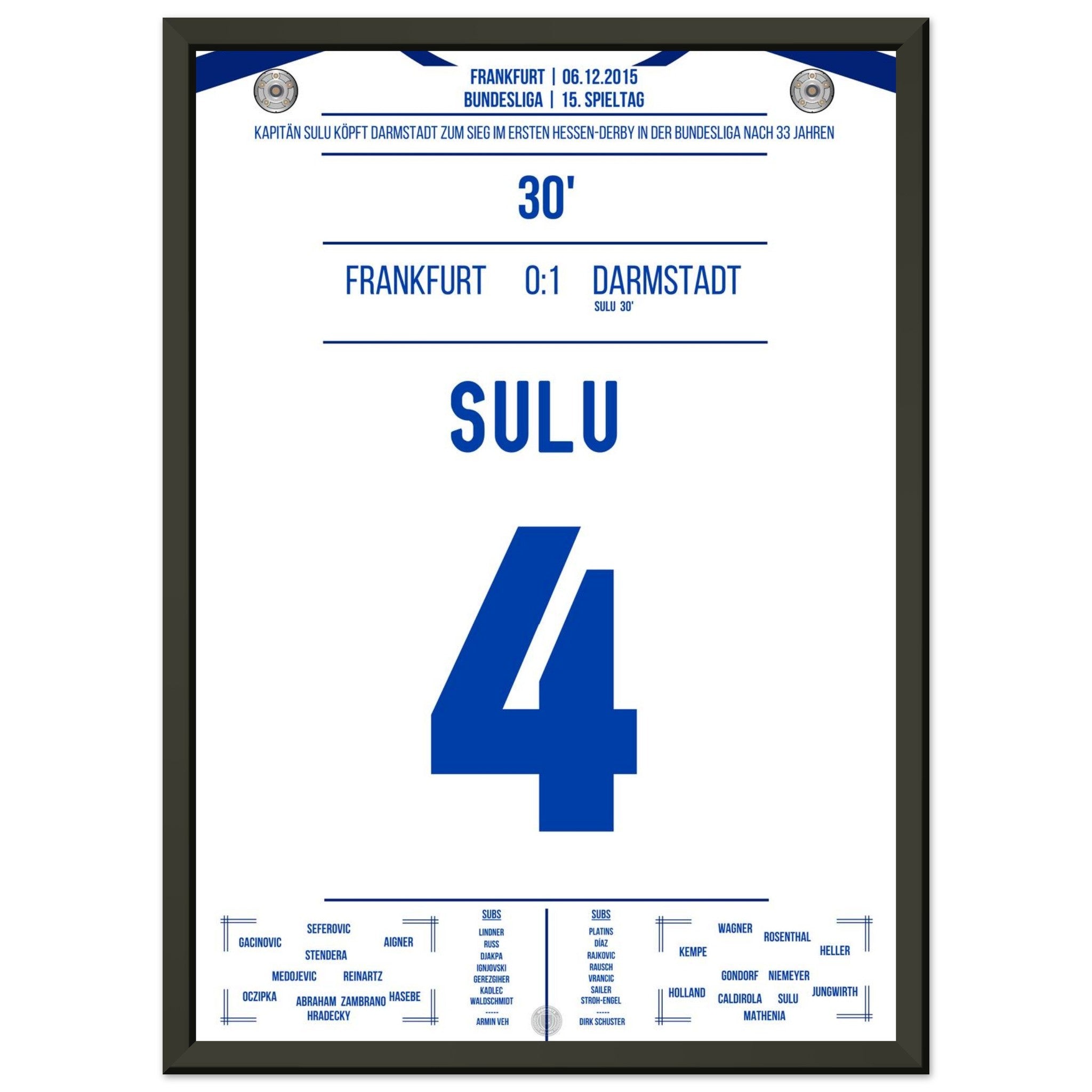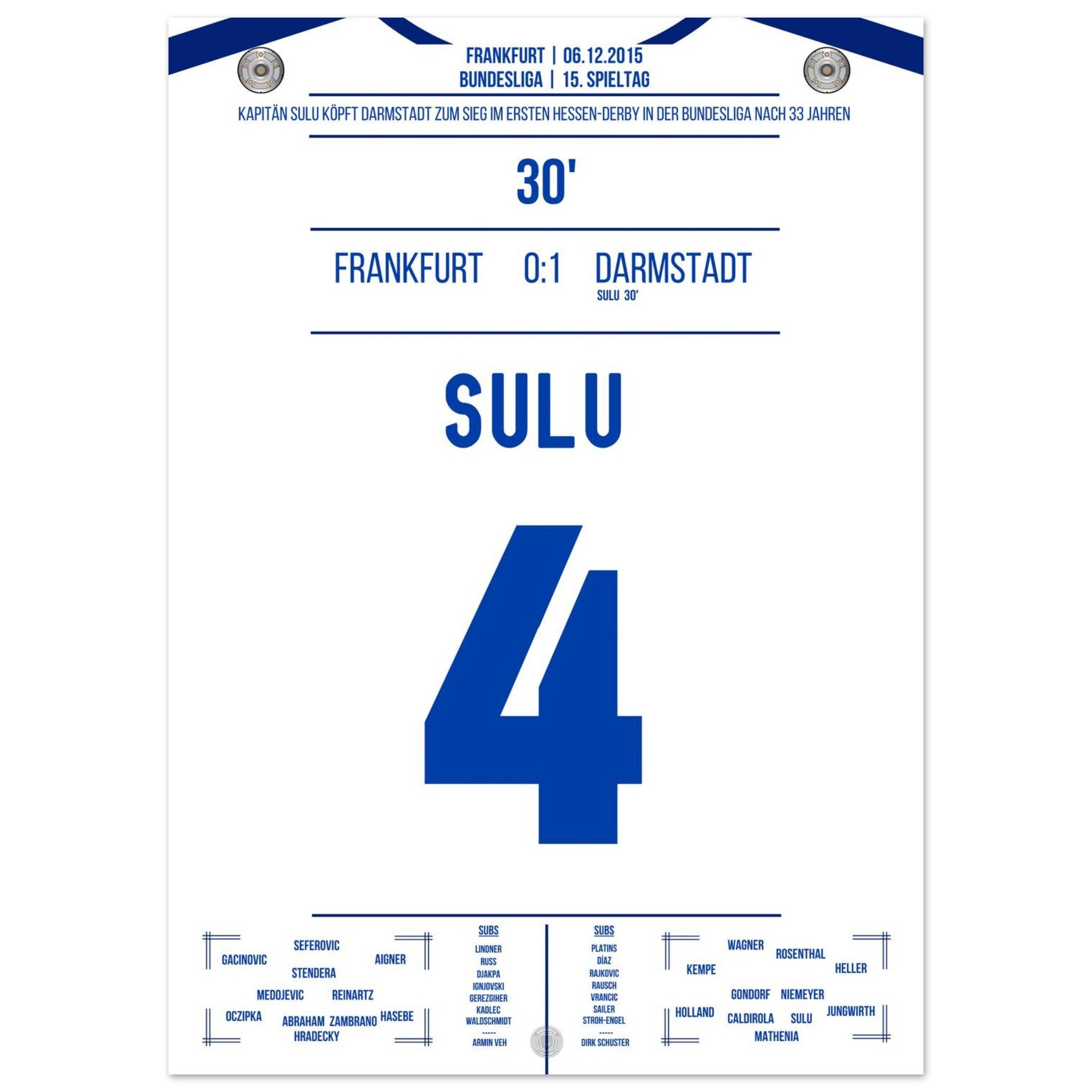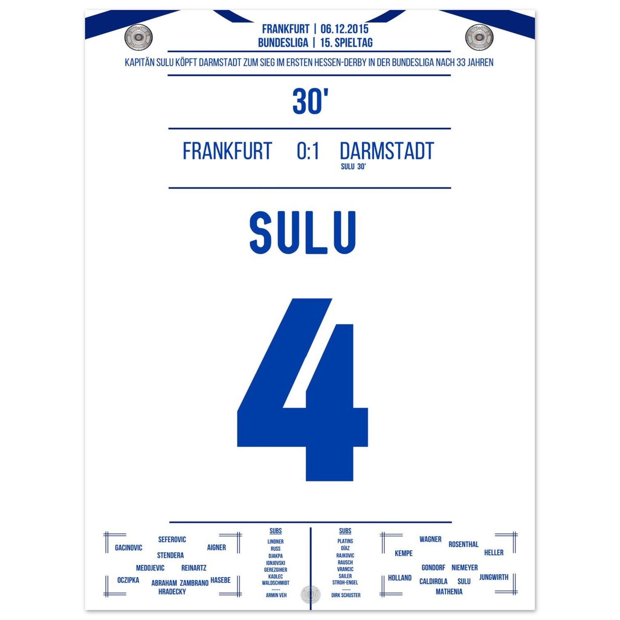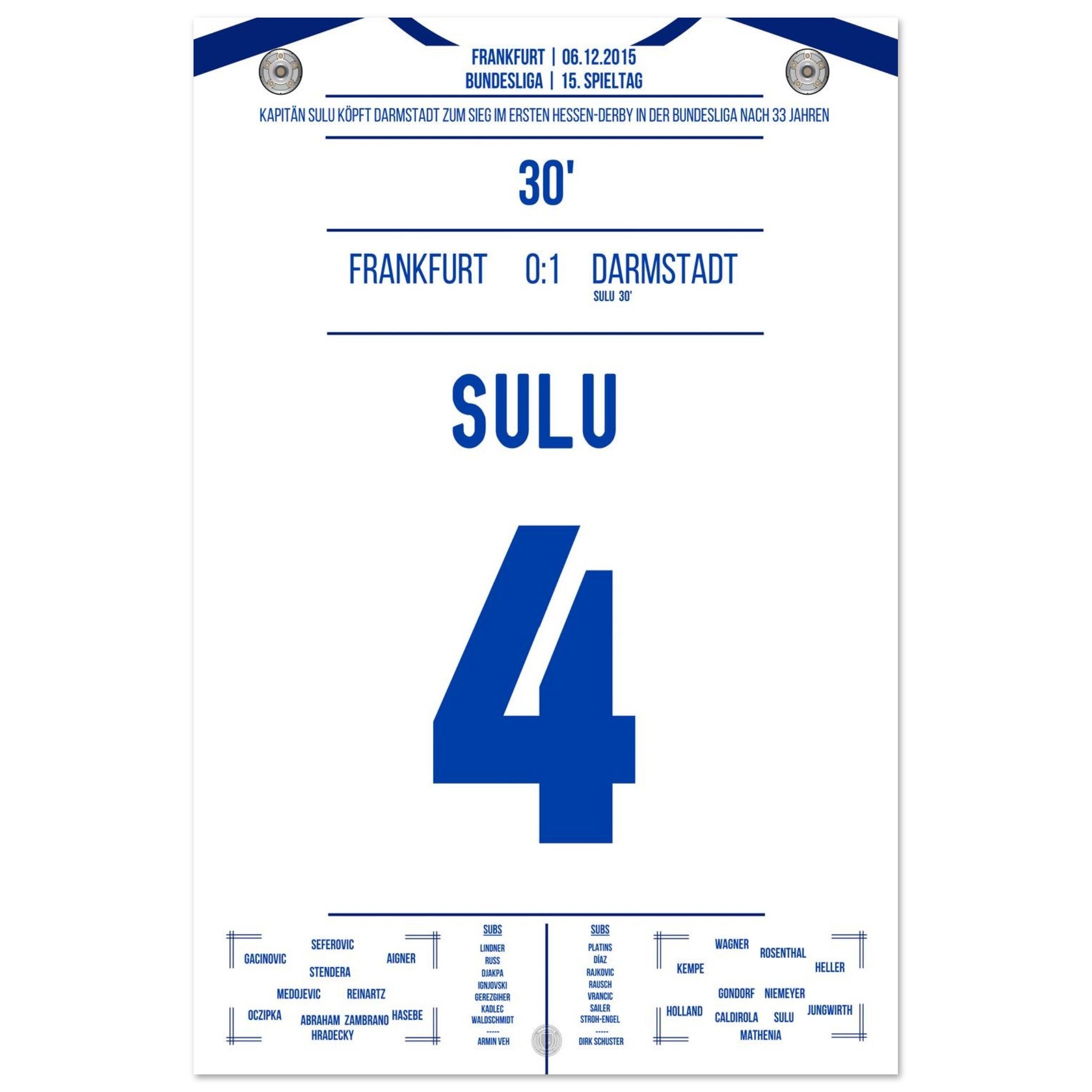 8. November 2015 – Frankfurt vs. Darmstadt - 0:1: Kapitän Aytaç Sulu köpft das Siegtor im hessischen Derby und sichert damit einen historischen Auswärtssieg im Stadtwald. Der erste Lilien-Erfolg in Frankfurt seit über drei Jahrzehnten. Unser Poster bringt diesen besonderen Derby-Moment zu dir nach Hause.