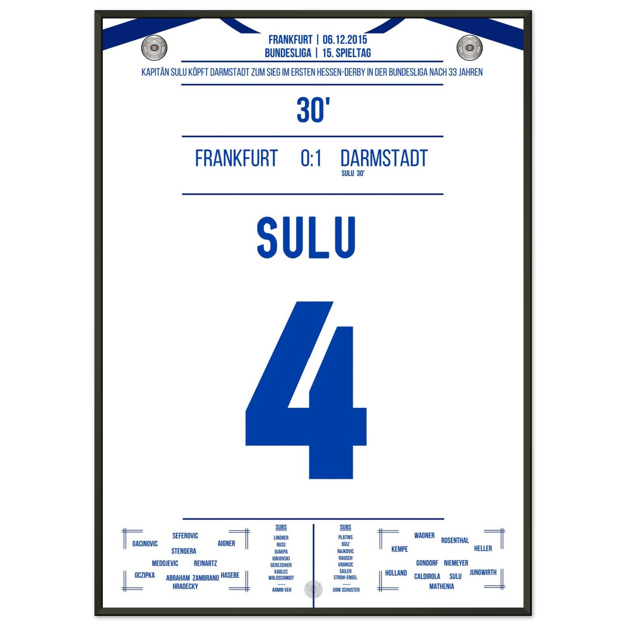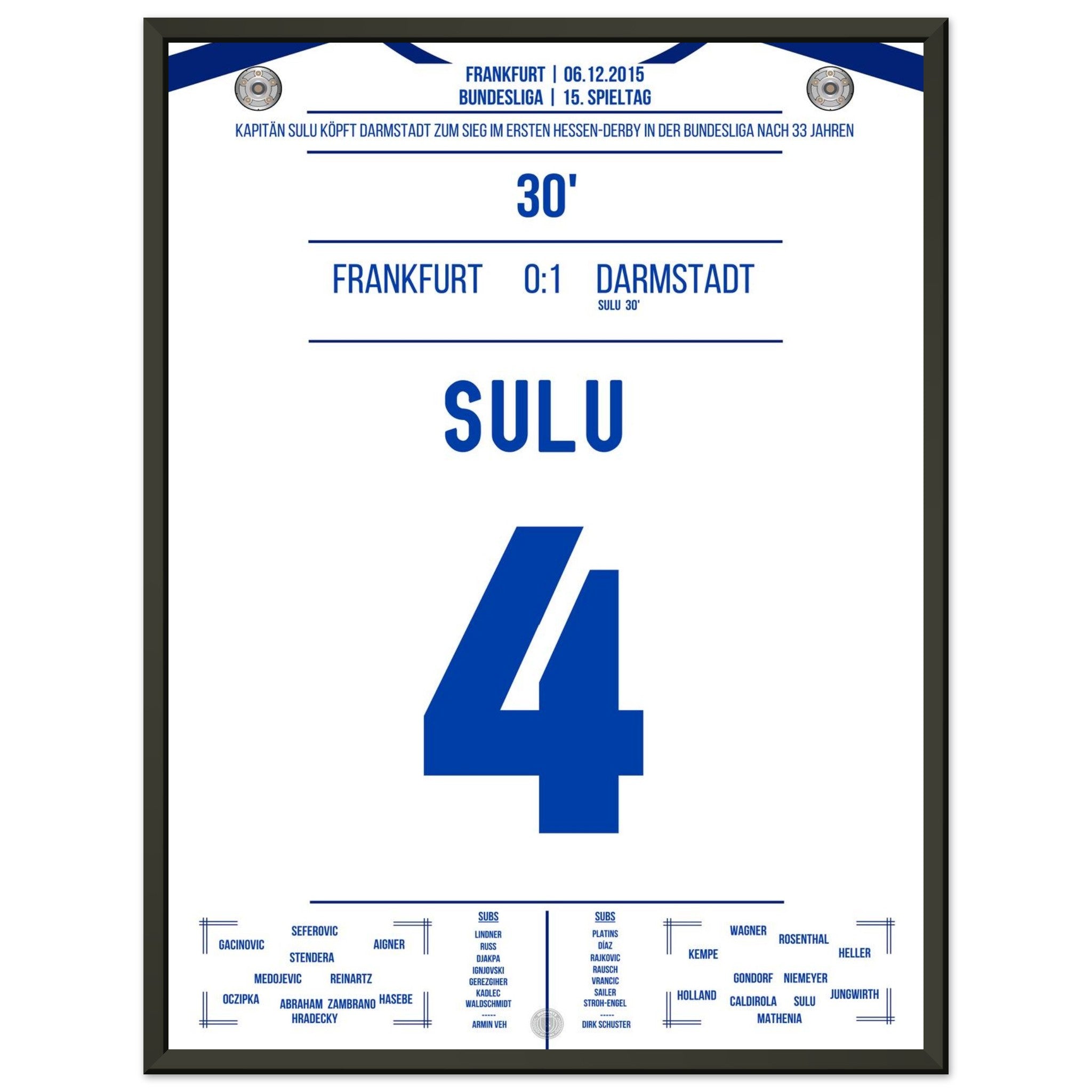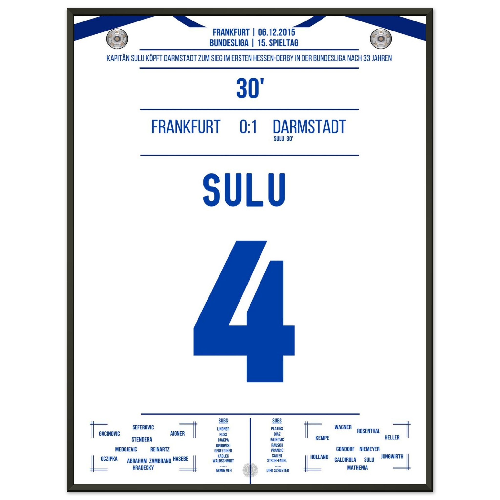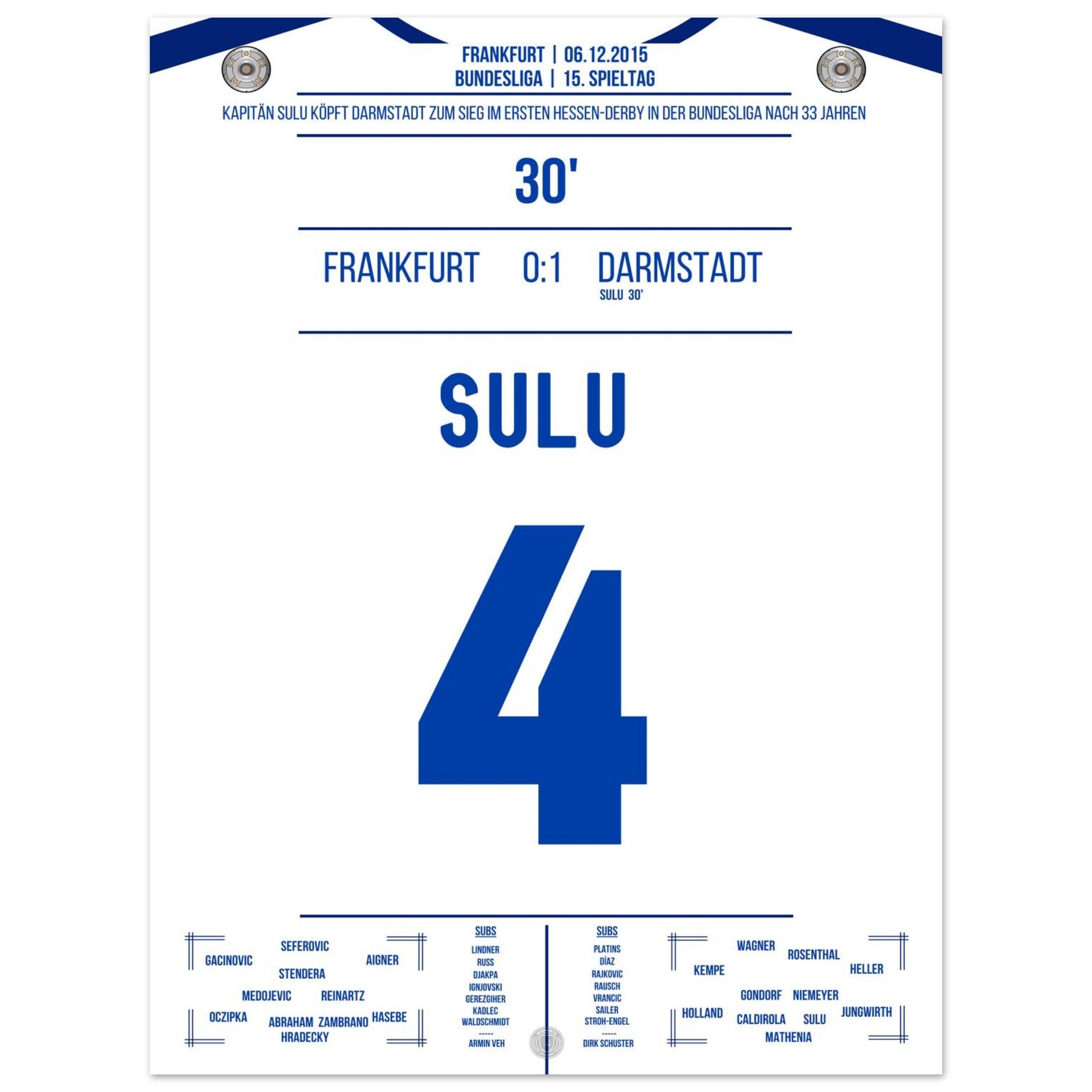 8. November 2015 – Frankfurt vs. Darmstadt - 0:1: Kapitän Aytaç Sulu köpft das Siegtor im hessischen Derby und sichert damit einen historischen Auswärtssieg im Stadtwald. Der erste Lilien-Erfolg in Frankfurt seit über drei Jahrzehnten. Unser Poster bringt diesen besonderen Derby-Moment zu dir nach Hause.