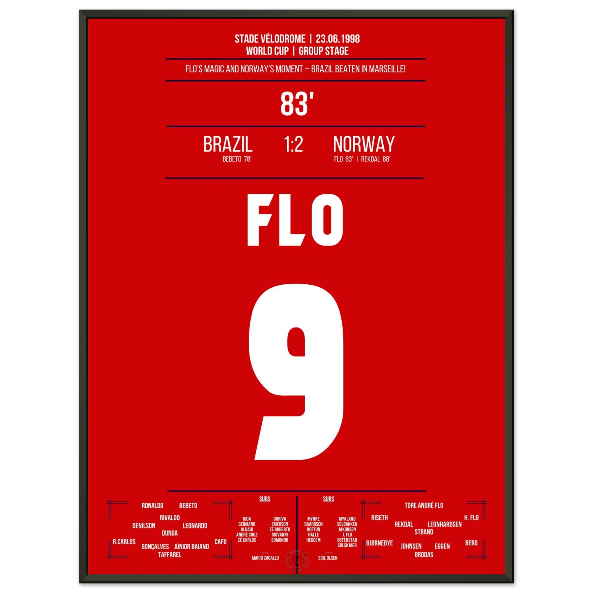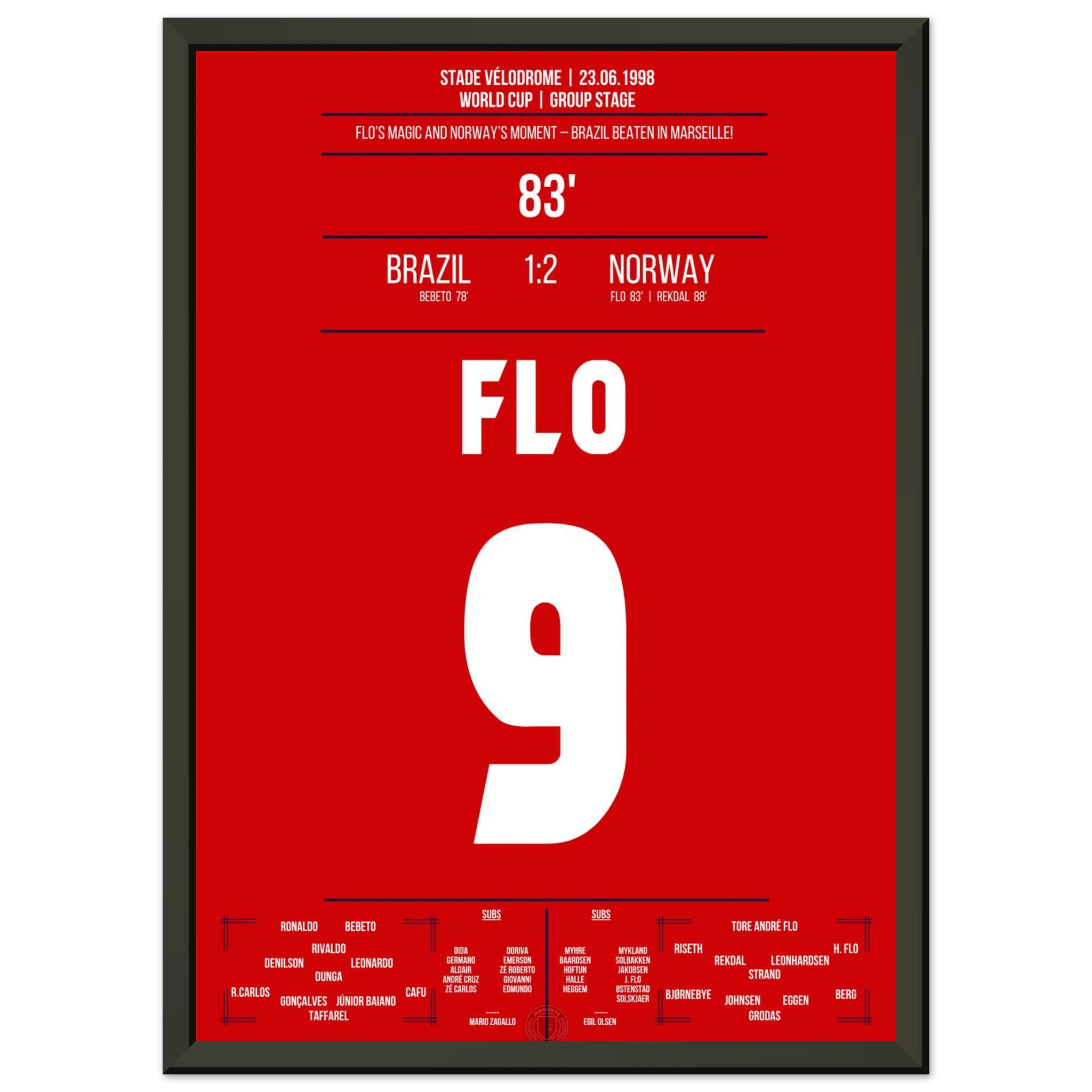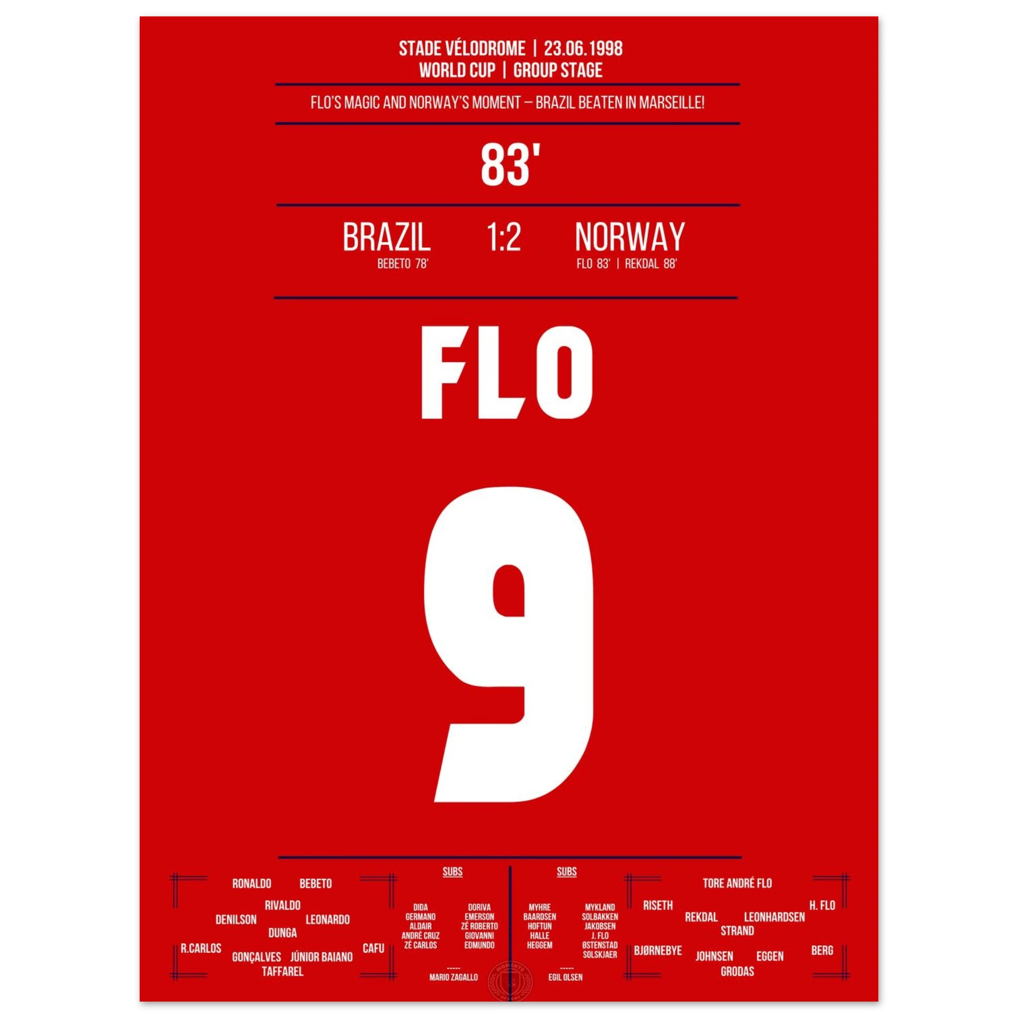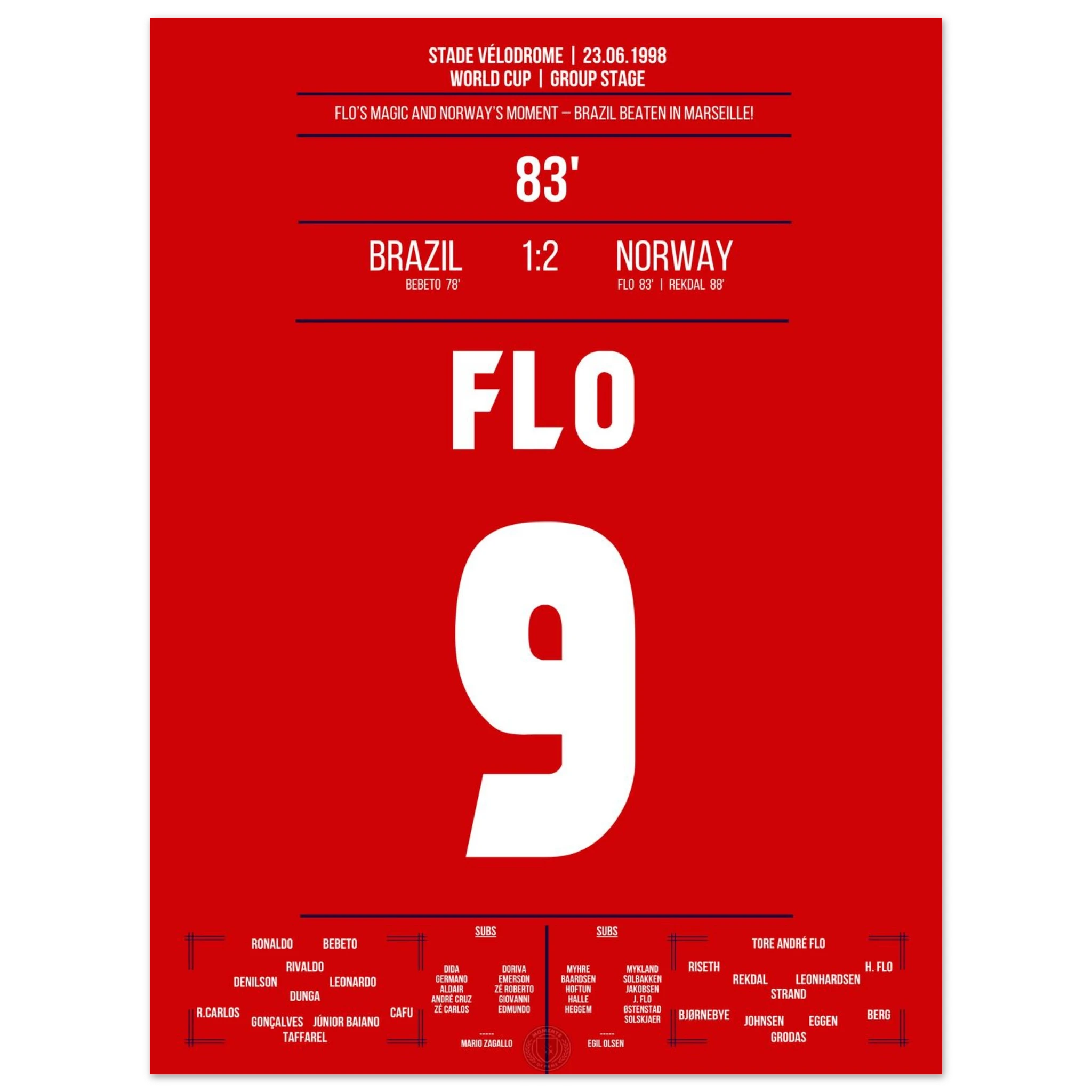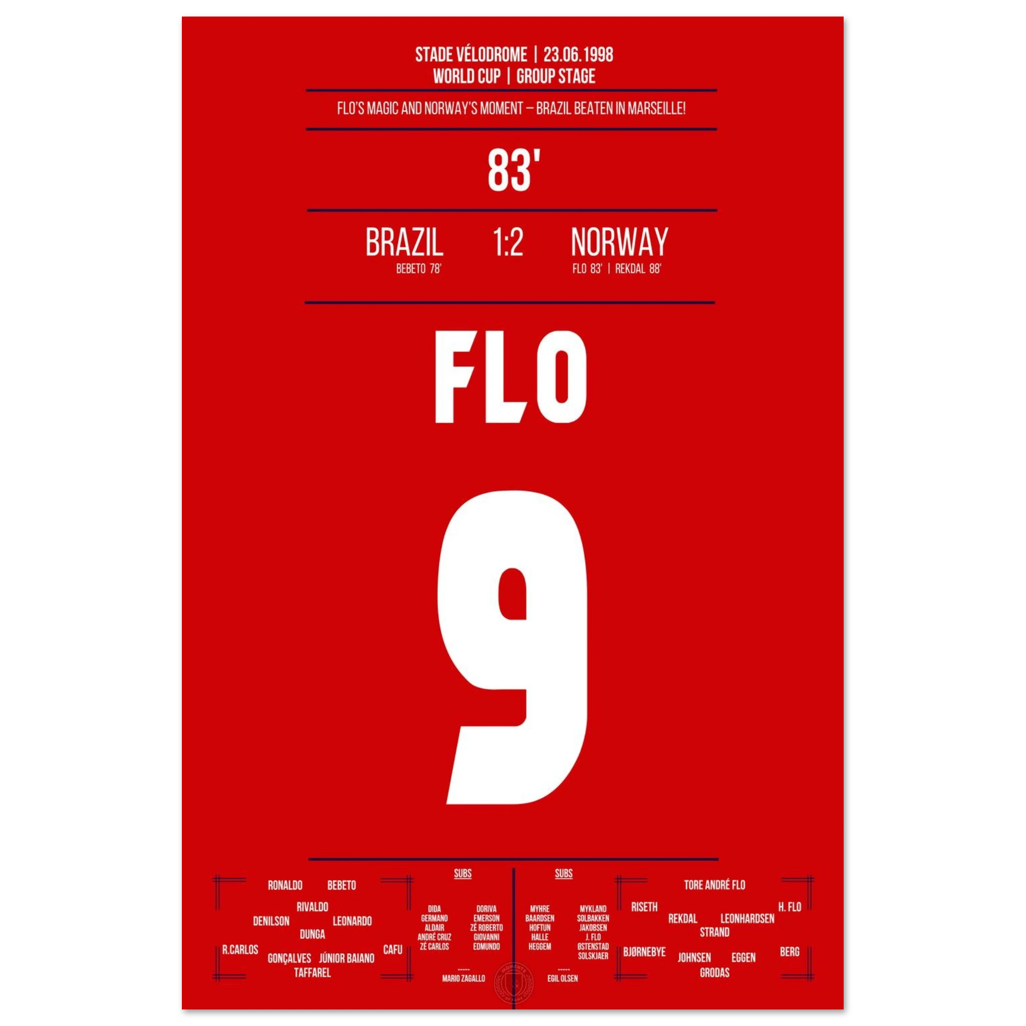 Eine der größten Überraschungen der WM-Geschichte! Norwegen dreht das Spiel gegen den amtierenden Weltmeister Brasilien in den letzten Minuten. Tore von Tore André Flo und Rekdal per Elfmeter bescheren den Nordmännern den historischen Sieg – ihr erstes Weiterkommen bei einer Weltmeisterschaft.