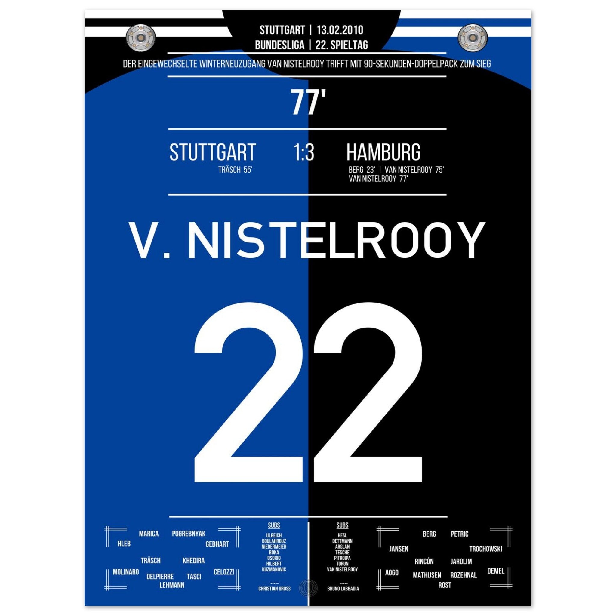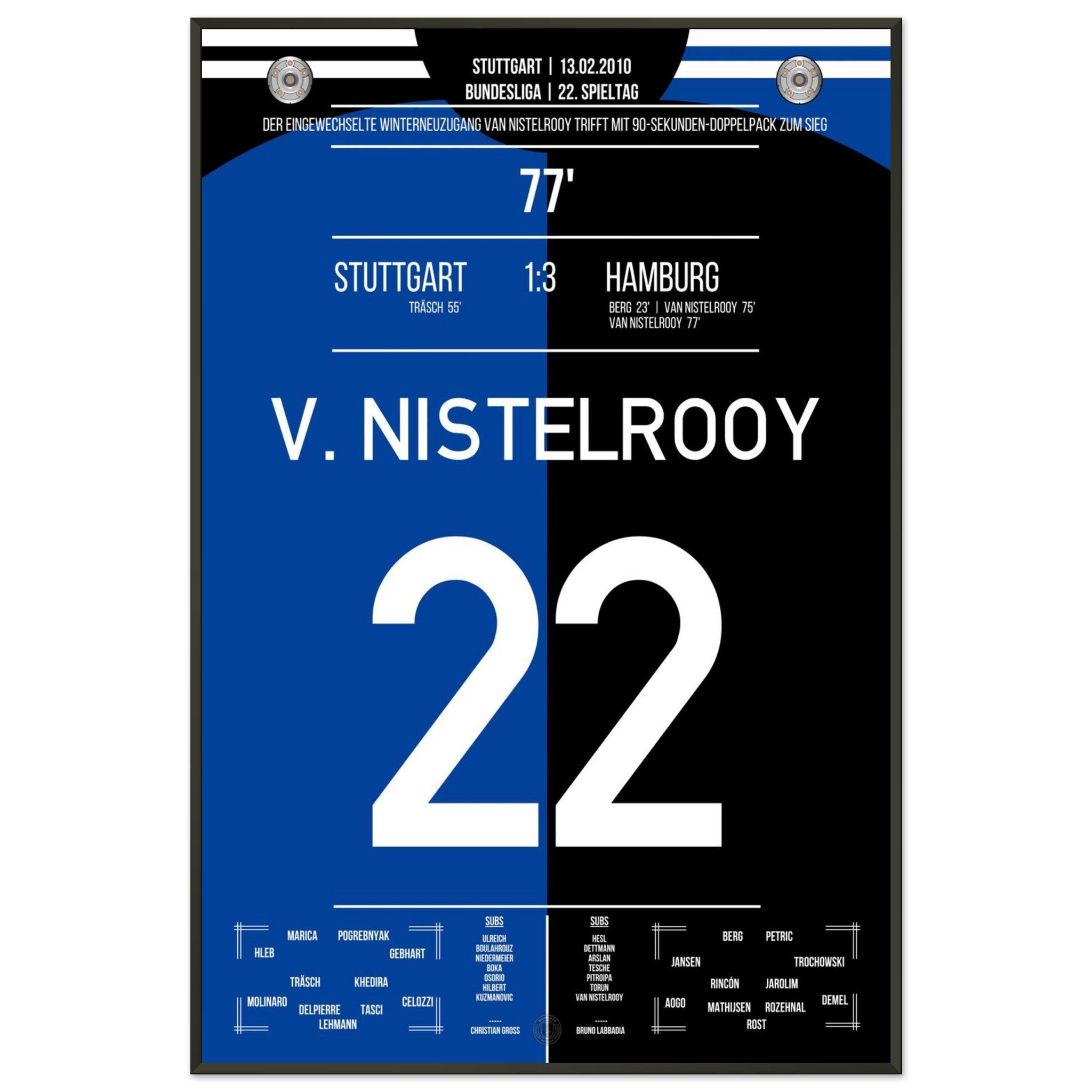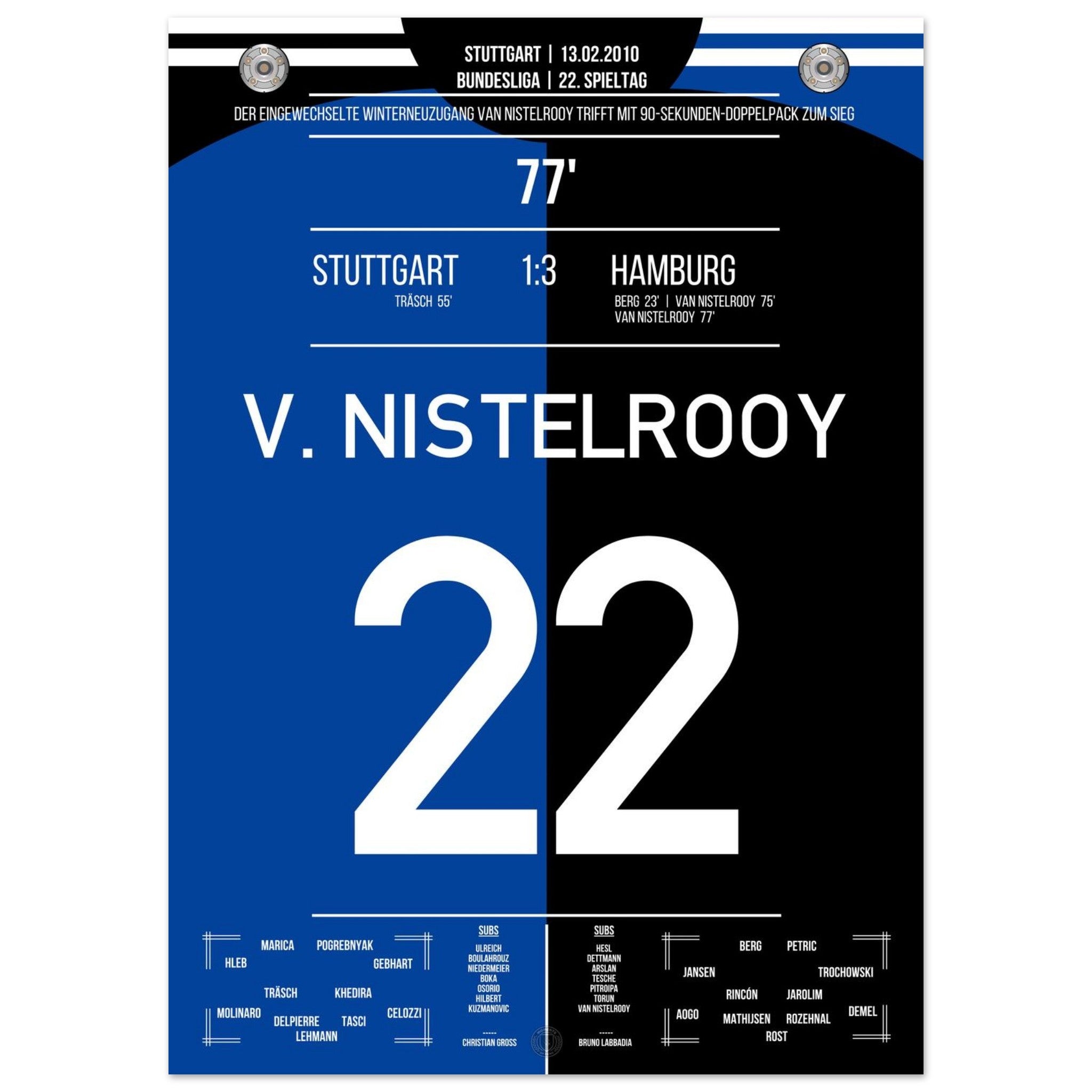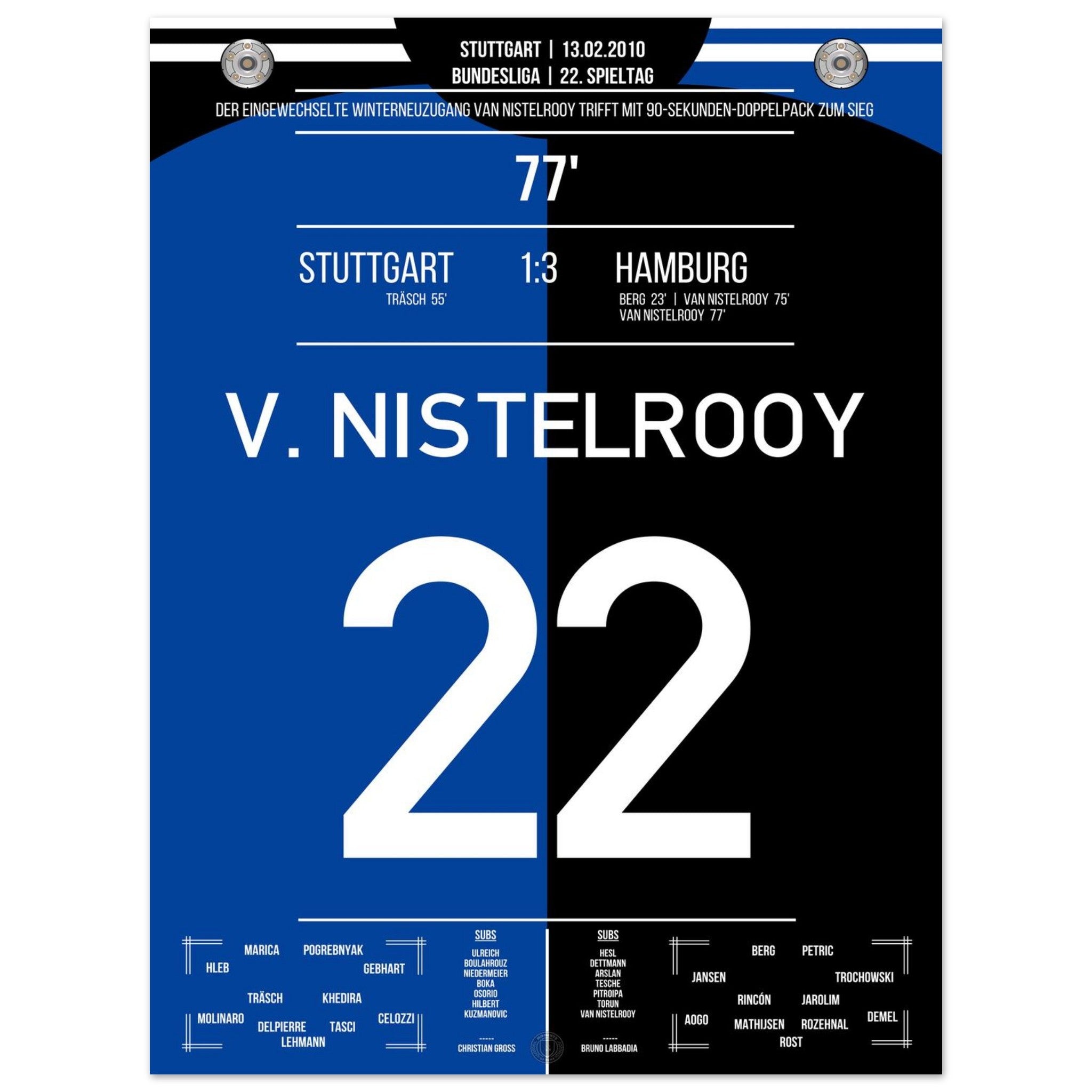 13. Februar 2010 – Stuttgart vs. Hamburg 1:3: Ruud van Nistelrooy feiert ein Traumeinstand im Hamburg-Trikot: Nur Minuten nach seiner Einwechslung trifft der Weltstar doppelt und lässt die Hamburger Fans von großen Tagen träumen. Unser Poster fängt dieses legendäre Debüt für die Ewigkeit ein.