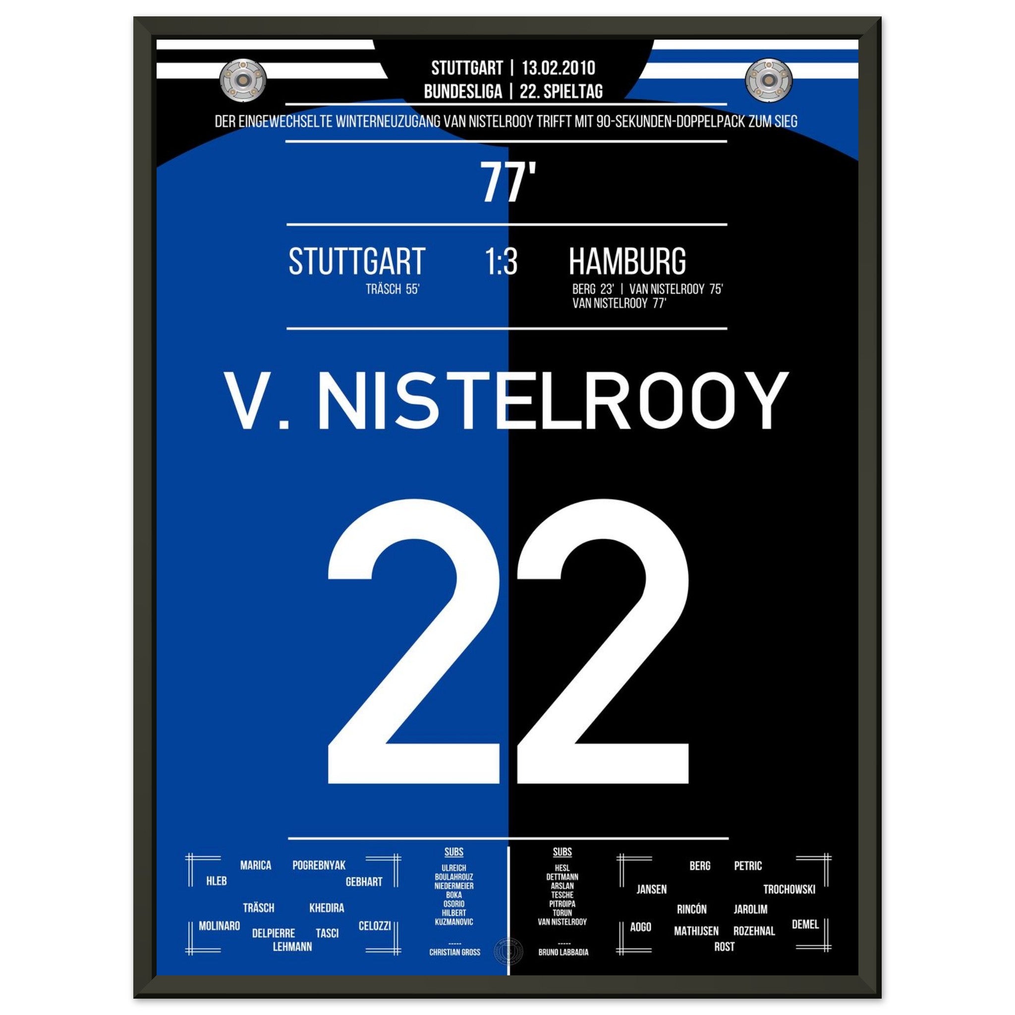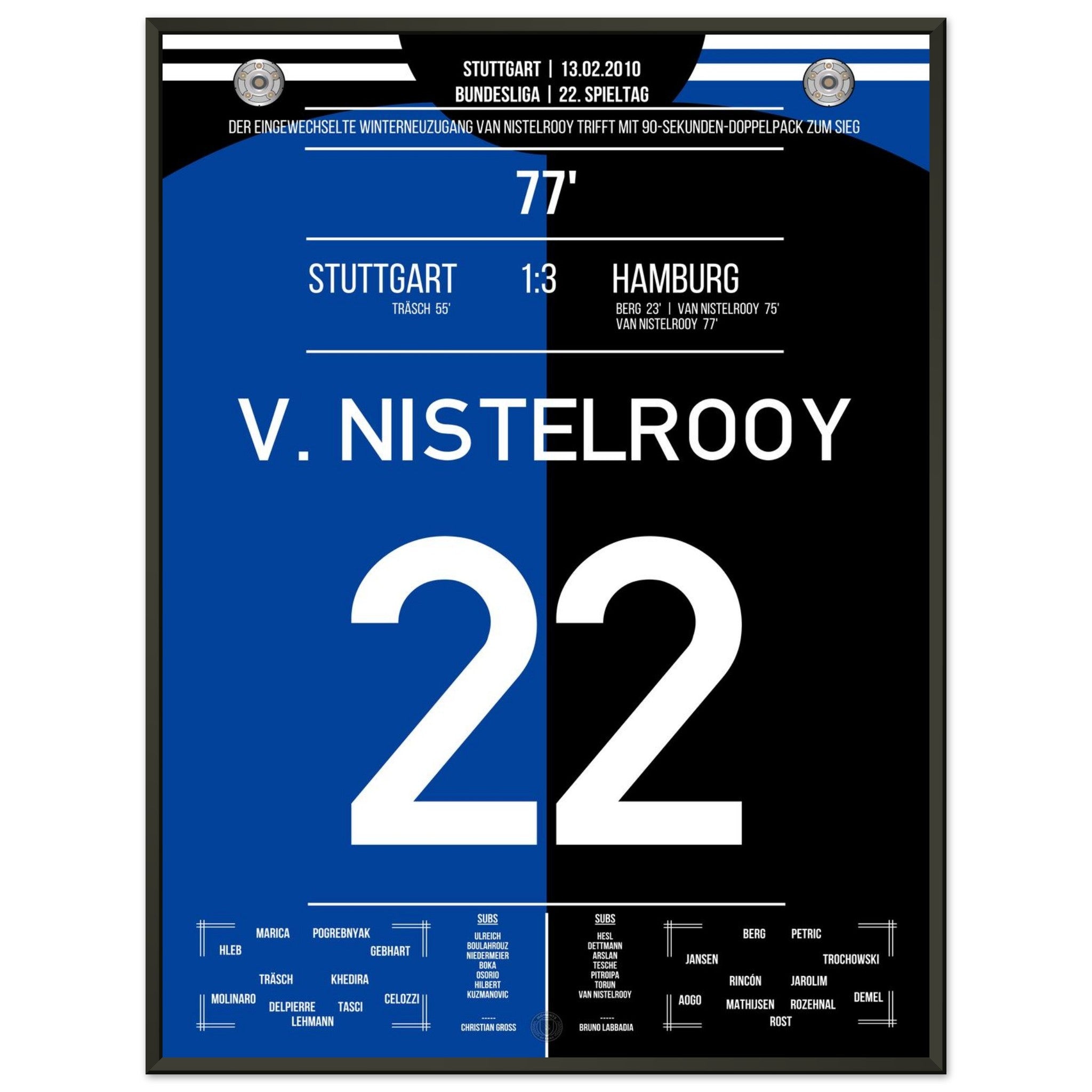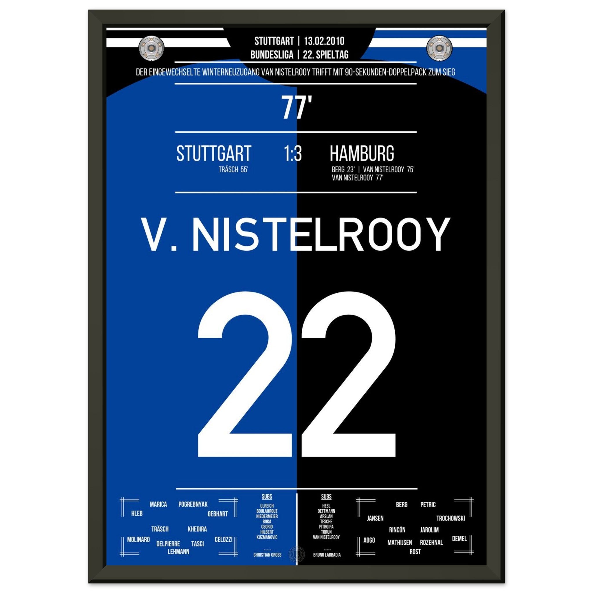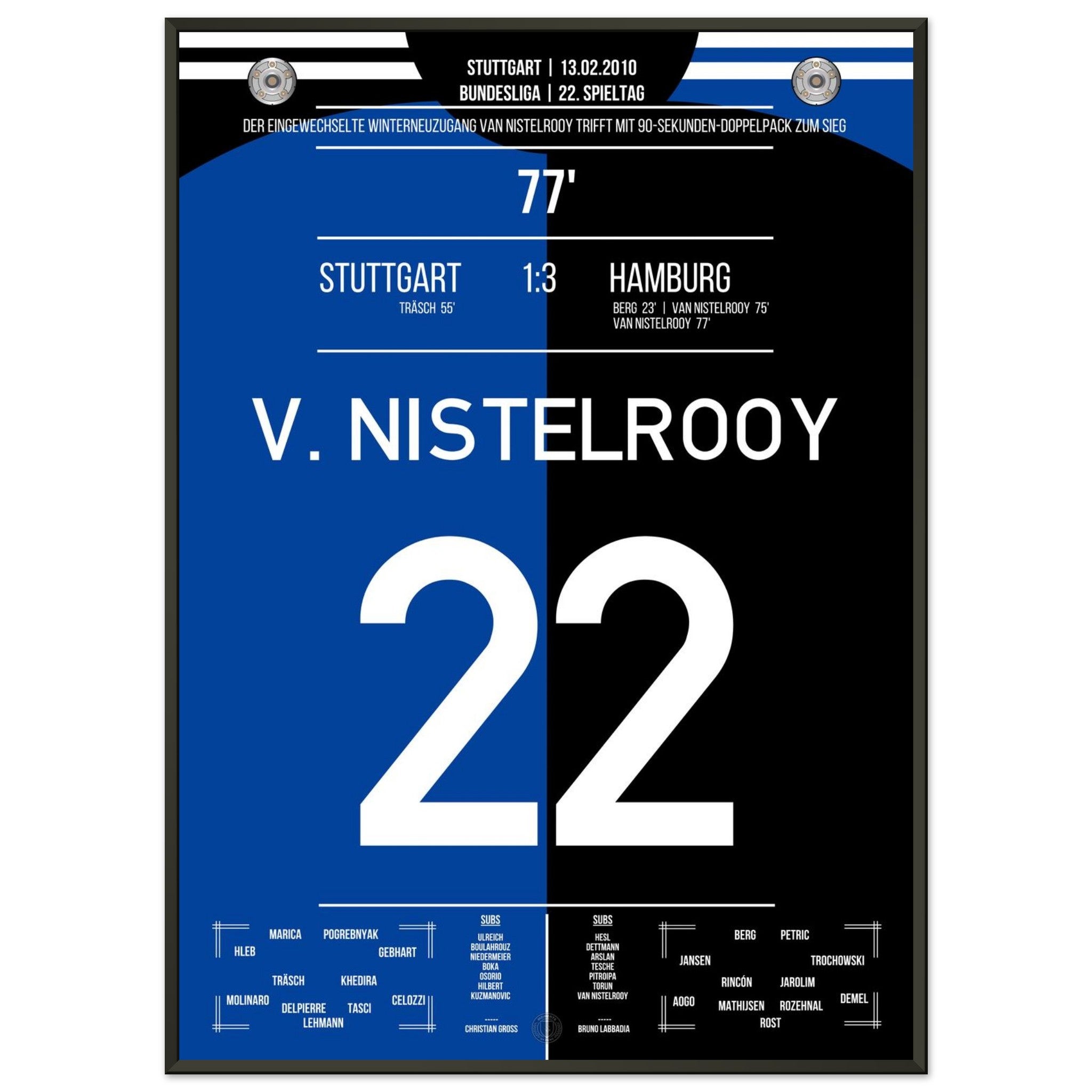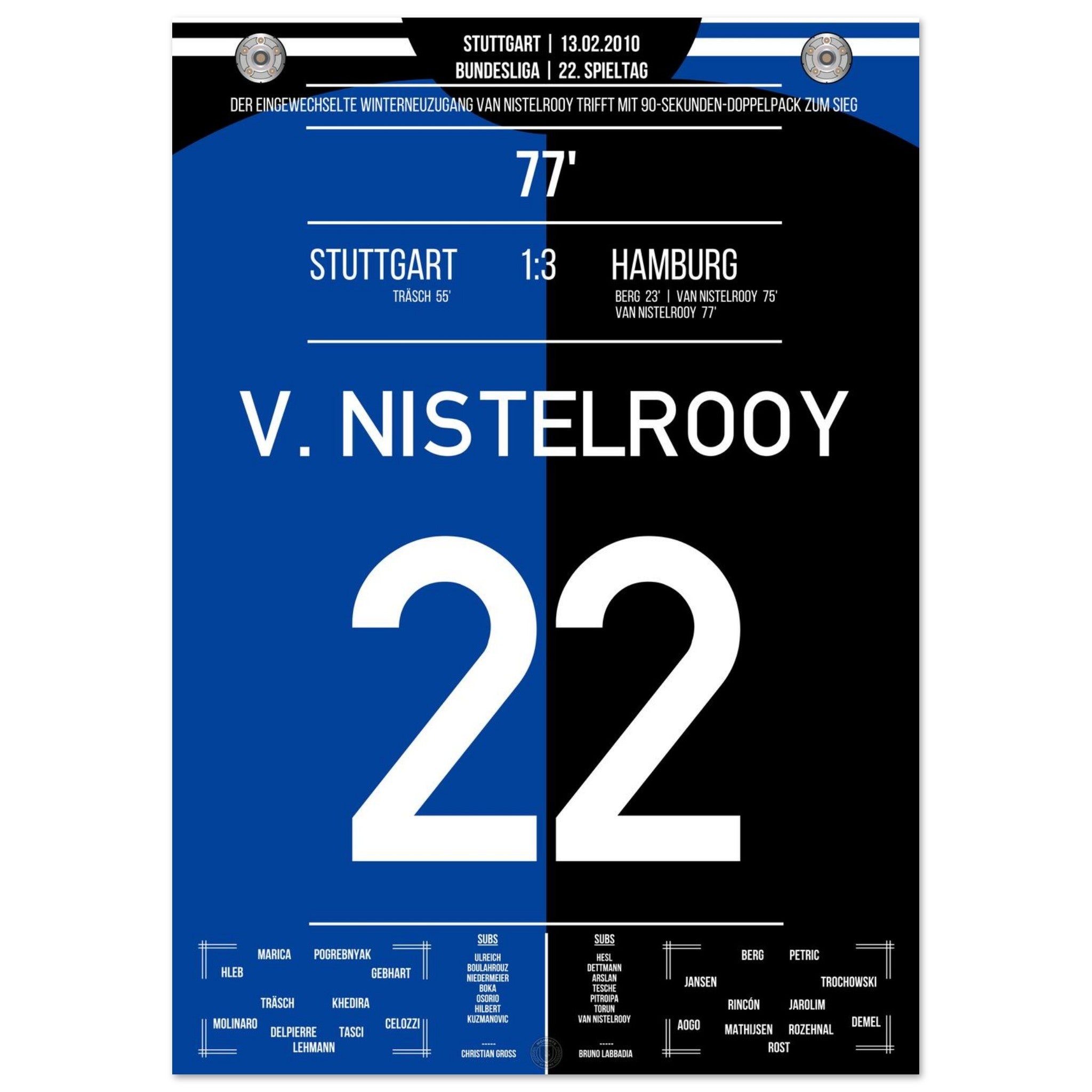 13. Februar 2010 – Stuttgart vs. Hamburg 1:3: Ruud van Nistelrooy feiert ein Traumeinstand im Hamburg-Trikot: Nur Minuten nach seiner Einwechslung trifft der Weltstar doppelt und lässt die Hamburger Fans von großen Tagen träumen. Unser Poster fängt dieses legendäre Debüt für die Ewigkeit ein.