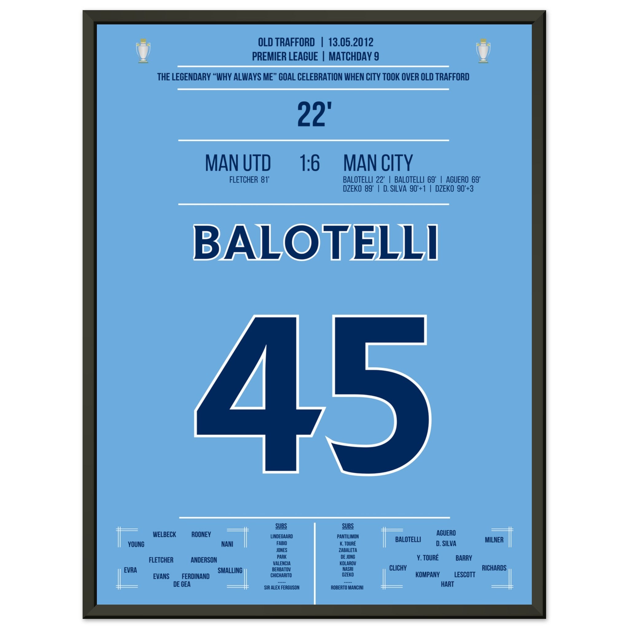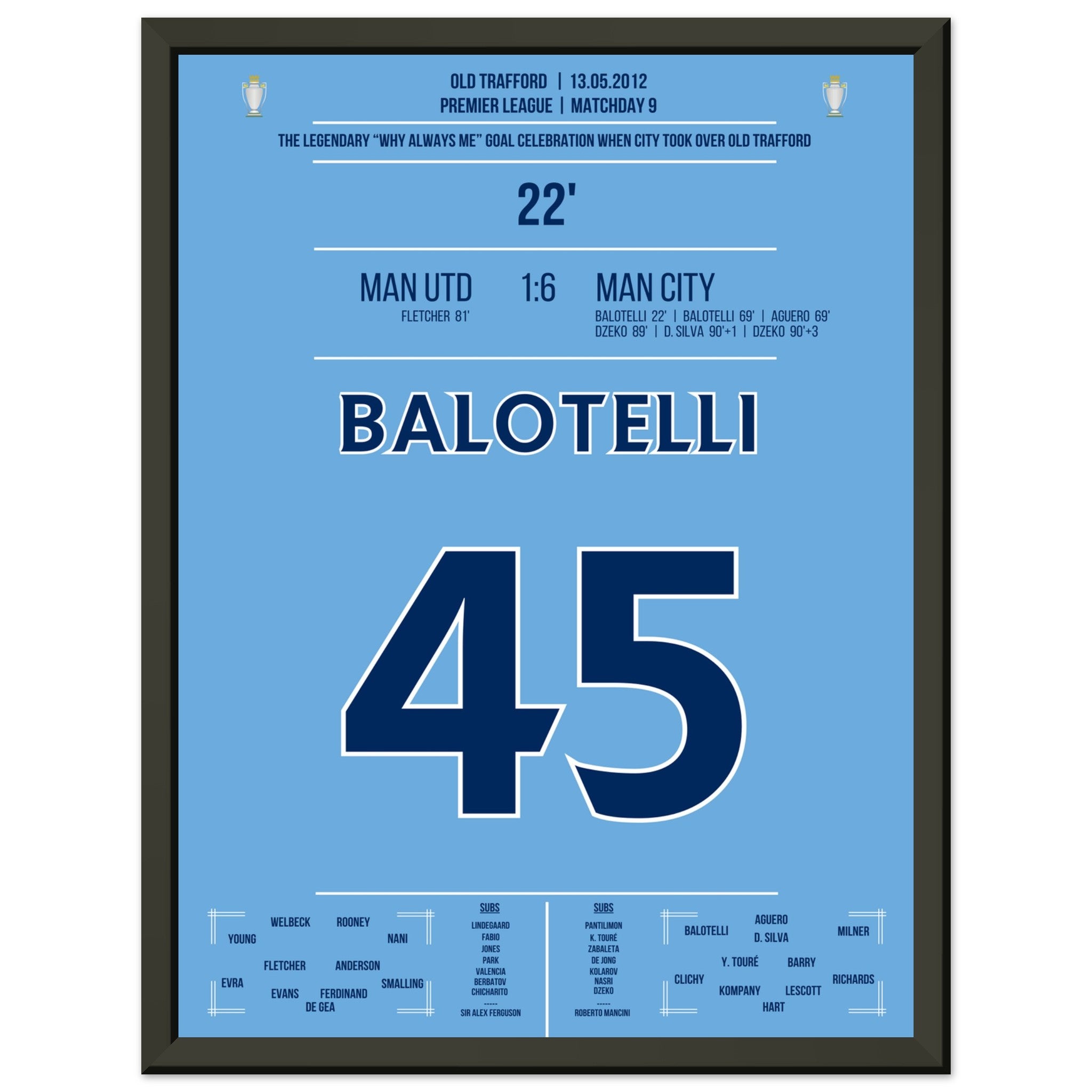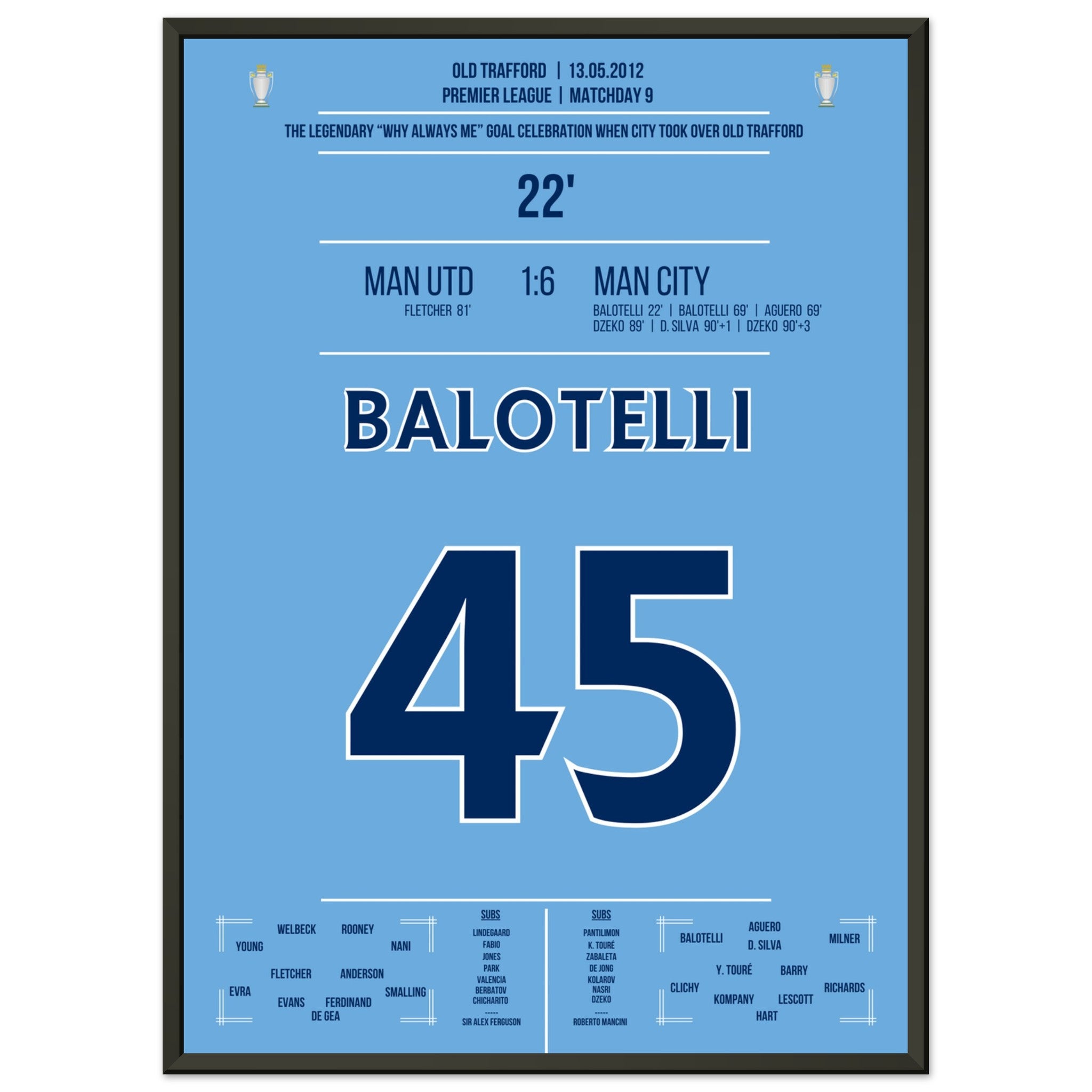 Sie können sicher sein, dass jedes Poster und jeder Rahmen in einer robusten Verpackung versandt wird, damit es in tadellosem Zustand ankommt. Es ist die perfekte Ergänzung für die Sammlung eines jeden Fußballfans oder das perfekte Geschenk für den eingefleischten Fußball-Fan ihres Freundes- oder Familienkreises.